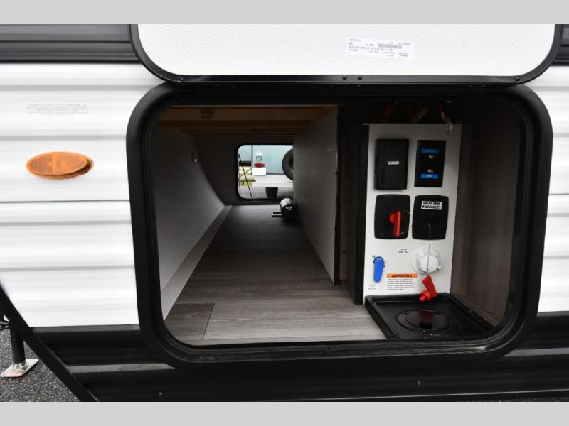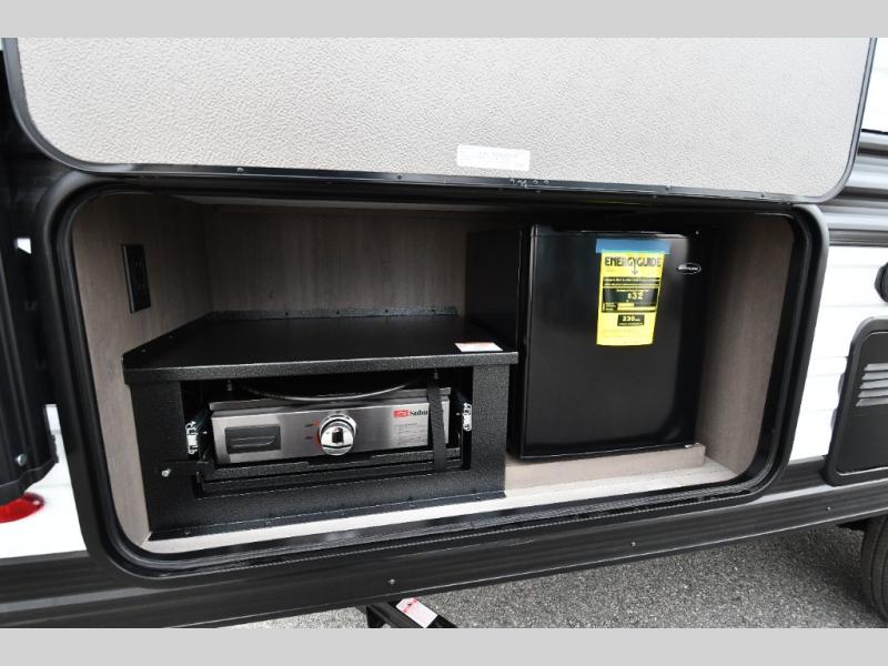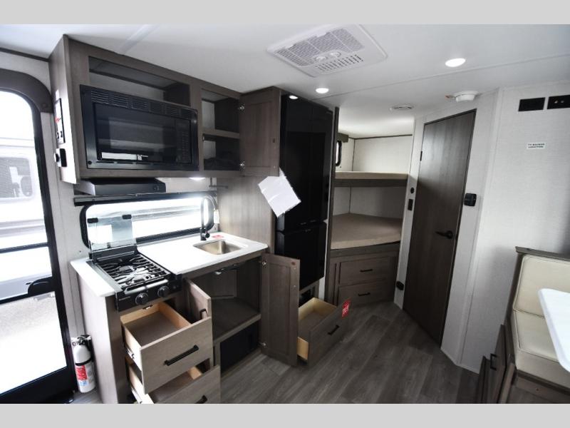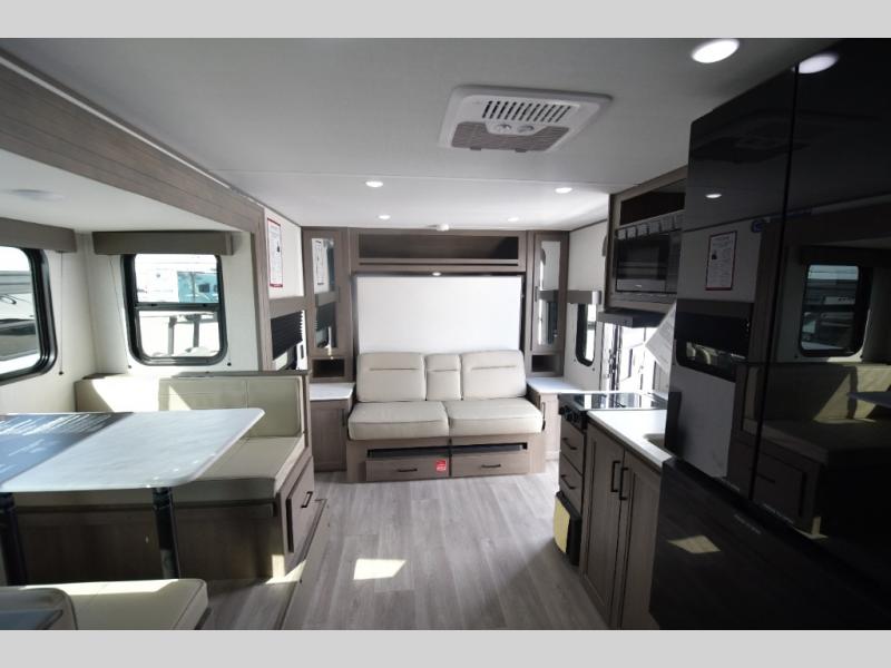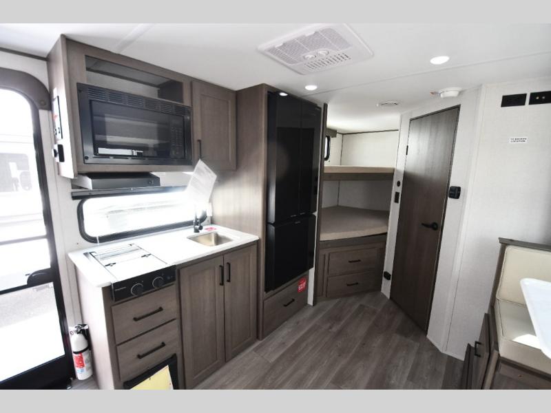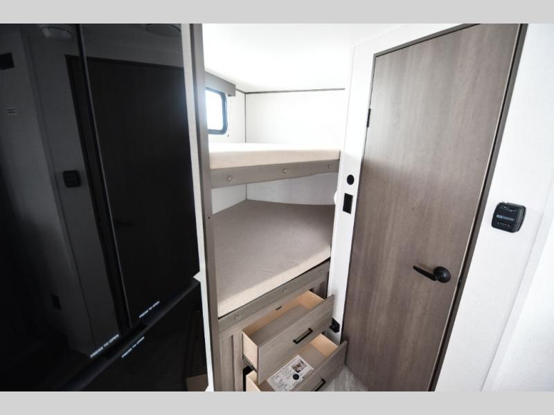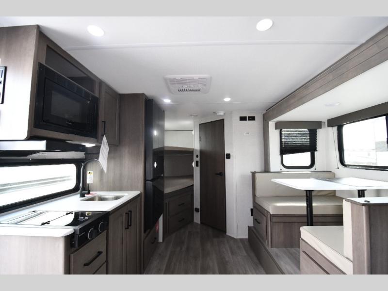 The 161BH Transcend One travel trailer offers versatile comfort in a lightweight, easy-to-tow package. A front Murphy bed with storage on both sides keeps your sleeping area tidy, while double-size bunks give kids or guests a cozy retreat. The full bath is conveniently located near the bunks for easy nighttime access. Cook indoors on the two-burner range or outside on the exterior griddle and refrigerator. Dine at the booth dinette slide, relax under the 16' power awning, and store larger gear in the unobstructed pass-thru storage—everything you need for memorable adventures is right at your fingertips.