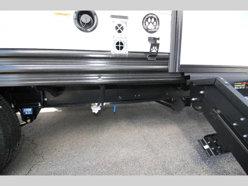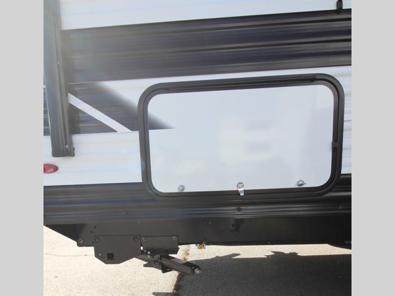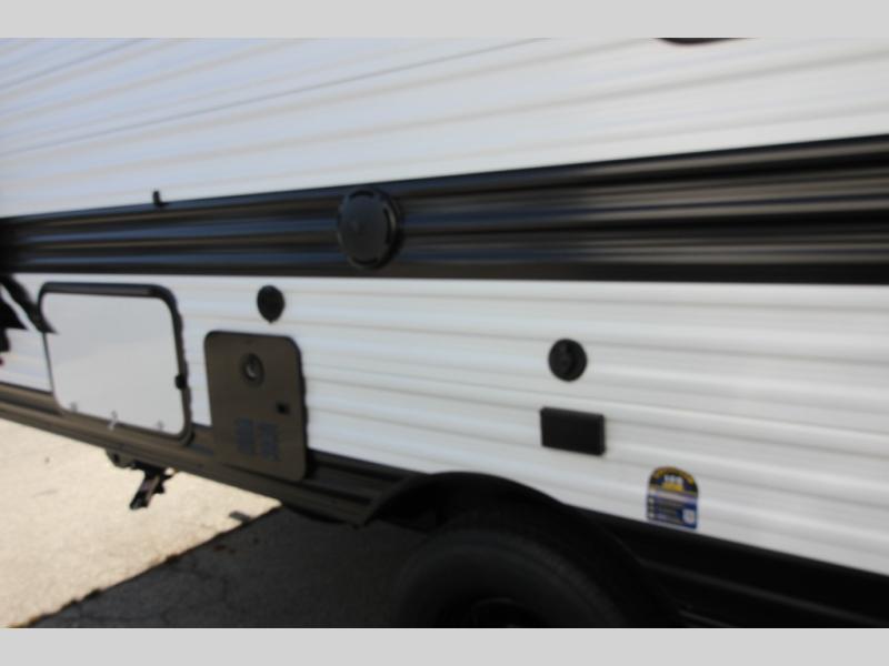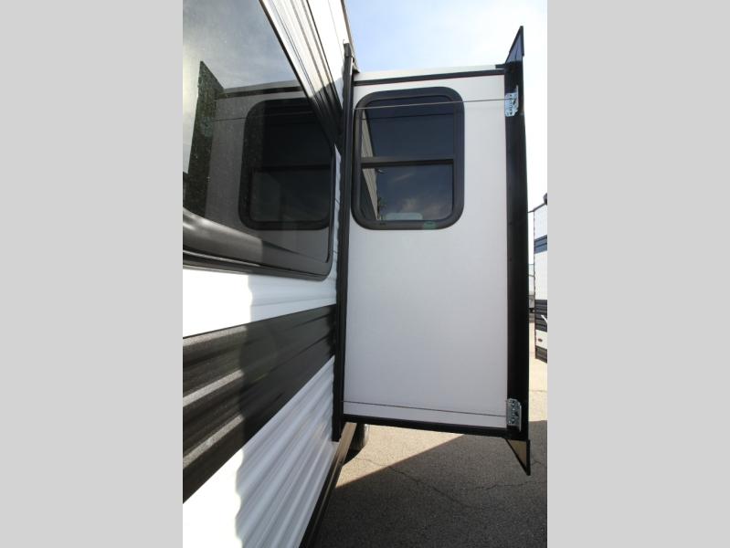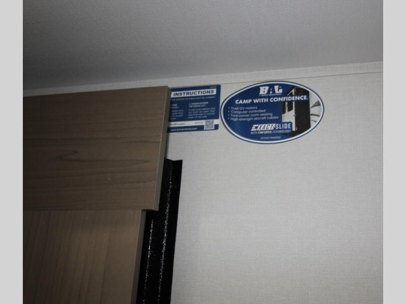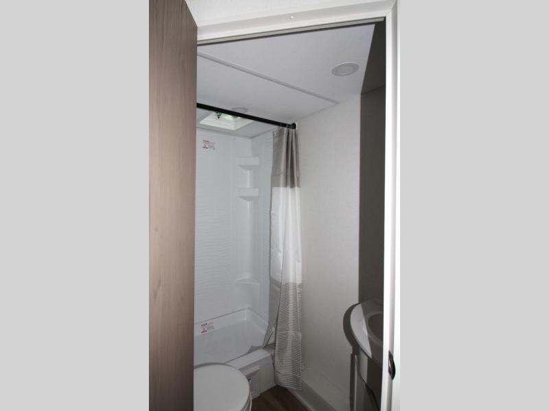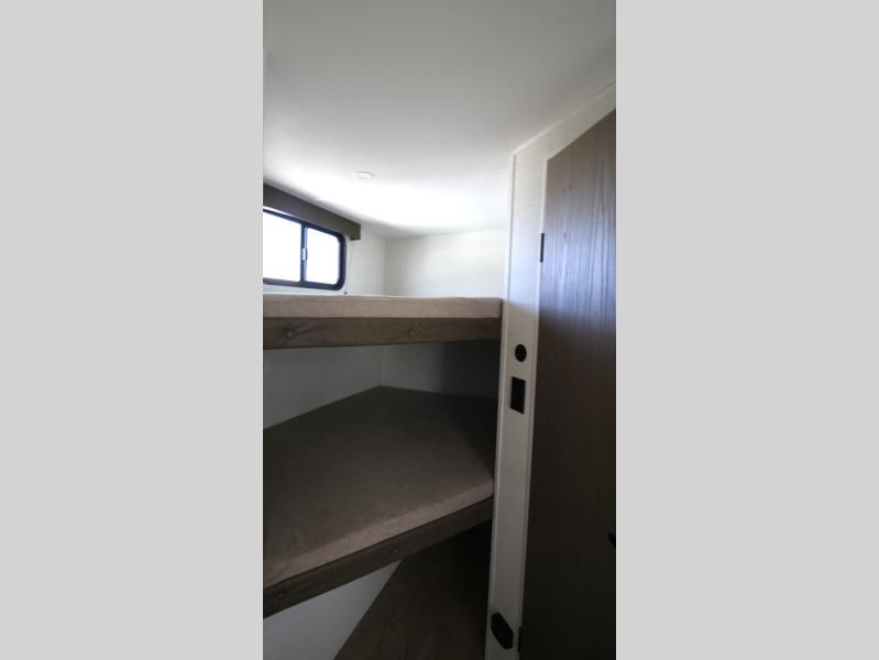 Kids or guests will love the double-size bunk beds, each with privacy curtains, located next to the full bathroom for easy access—especially at night. The booth dinette slide offers a comfortable place to dine or relax, and it opens up the interior for a spacious feel.