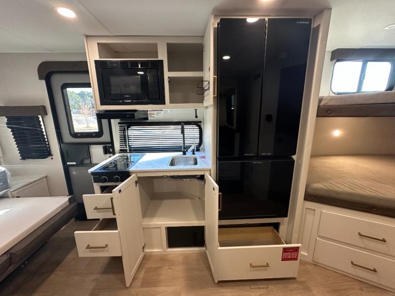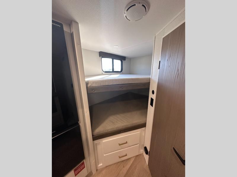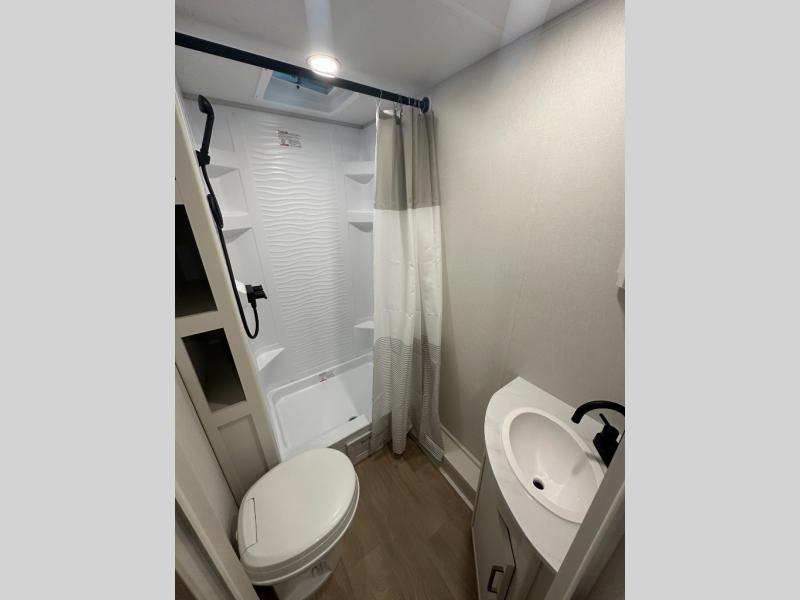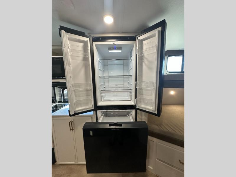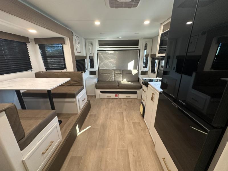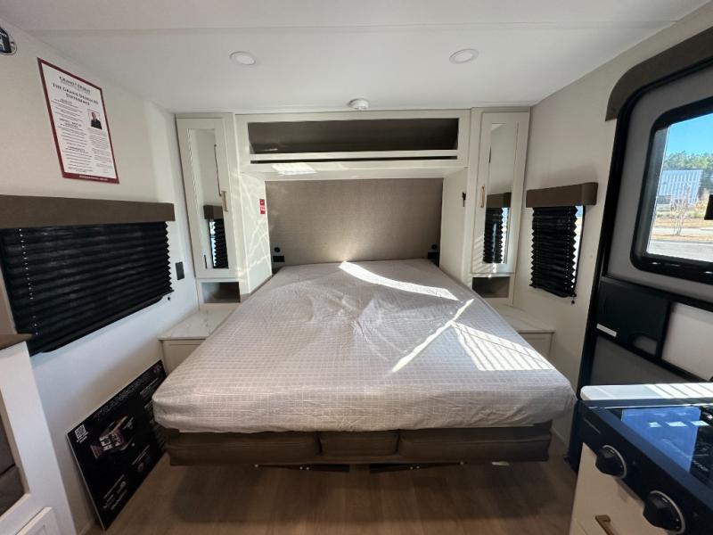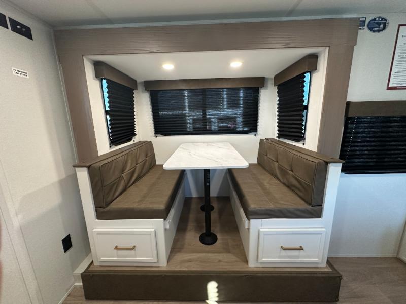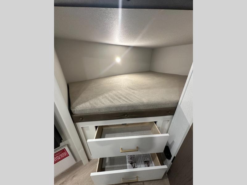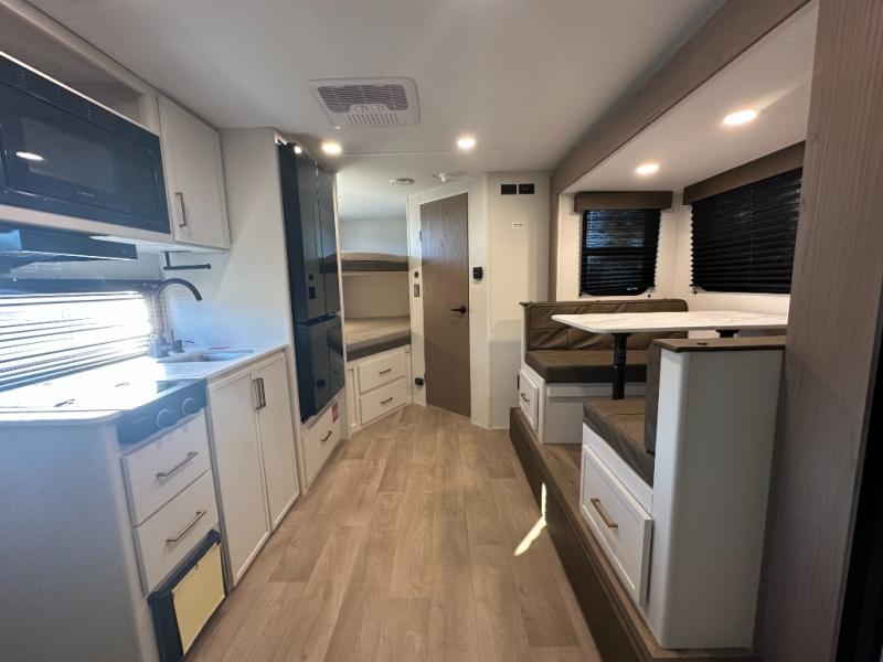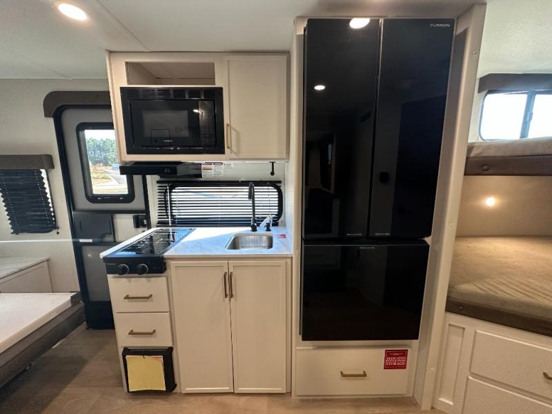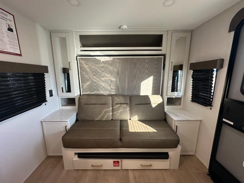 Spacious and versatile, this travel trailer is perfect for weekend trips to the campground or weeklong visits to the lake! There is a front Murphy bed with storage on both sides plus a pull-out pet drawer to keep your furry friends happy. Your guests or little ones will love the double-size bunks with privacy curtains, and the full bath is right next to the bunks for easy nighttime use. Once you make breakfast on the two burner range, you can dine at the booth dinette slide. And this model also includes an outdoor griddle and refrigerator if you want to make breakfast outdoors. Additional exterior features include a 16' power awning, an interior/exterior table, and a pass-thru storage for larger camp gear.