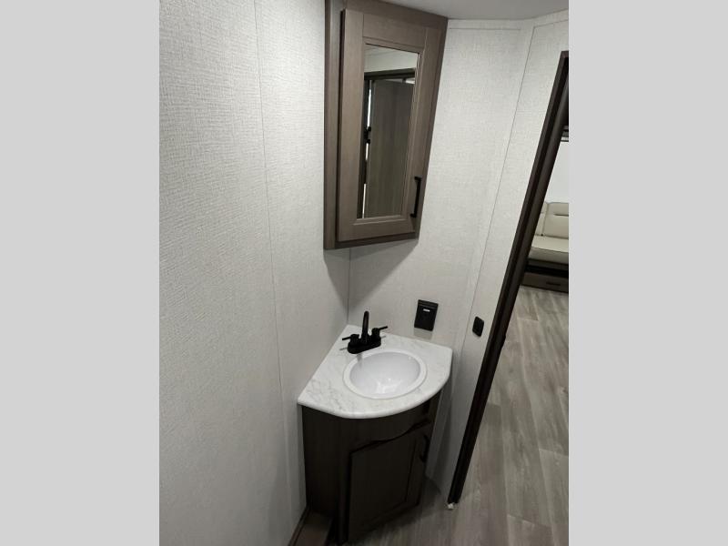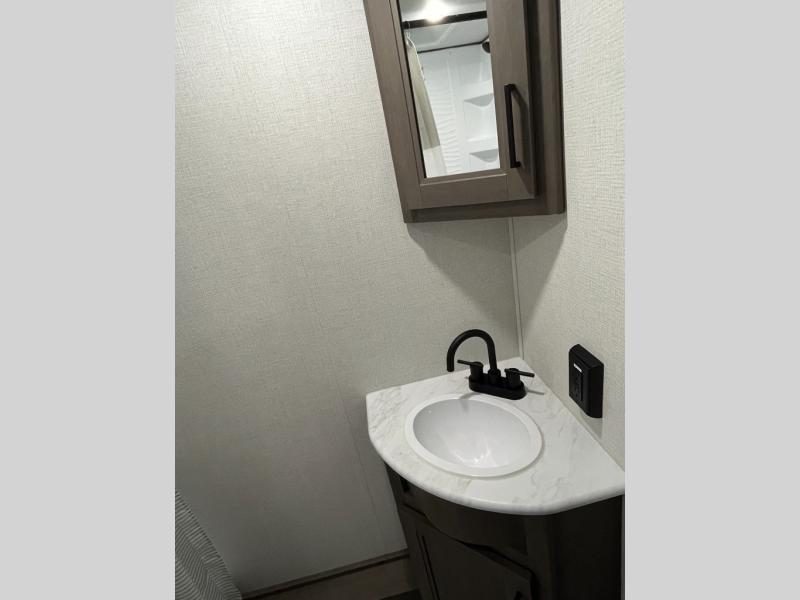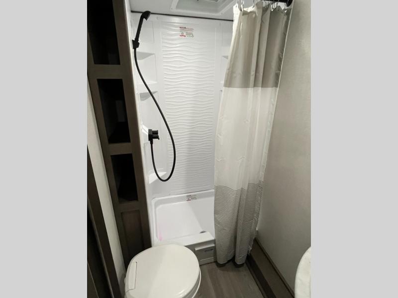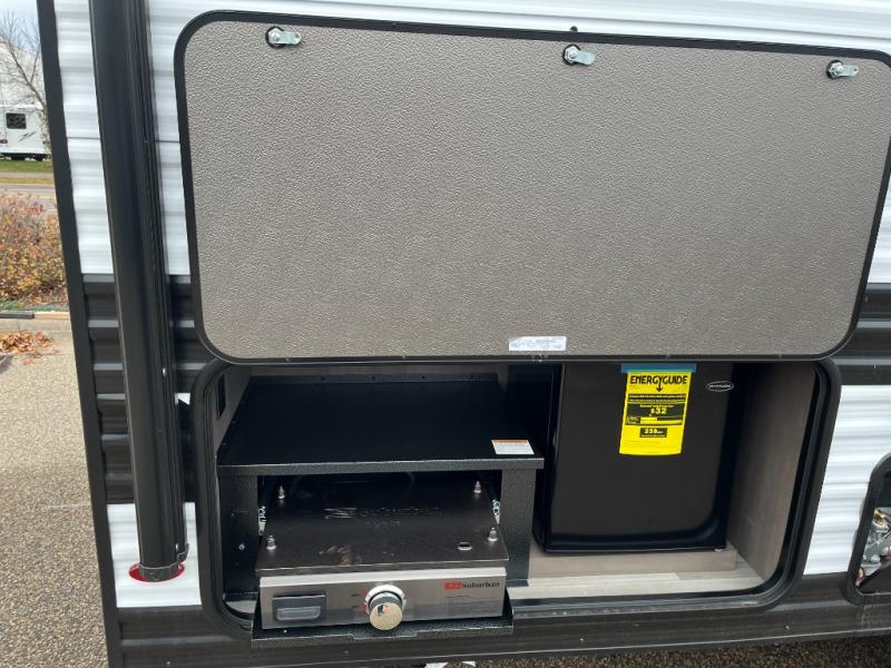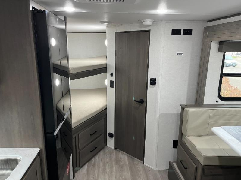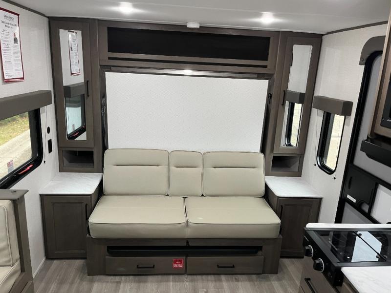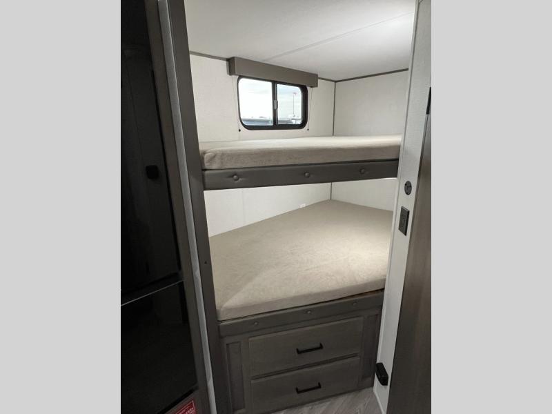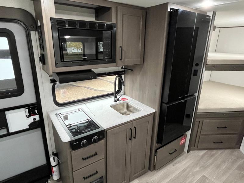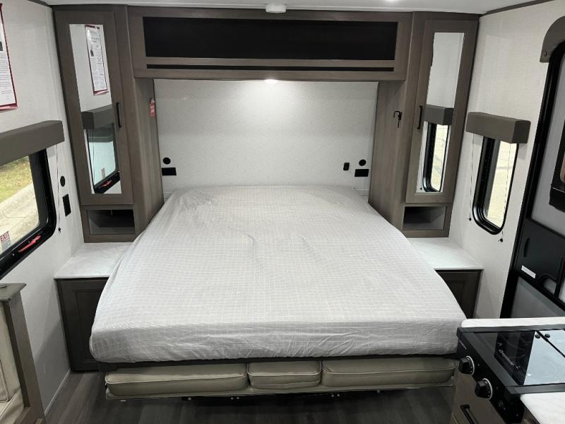 Spacious and versatile, this travel trailer is perfect for weekend trips to the campground or weeklong visits to the lake! There is a front Murphy bed with storage on both sides plus a pull-out pet drawer to keep your furry friends happy. Your guests or little ones will love the double-size bunks with privacy curtains, and the full bath is right next to the bunks for easy nighttime use. Once you make breakfast on the two burner range, you can dine at the booth dinette slide. And this model also includes an outdoor griddle and refrigerator if you want to make breakfast outdoors. Additional exterior features include a 16' power awning, an interior/exterior table, and a pass-thru storage for larger camp gear.