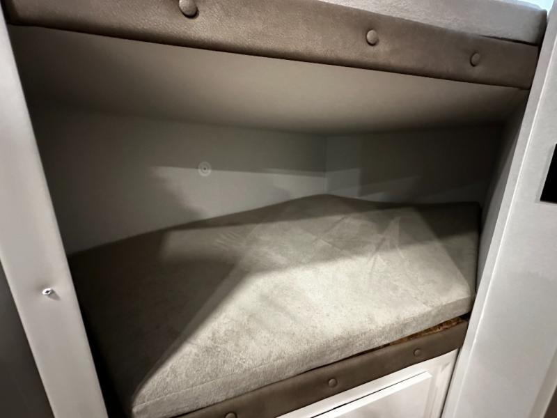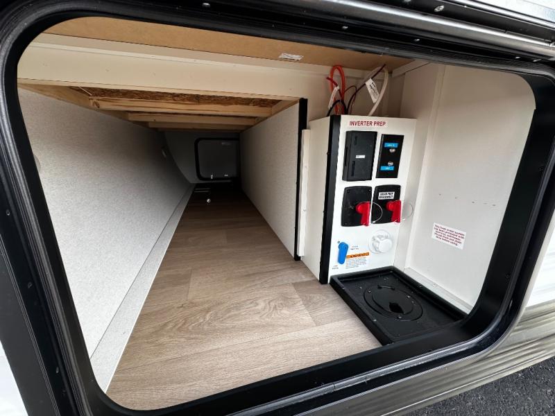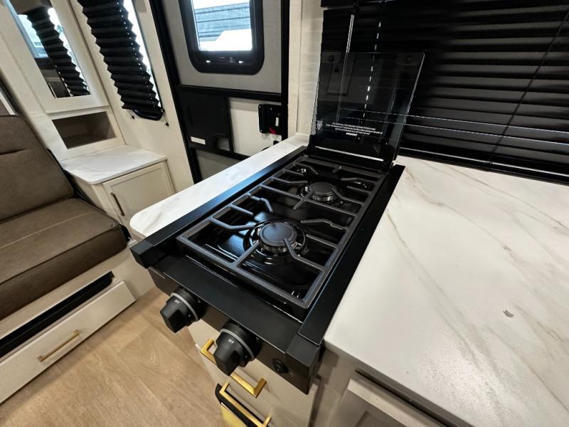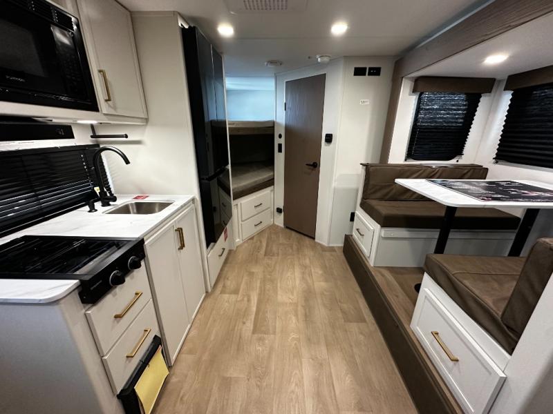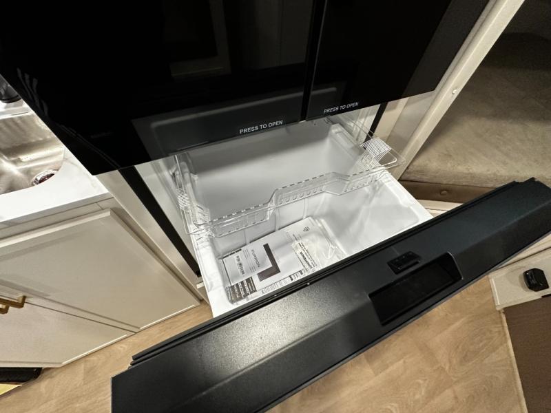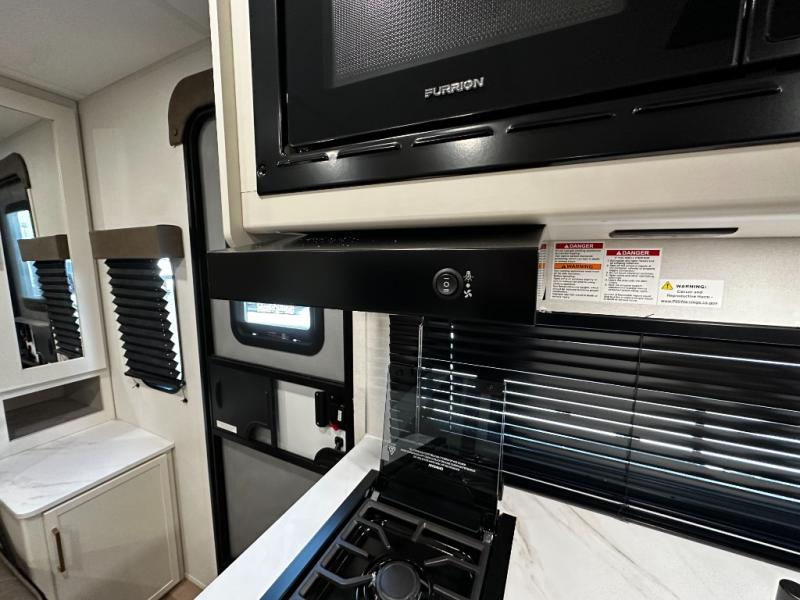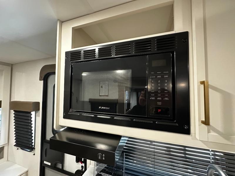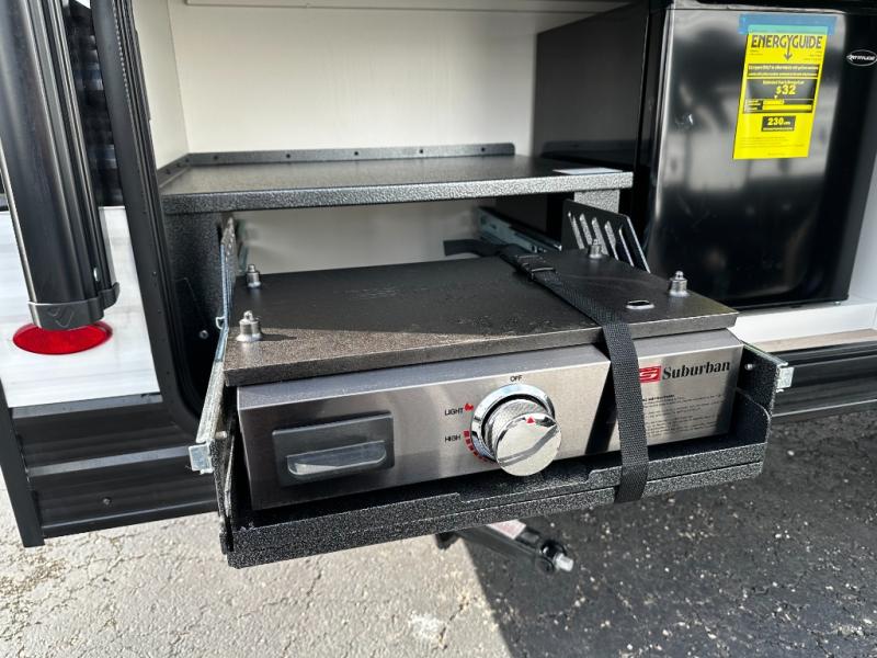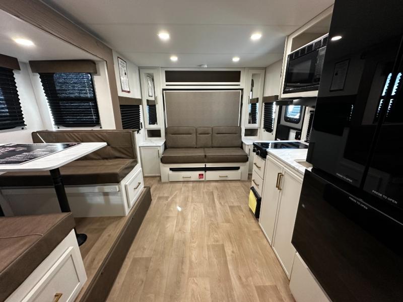 The well-appointed kitchen lets you prepare meals indoors on the two-burner range or take cooking outdoors with the exterior griddle and outdoor refrigerator. A pass-through storage compartment provides room for all your camping gear, from chairs to coolers, while modern conveniences like a JBL sound system, interior/exterior table, and Fusion-lit power awning enhance every adventure.