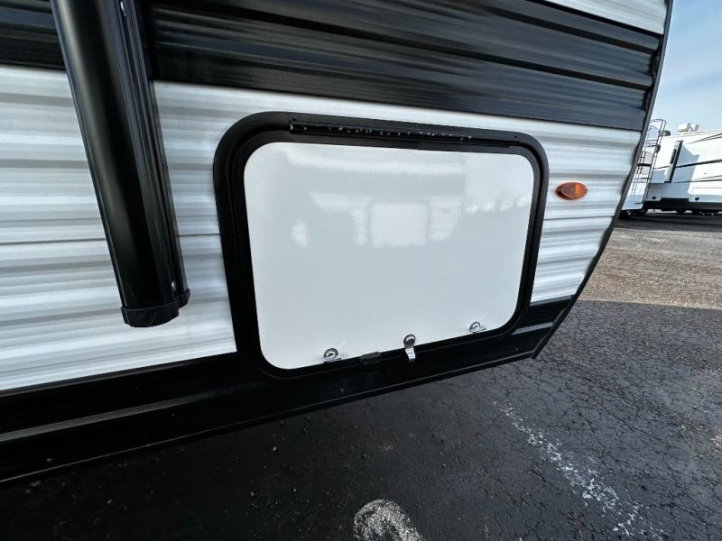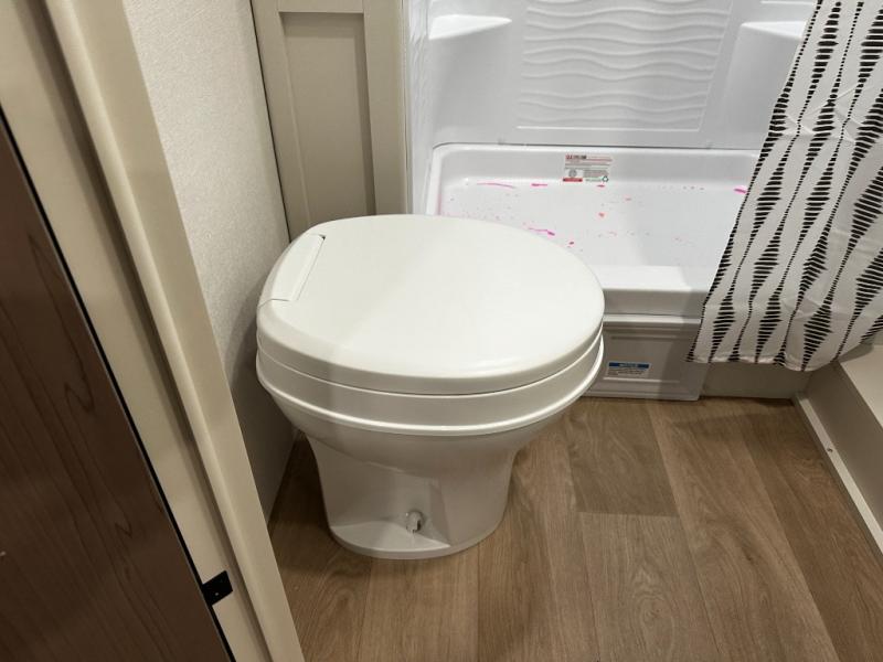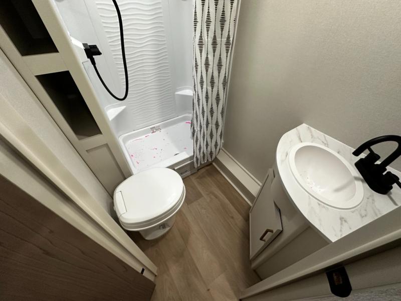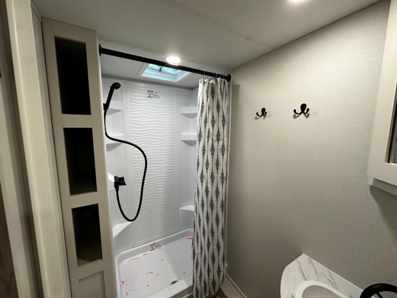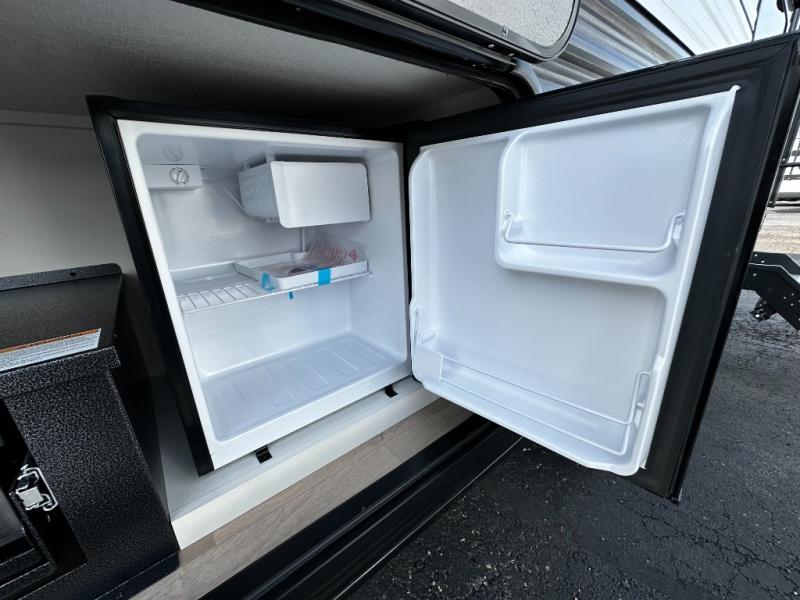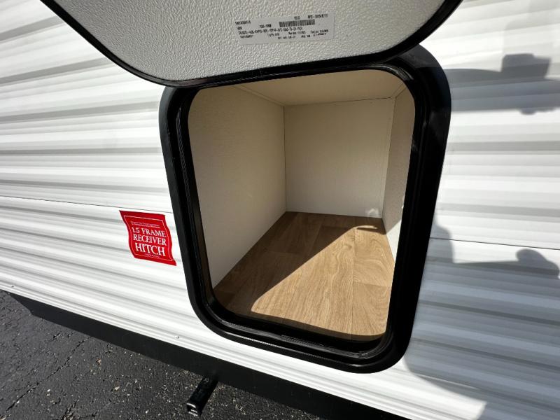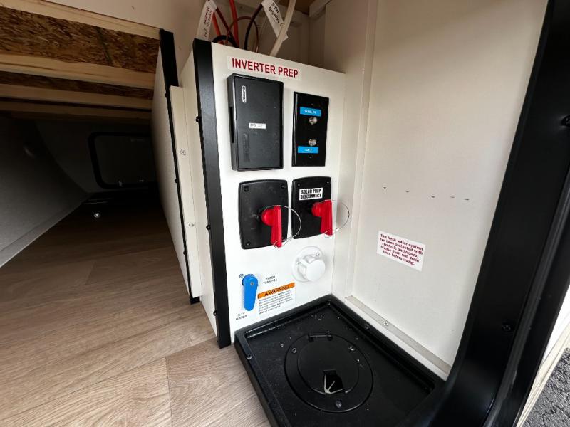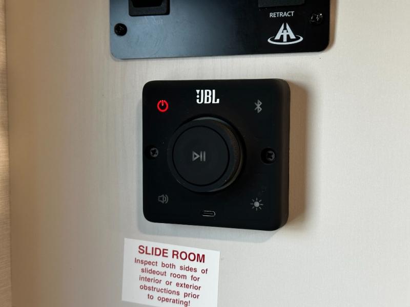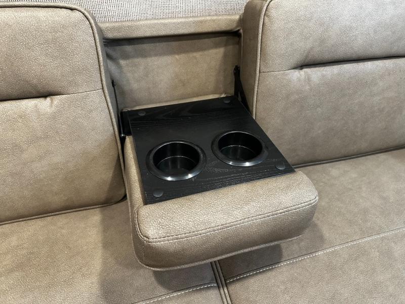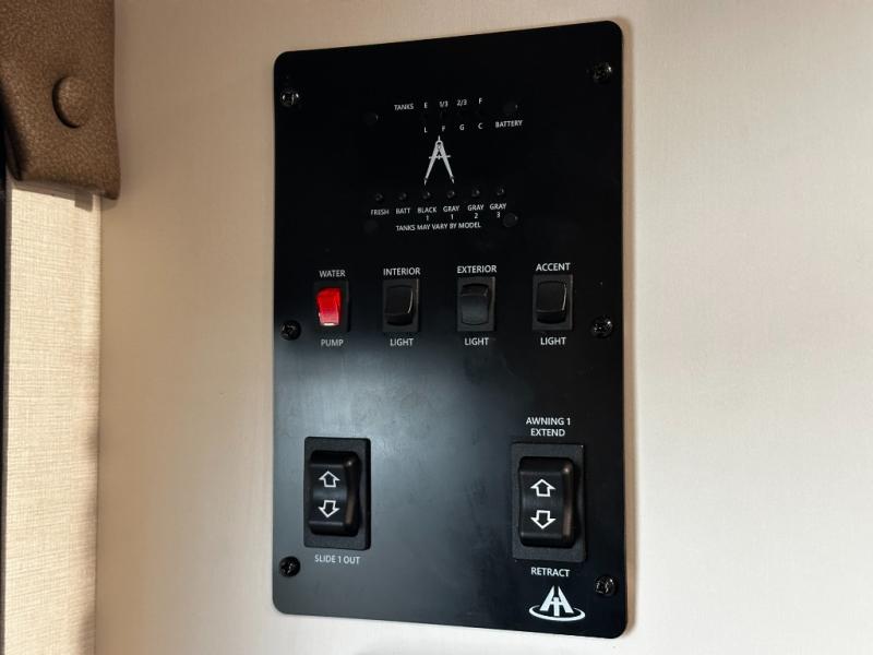 The well-appointed kitchen lets you prepare meals indoors on the two-burner range or take cooking outdoors with the exterior griddle and outdoor refrigerator. A pass-through storage compartment provides room for all your camping gear, from chairs to coolers, while modern conveniences like a JBL sound system, interior/exterior table, and Fusion-lit power awning enhance every adventure.