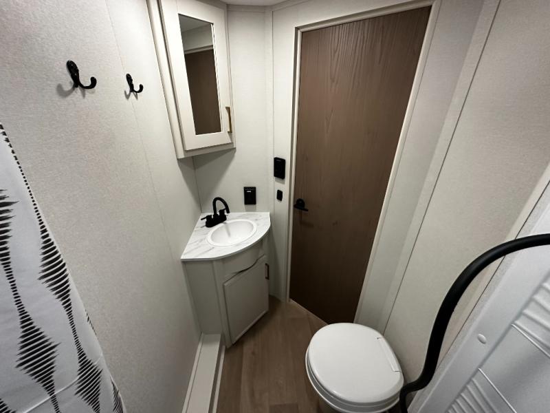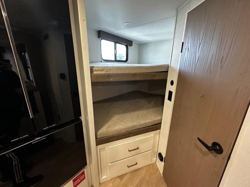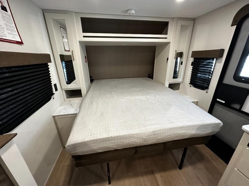 Inside, the Transcend One 161BH delivers thoughtful living space with a front Murphy bed that easily transforms your sleeping area into a comfortable living room during the day. Double-size rear bunk beds with privacy curtains make this floorplan ideal for kids, guests, or extra gear. The booth dinette slide expands your interior space for dining or relaxing, and the full bathroom is conveniently located near the bunks for family convenience.