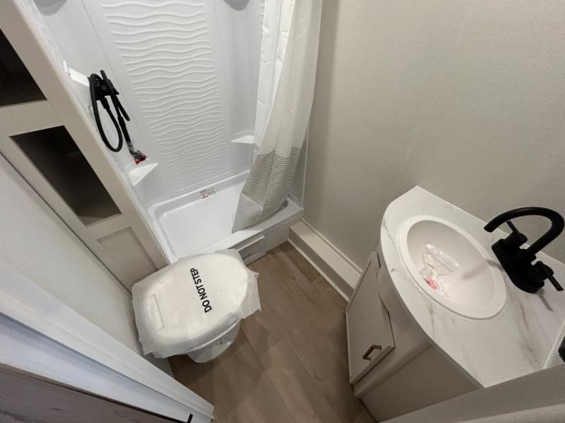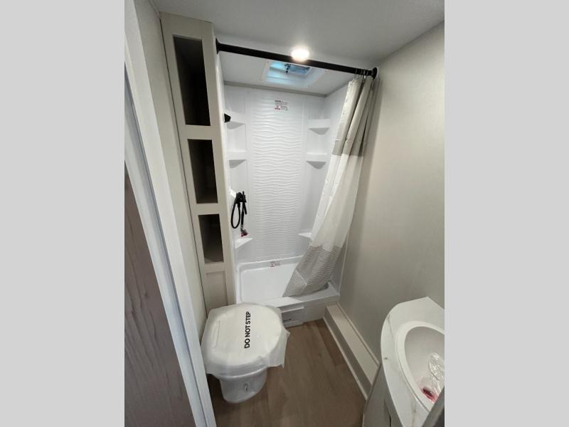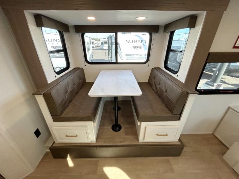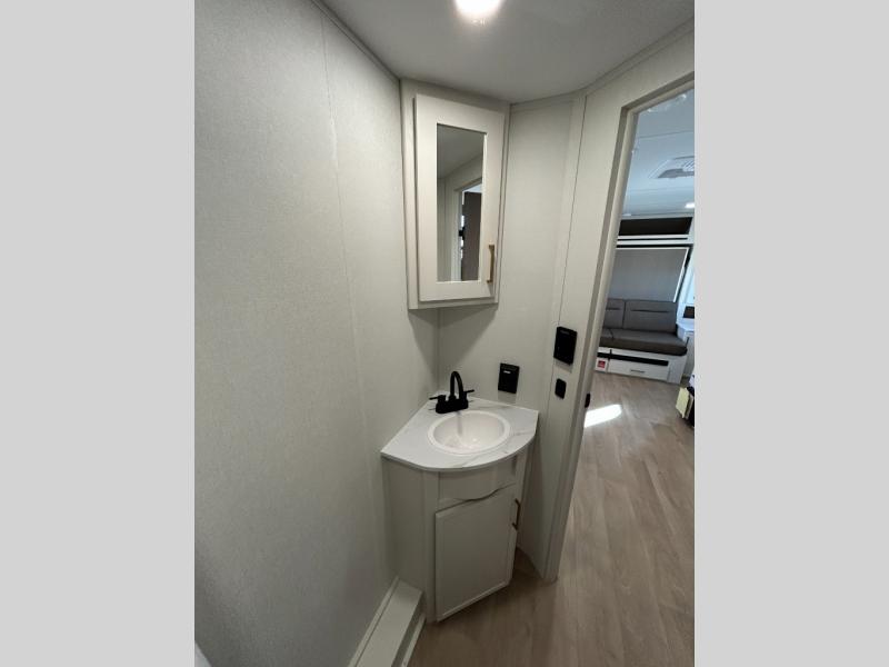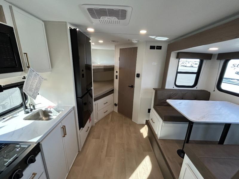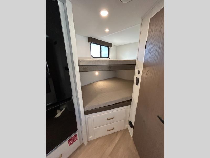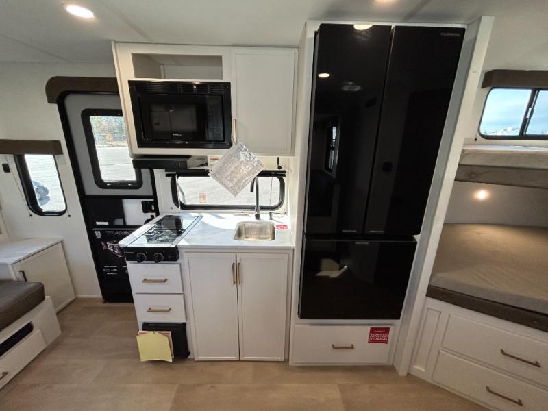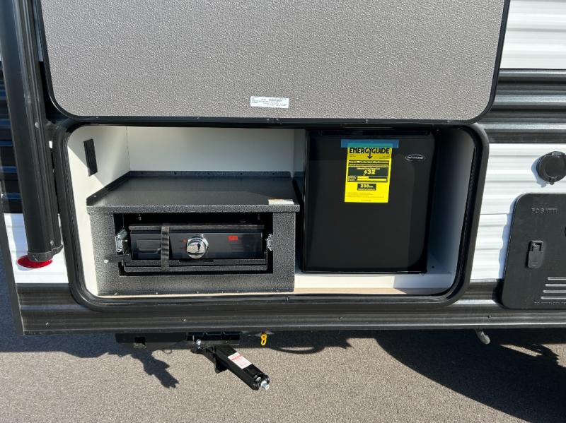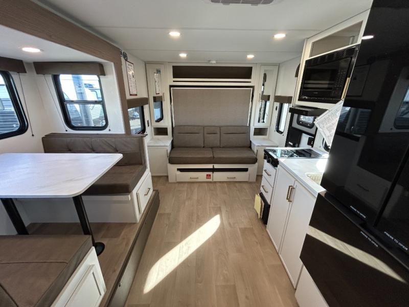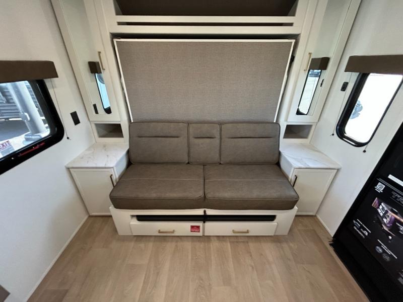 Spacious and versatile, this travel trailer is perfect for getaways to the campground or relaxing escapes by the lake! There is a front Murphy bed with storage on both sides plus a pull-out pet dish to keep your furry friends happy. Your guests or little ones will love the double-size bunks, and the full bath is right next to the bunks for easy nighttime use. Once you make breakfast on the two burner range, you can dine at the booth dinette slide. And this model also includes an outdoor griddle and refrigerator if you want to make breakfast outdoors. Additional exterior features include a 16' power awning, an interior/exterior table, and a pass-thru storage for larger camp gear.