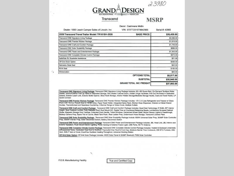 New 2026 Grand Design Transcend One 161BH Travel Trailer