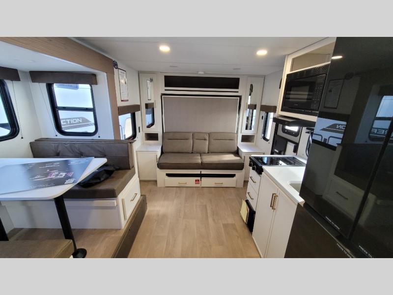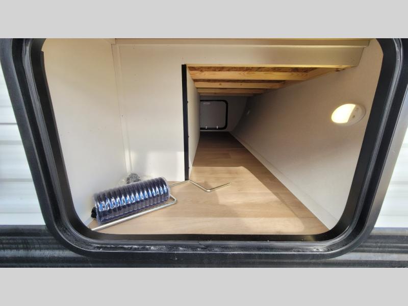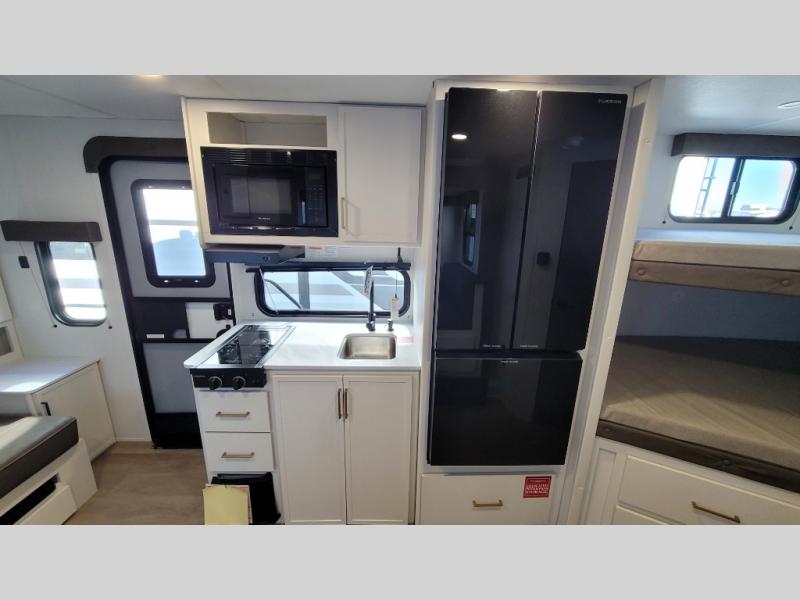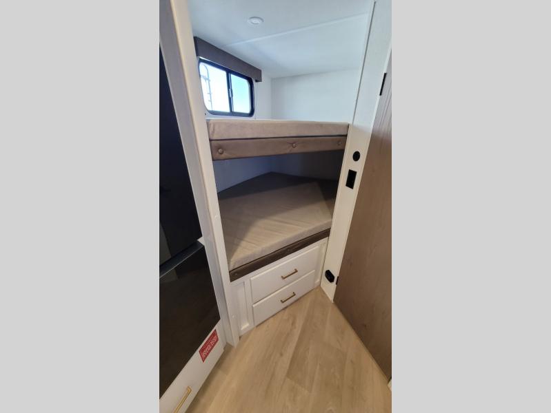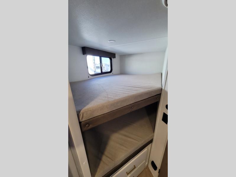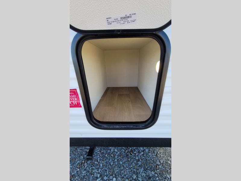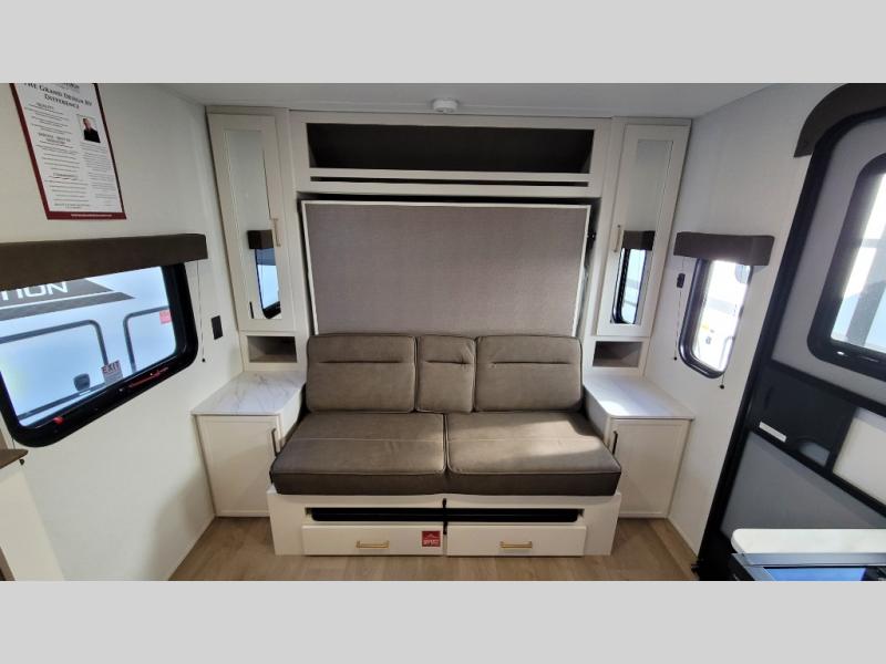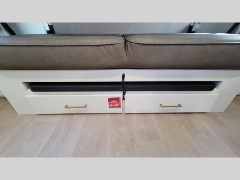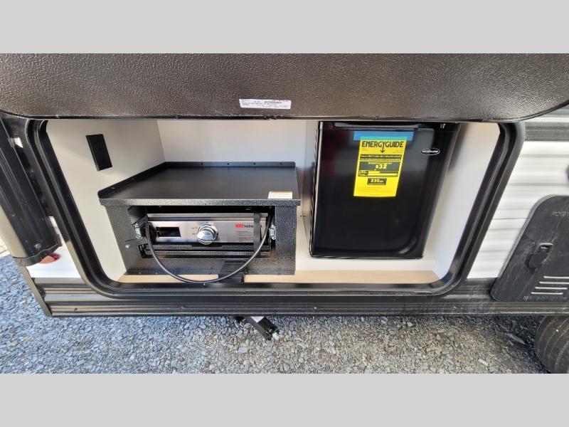 Spacious and versatile, this travel trailer is perfect for getaways to the campground or relaxing escapes by the lake! There is a front Murphy bed with storage on both sides plus a pull-out pet dish to keep your furry friends happy. Your guests or little ones will love the double-size bunks, and the full bath is right next to the bunks for easy nighttime use. Once you make breakfast on the two burner range, you can dine at the booth dinette slide. And this model also includes an outdoor griddle and refrigerator if you want to make breakfast outdoors. Additional exterior features include a 16' power awning, an interior/exterior table, and a pass-thru storage for larger camp gear.