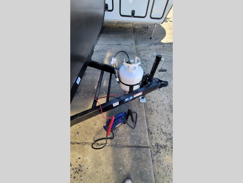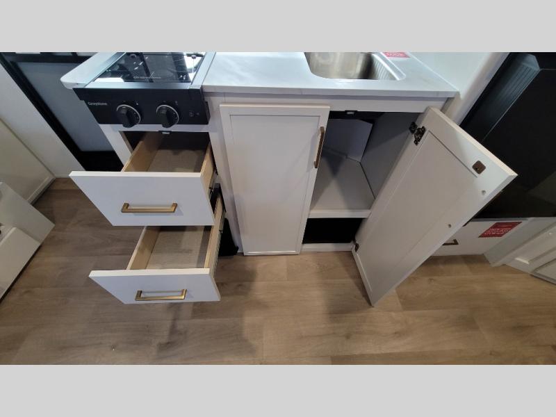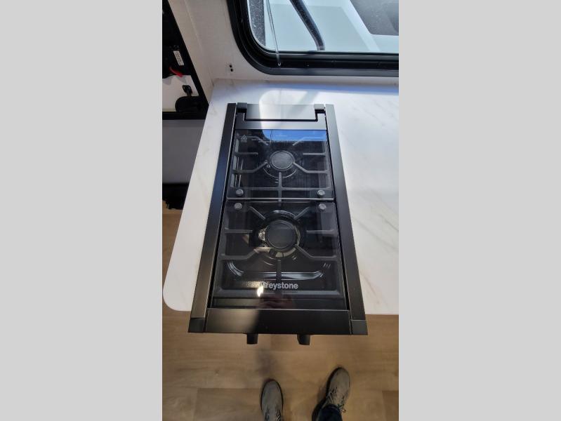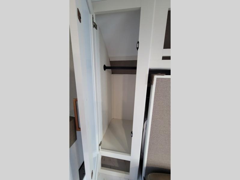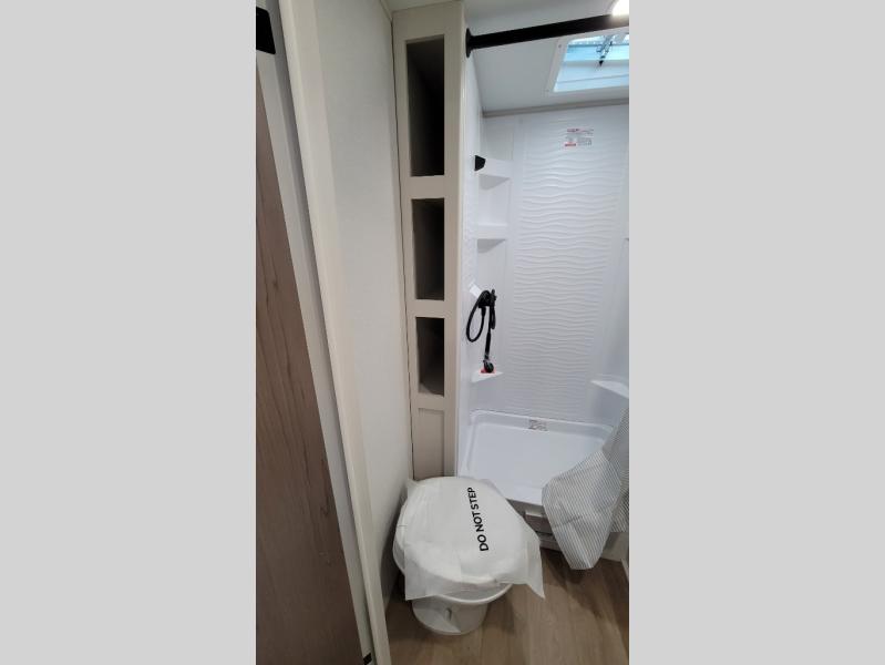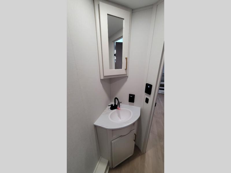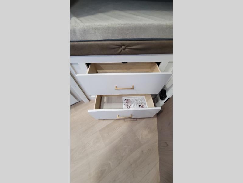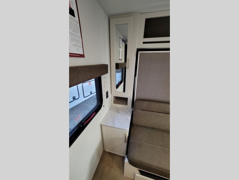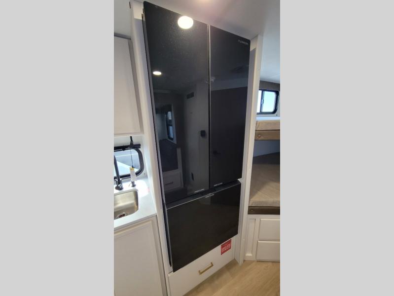 Spacious and versatile, this travel trailer is perfect for getaways to the campground or relaxing escapes by the lake! There is a front Murphy bed with storage on both sides plus a pull-out pet dish to keep your furry friends happy. Your guests or little ones will love the double-size bunks, and the full bath is right next to the bunks for easy nighttime use. Once you make breakfast on the two burner range, you can dine at the booth dinette slide. And this model also includes an outdoor griddle and refrigerator if you want to make breakfast outdoors. Additional exterior features include a 16' power awning, an interior/exterior table, and a pass-thru storage for larger camp gear.