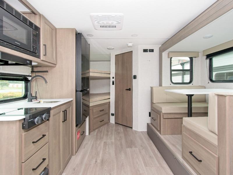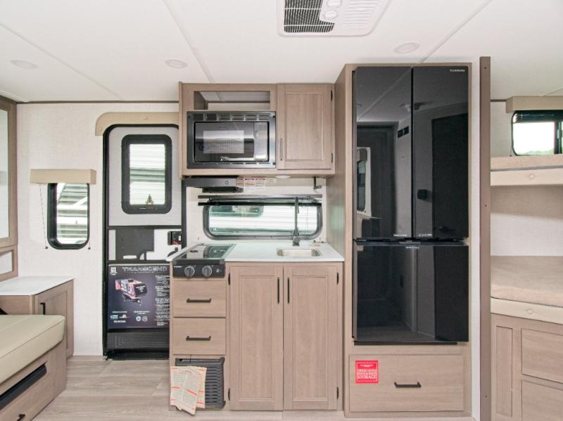 Spacious and versatile, this travel trailer is perfect for getaways to the campground or relaxing escapes by the lake! There is a front Murphy bed with storage on both sides plus a pull-out pet dish to keep your furry friends happy. Your guests or little ones will love the double-size bunks, and the full bath is right next to the bunks for easy nighttime use. Once you make breakfast on the two burner range, you can dine at the booth dinette slide. And this model also includes an outdoor griddle and refrigerator if you want to make breakfast outdoors. Additional exterior features include a 16' power awning, an interior/exterior table, and a pass-thru storage for larger camp gear.