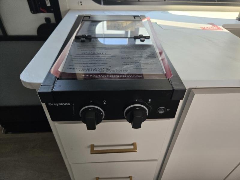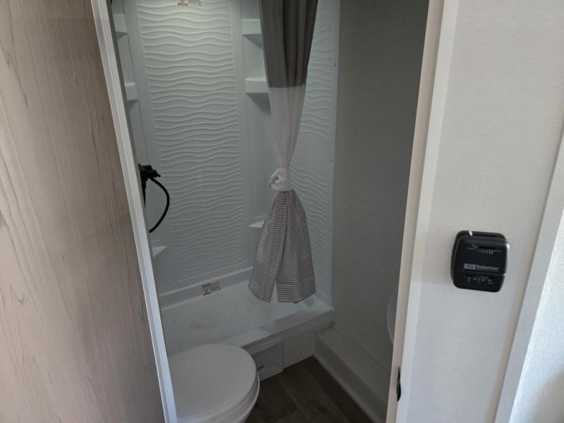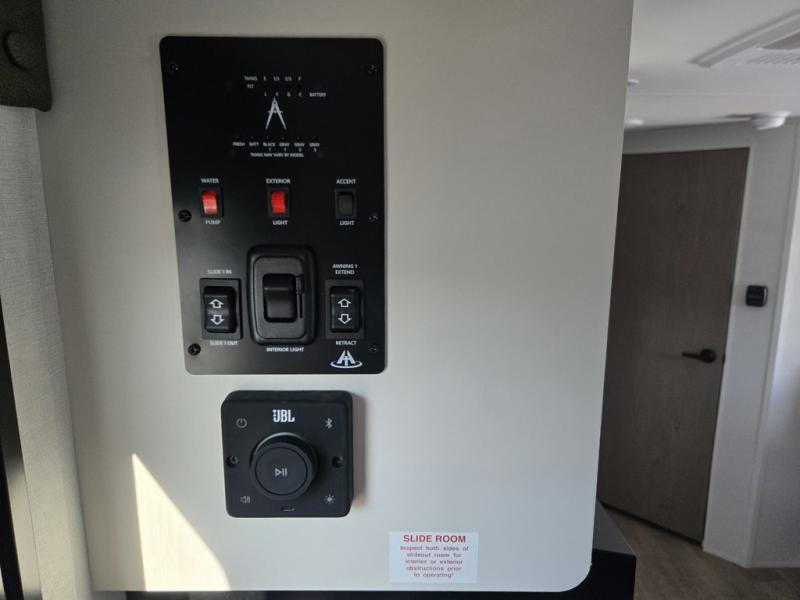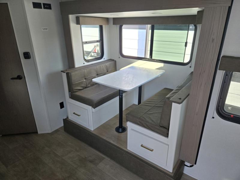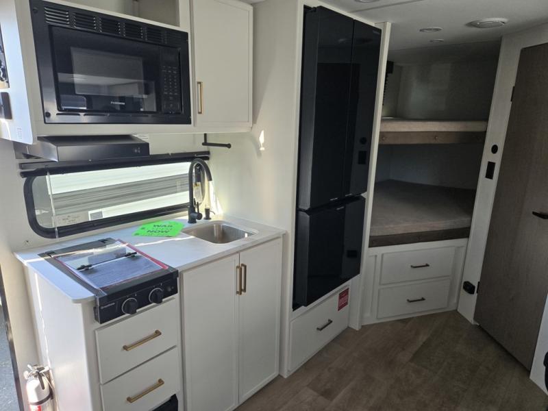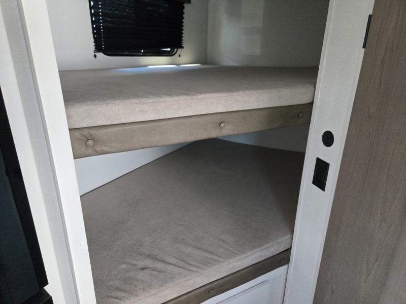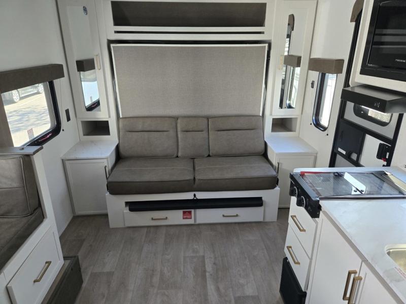 Spacious and versatile, this travel trailer is perfect for weekend trips to the campground or weeklong visits to the lake! There is a front Murphy bed with storage on both sides plus a pull-out pet drawer to keep your furry friends happy. Your guests or little ones will love the double-size bunks with privacy curtains, and the full bath is right next to the bunks for easy nighttime use. Once you make breakfast on the two burner range, you can dine at the booth dinette slide. And this model also includes an outdoor griddle and refrigerator if you want to make breakfast outdoors. Additional exterior features include a 16' power awning, an interior/exterior table, and a pass-thru storage for larger camp gear.