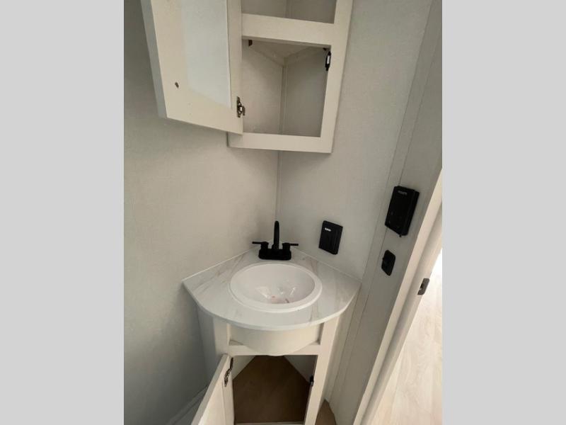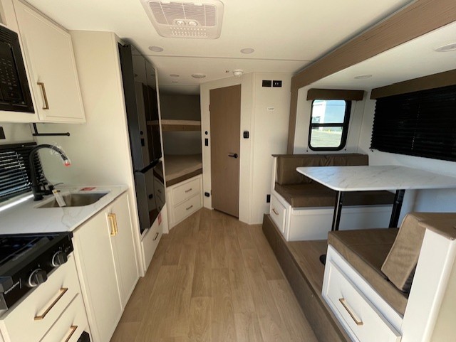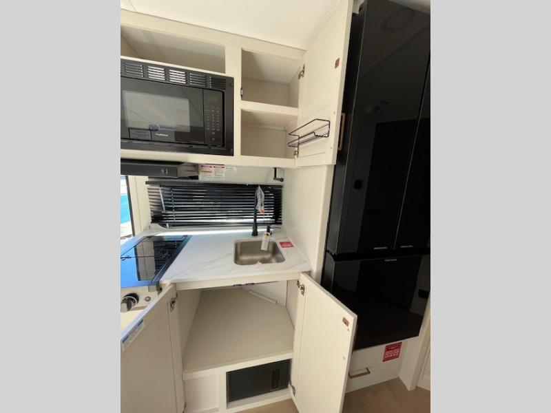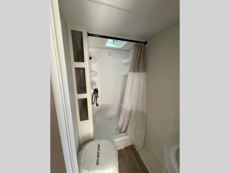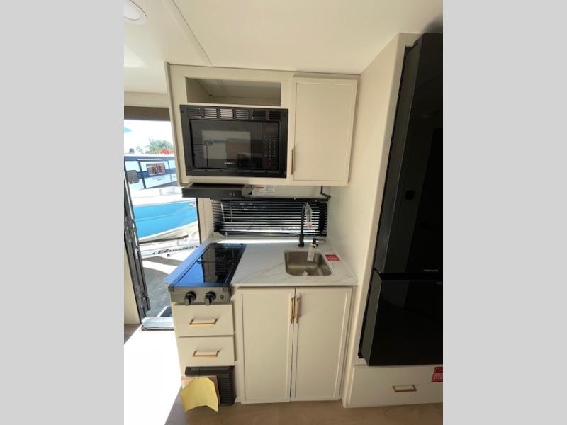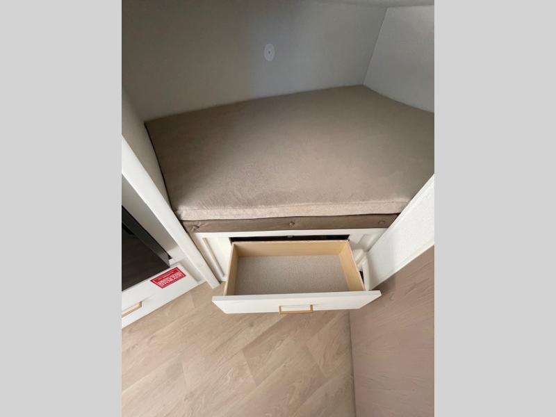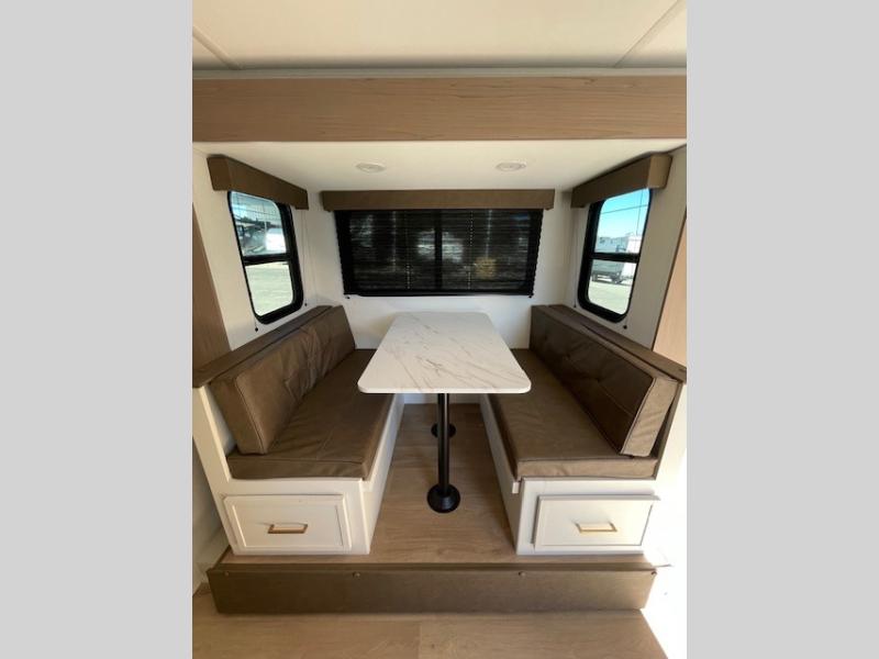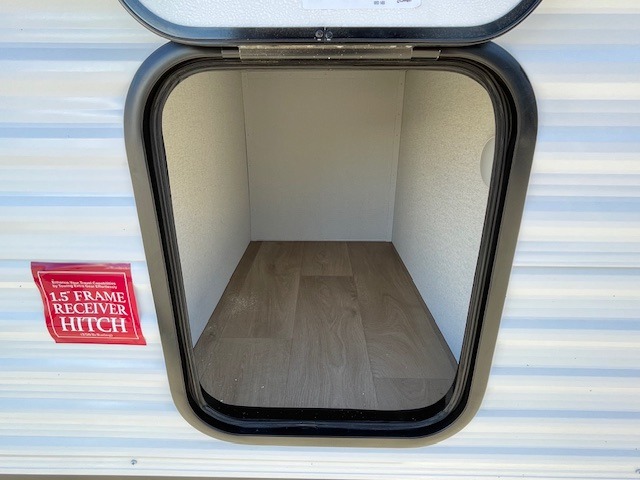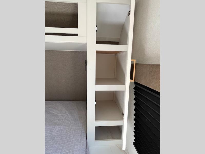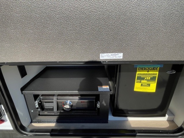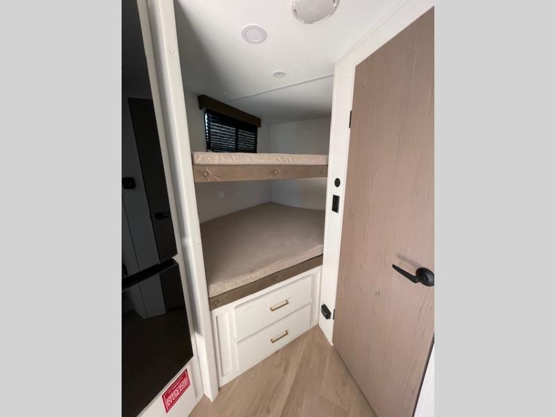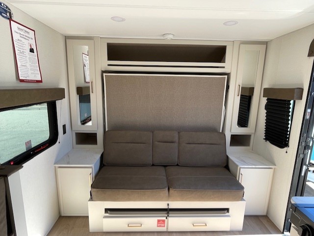 Spacious and versatile, this travel trailer is perfect for getaways to the campground or relaxing escapes by the lake! There is a front Murphy bed with storage on both sides plus a pull-out pet dish to keep your furry friends happy. Your guests or little ones will love the double-size bunks, and the full bath is right next to the bunks for easy nighttime use. Once you make breakfast on the two burner range, you can dine at the booth dinette slide. And this model also includes an outdoor griddle and refrigerator if you want to make breakfast outdoors. Additional exterior features include a 16' power awning, an interior/exterior table, and a pass-thru storage for larger camp gear.