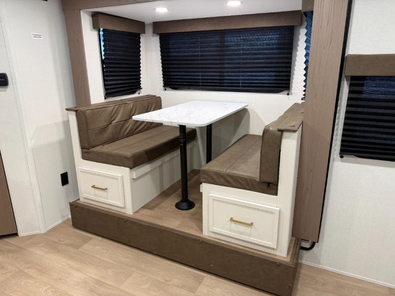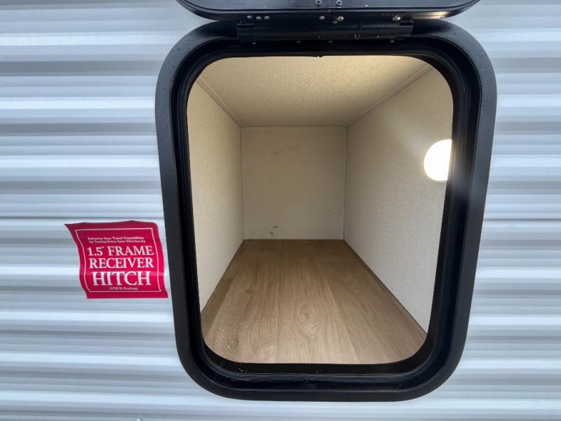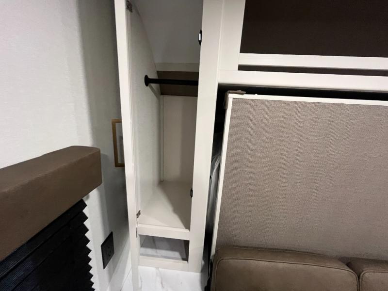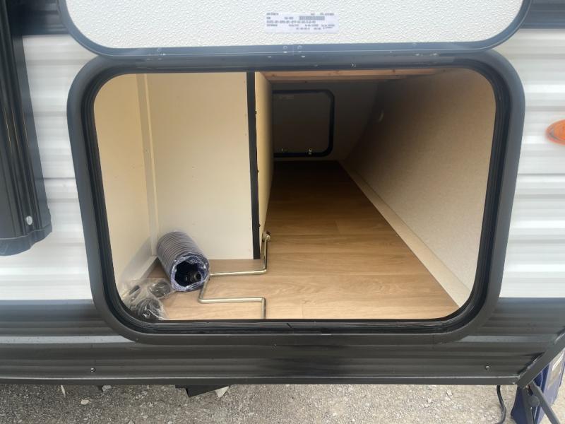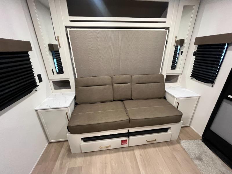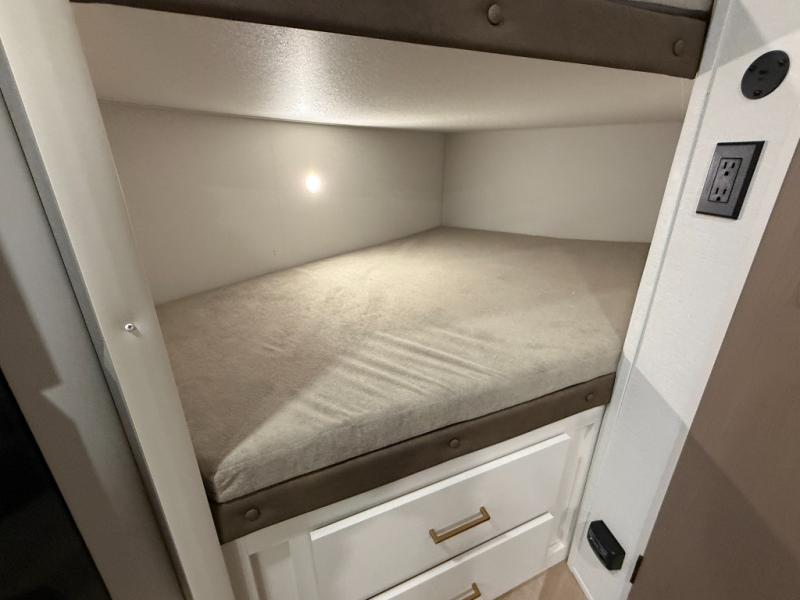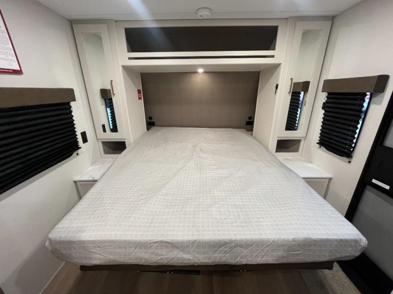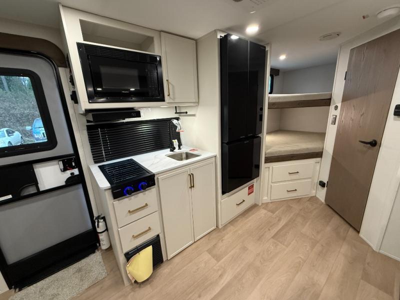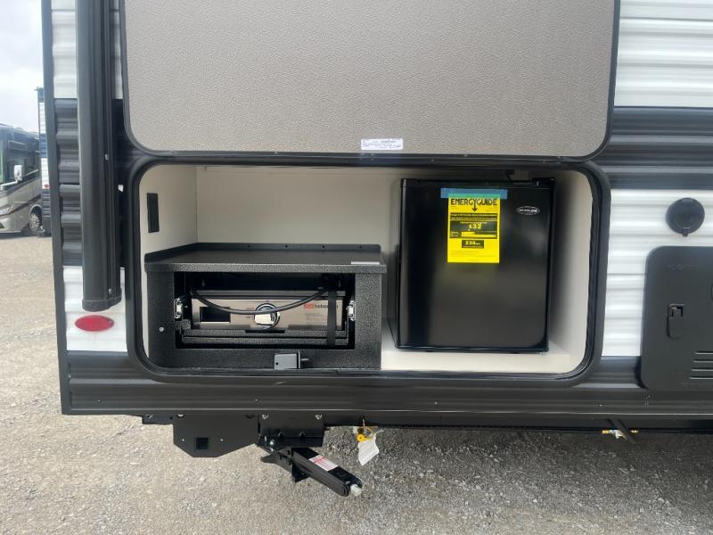 Spacious and versatile, this travel trailer is perfect for getaways to the campground or relaxing escapes by the lake! There is a front Murphy bed with storage on both sides plus a pull-out pet dish to keep your furry friends happy. Your guests or little ones will love the double-size bunks, and the full bath is right next to the bunks for easy nighttime use. Once you make breakfast on the two burner range, you can dine at the booth dinette slide. And this model also includes an outdoor griddle and refrigerator if you want to make breakfast outdoors. Additional exterior features include a 16' power awning, an interior/exterior table, and a pass-thru storage for larger camp gear.