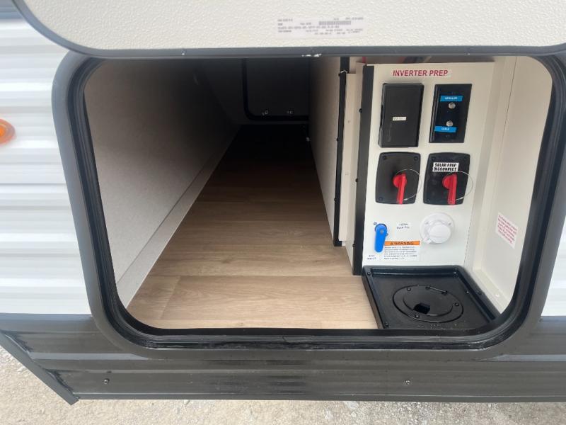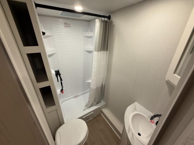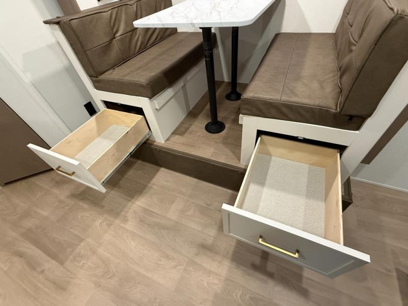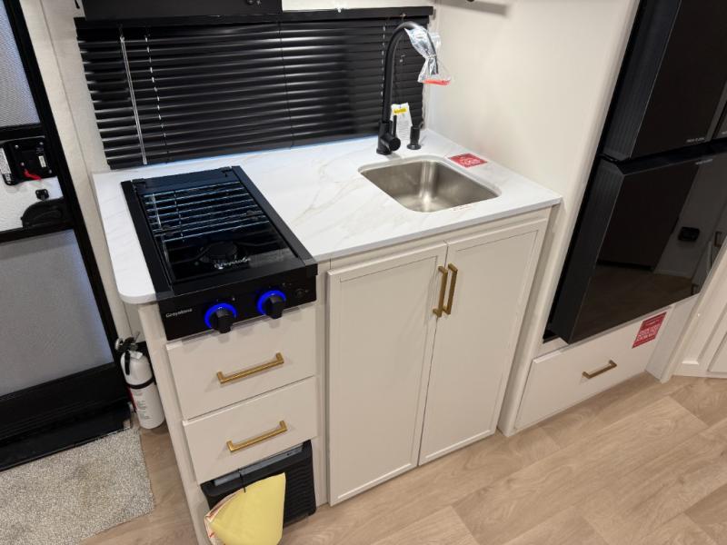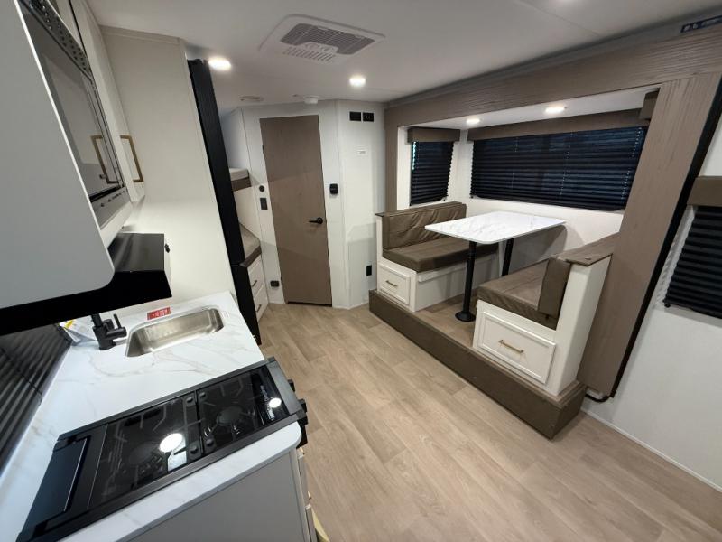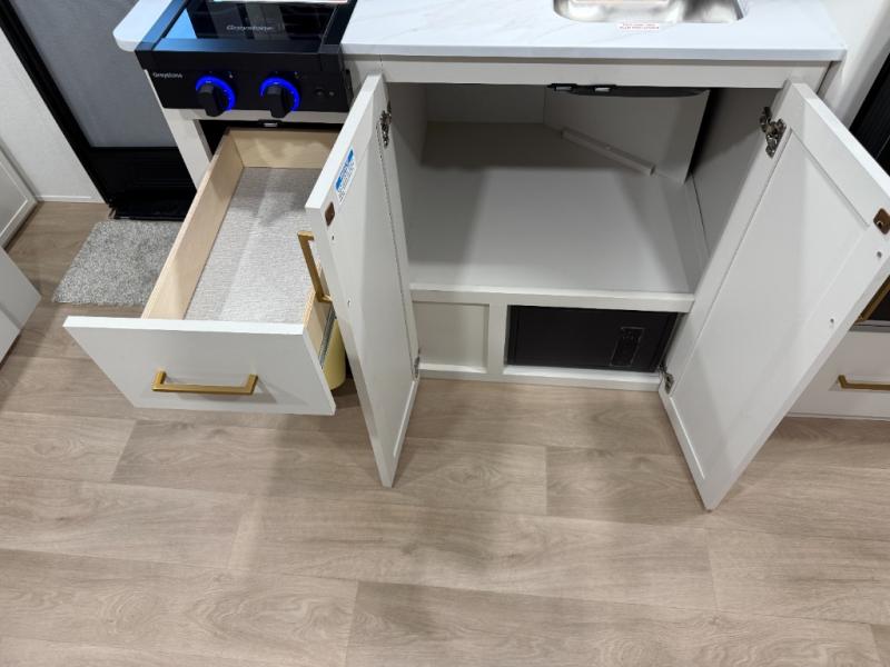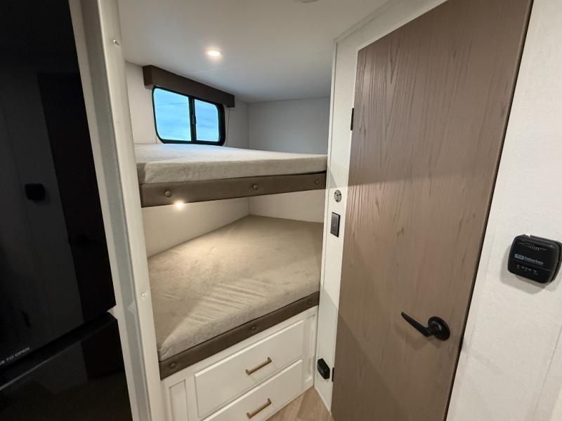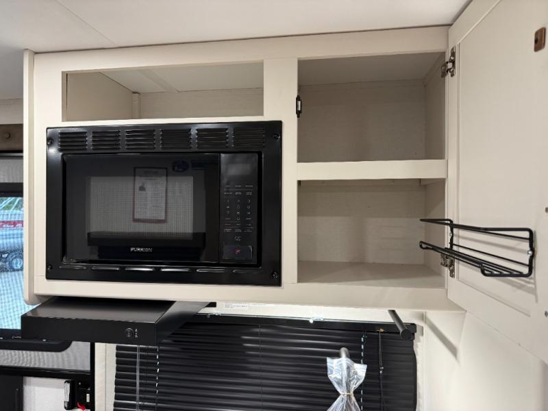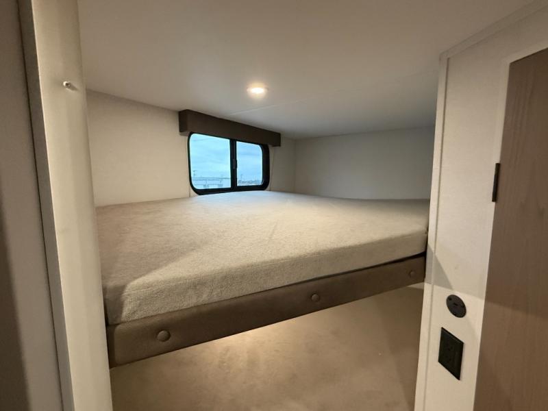 Spacious and versatile, this travel trailer is perfect for getaways to the campground or relaxing escapes by the lake! There is a front Murphy bed with storage on both sides plus a pull-out pet dish to keep your furry friends happy. Your guests or little ones will love the double-size bunks, and the full bath is right next to the bunks for easy nighttime use. Once you make breakfast on the two burner range, you can dine at the booth dinette slide. And this model also includes an outdoor griddle and refrigerator if you want to make breakfast outdoors. Additional exterior features include a 16' power awning, an interior/exterior table, and a pass-thru storage for larger camp gear.