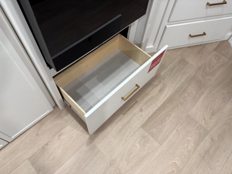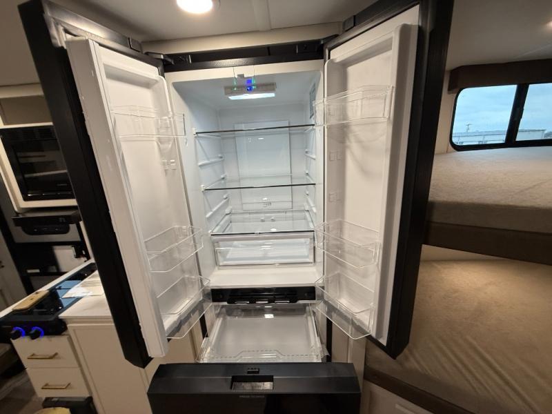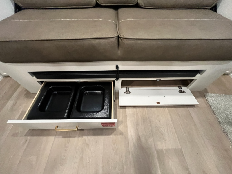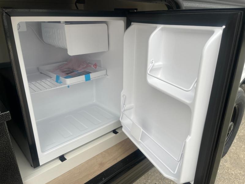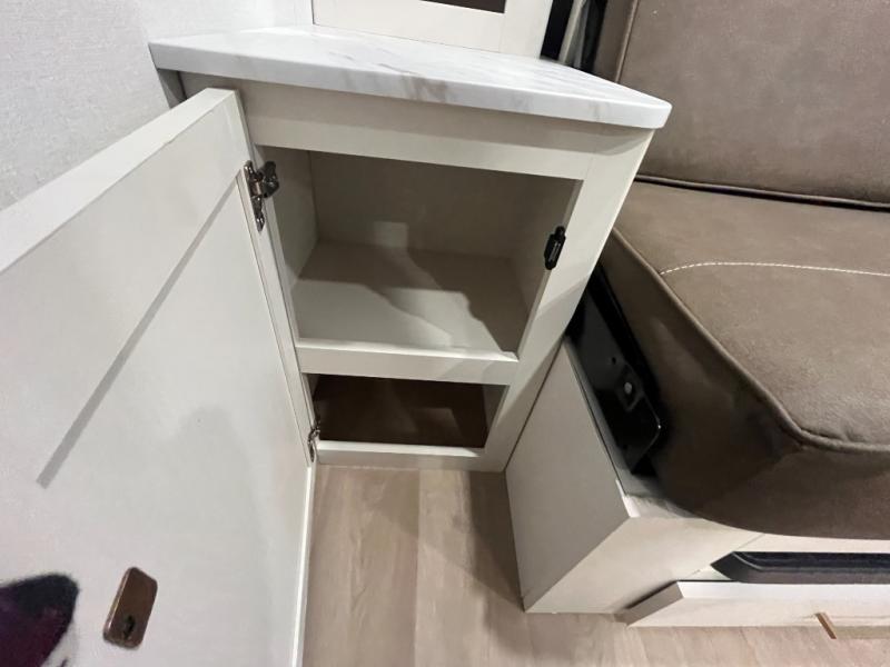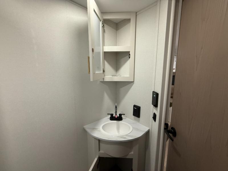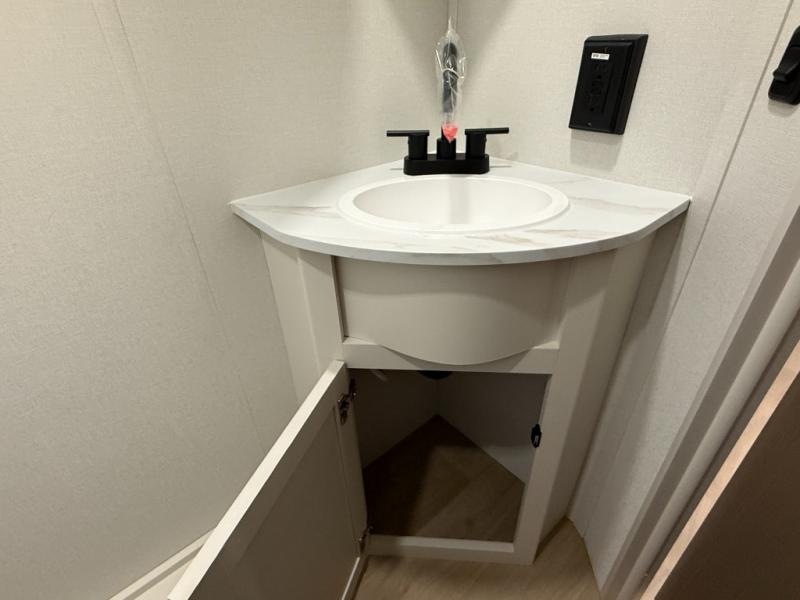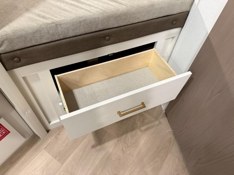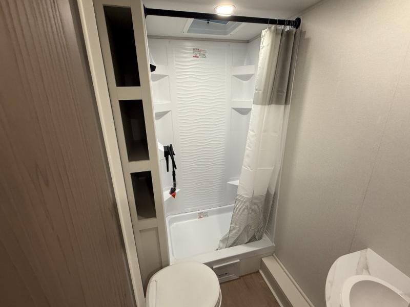 Spacious and versatile, this travel trailer is perfect for getaways to the campground or relaxing escapes by the lake! There is a front Murphy bed with storage on both sides plus a pull-out pet dish to keep your furry friends happy. Your guests or little ones will love the double-size bunks, and the full bath is right next to the bunks for easy nighttime use. Once you make breakfast on the two burner range, you can dine at the booth dinette slide. And this model also includes an outdoor griddle and refrigerator if you want to make breakfast outdoors. Additional exterior features include a 16' power awning, an interior/exterior table, and a pass-thru storage for larger camp gear.