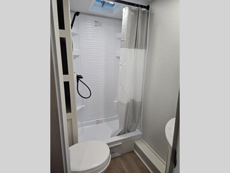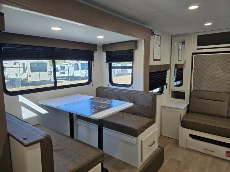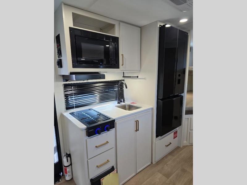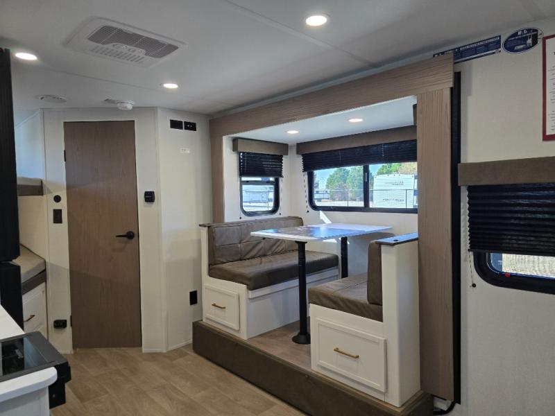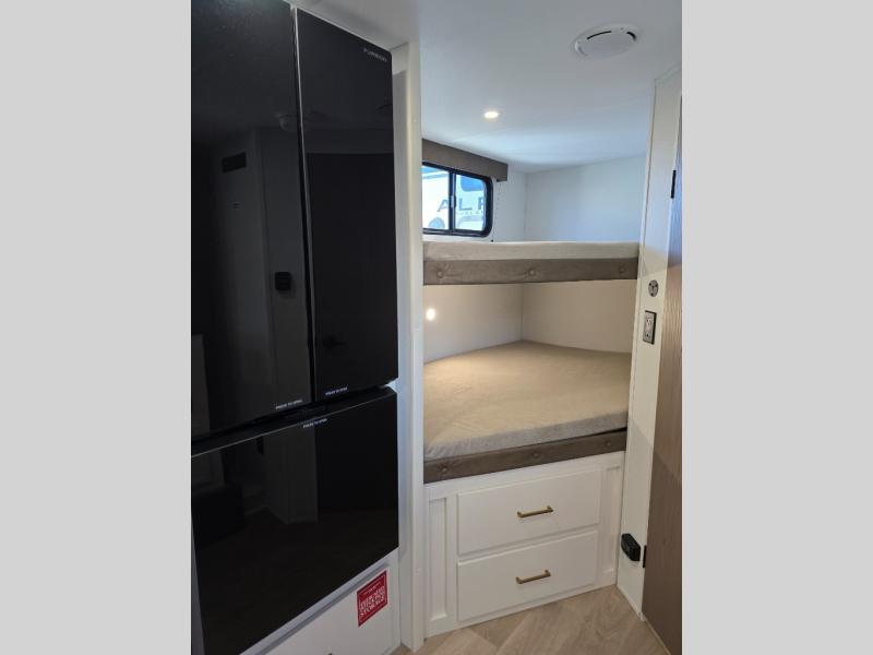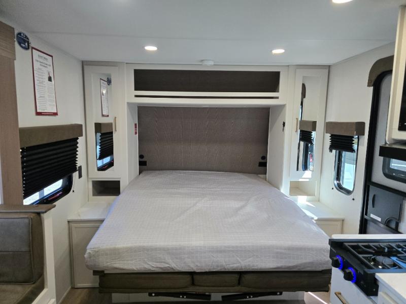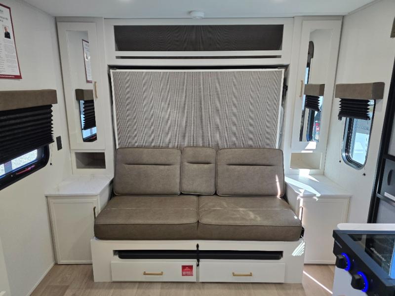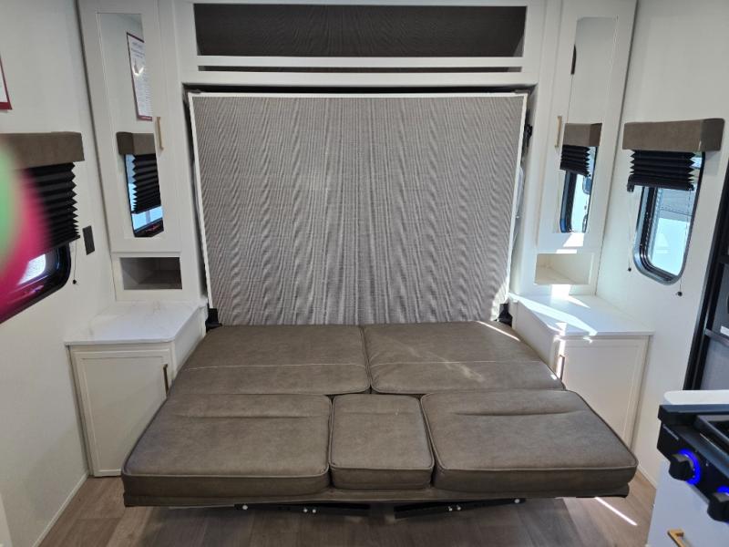 Spacious and versatile, this travel trailer is perfect for getaways to the campground or relaxing escapes by the lake! There is a front Murphy bed with storage on both sides plus a pull-out pet dish to keep your furry friends happy. Your guests or little ones will love the double-size bunks, and the full bath is right next to the bunks for easy nighttime use. Once you make breakfast on the two burner range, you can dine at the booth dinette slide. And this model also includes an outdoor griddle and refrigerator if you want to make breakfast outdoors. Additional exterior features include a 16' power awning, an interior/exterior table, and a pass-thru storage for larger camp gear.