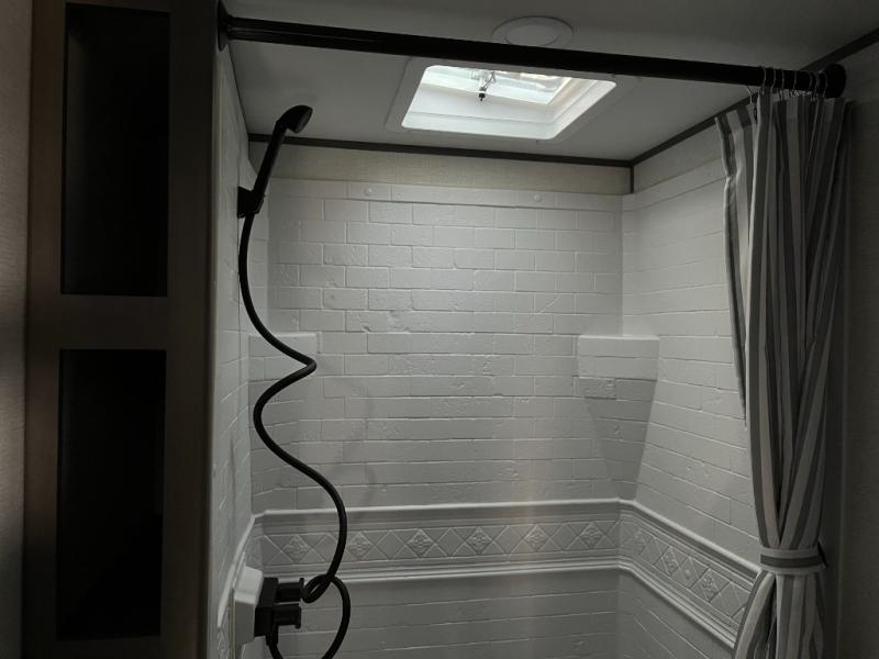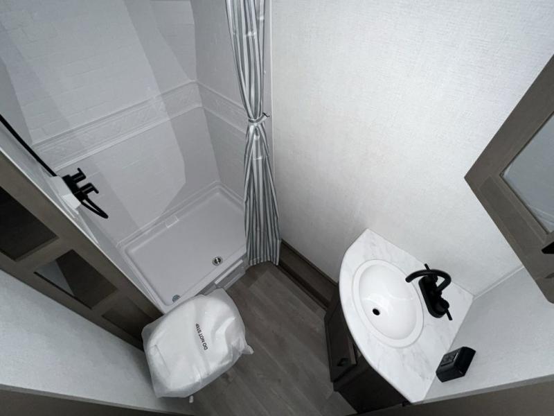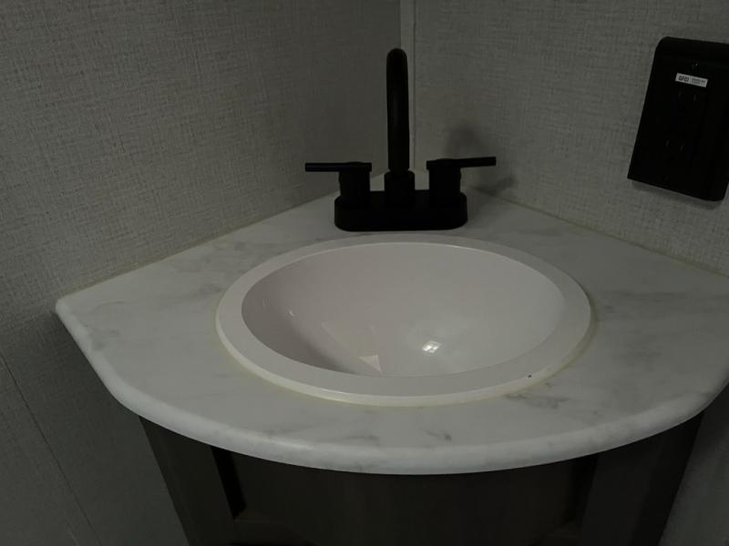Shower, toilet, and vanity bring everyday comfort to your campsite.