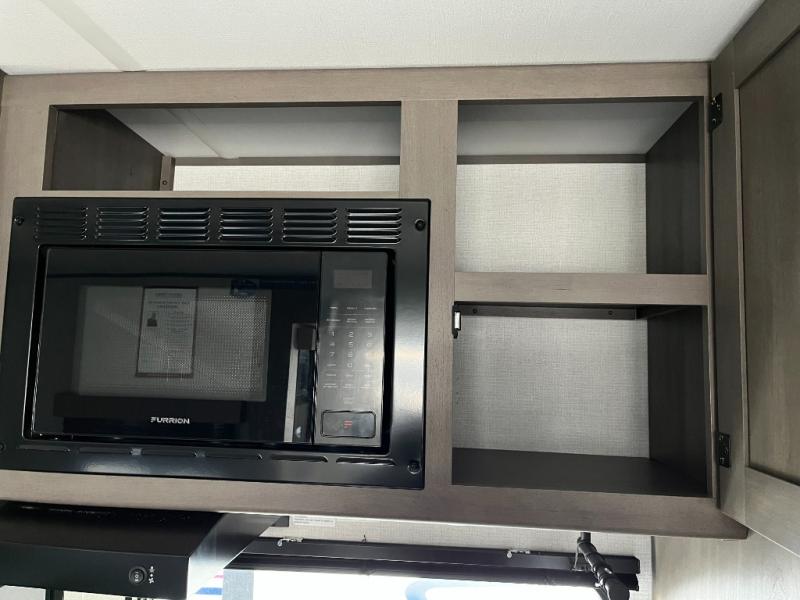 Cooktop, microwave, and refrigerator make meal prep convenient on the road.