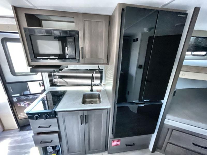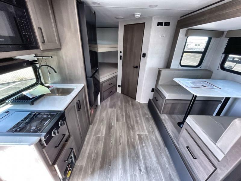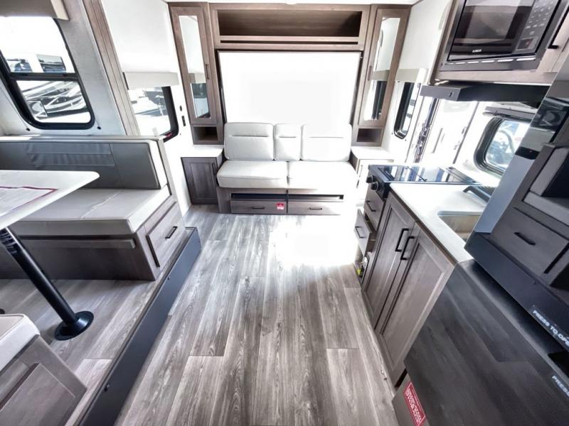 Spacious and versatile, this travel trailer is perfect for getaways to the campground or relaxing escapes by the lake! There is a front Murphy bed with storage on both sides plus a pull-out pet dish to keep your furry friends happy. Your guests or little ones will love the double-size bunks, and the full bath is right next to the bunks for easy nighttime use. Once you make breakfast on the two burner range, you can dine at the booth dinette slide. And this model also includes an outdoor griddle and refrigerator if you want to make breakfast outdoors. Additional exterior features include a 16' power awning, an interior/exterior table, and a pass-thru storage for larger camp gear.