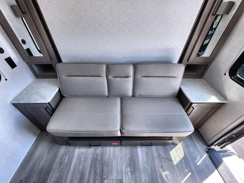 With any Transcend One travel trailer by Grand Design, you will enjoy lightweight towing thanks to their single-axle. There are many interior comforts to make camping easier than ever, such as recessed lighting, residential countertops, and a 6' 6" interior height. Each model is constructed with a heated and enclosed underbelly with suspended tanks, a moisture barrier floor enclosure, and Thermofoil over the roof and front cap for added protection. And a JBL sound system will let you listen to tunes as you visit under the power awning with a Fusion light!