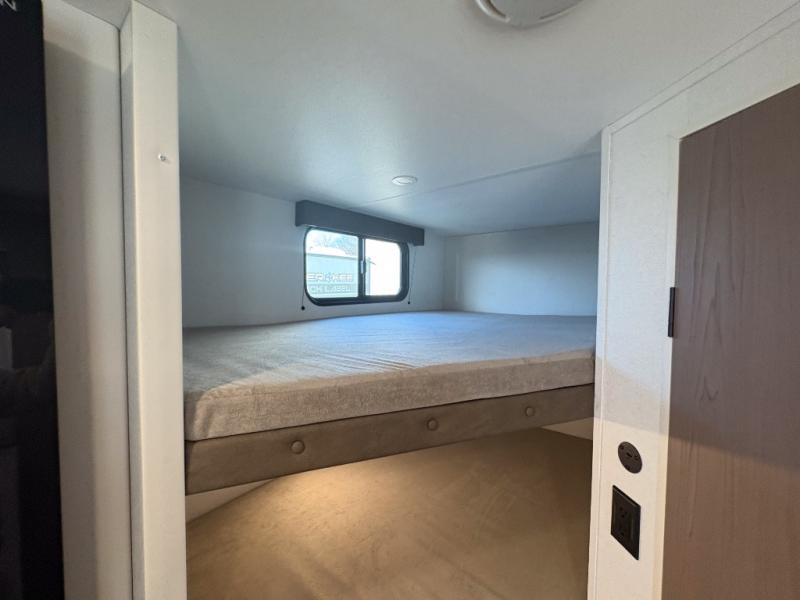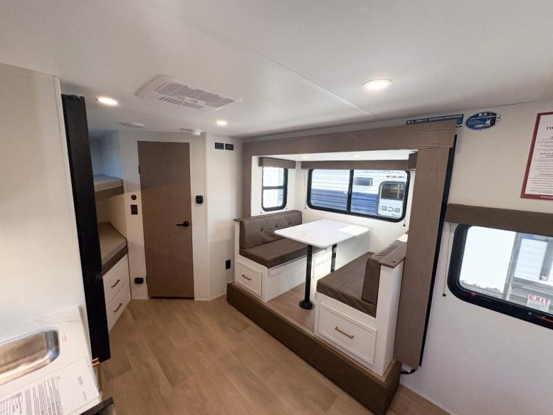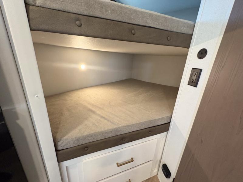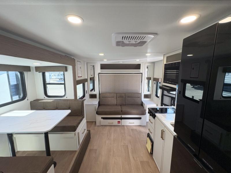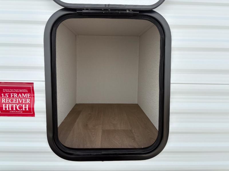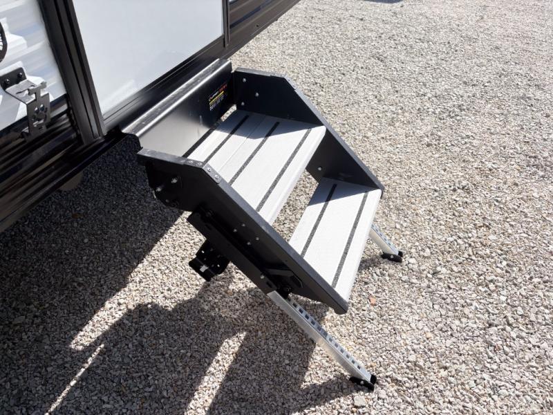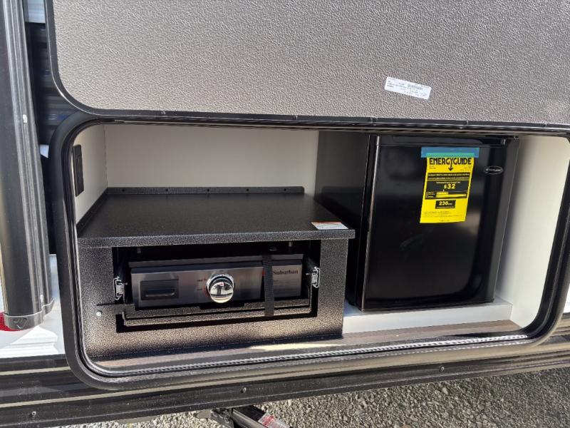 Spacious and versatile, this travel trailer is perfect for getaways to the campground or relaxing escapes by the lake! There is a front Murphy bed with storage on both sides plus a pull-out pet dish to keep your furry friends happy. Your guests or little ones will love the double-size bunks, and the full bath is right next to the bunks for easy nighttime use. Once you make breakfast on the two burner range, you can dine at the booth dinette slide. And this model also includes an outdoor griddle and refrigerator if you want to make breakfast outdoors. Additional exterior features include a 16' power awning, an interior/exterior table, and a pass-thru storage for larger camp gear.