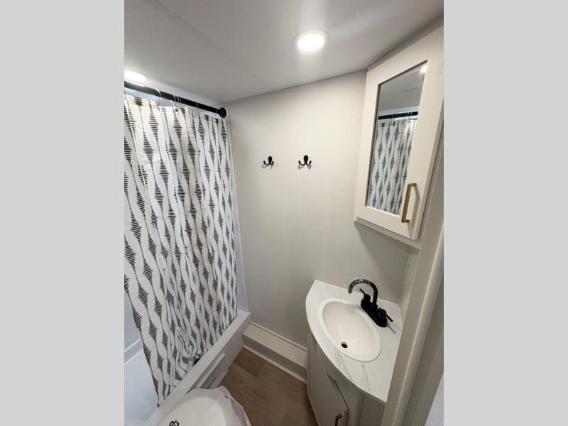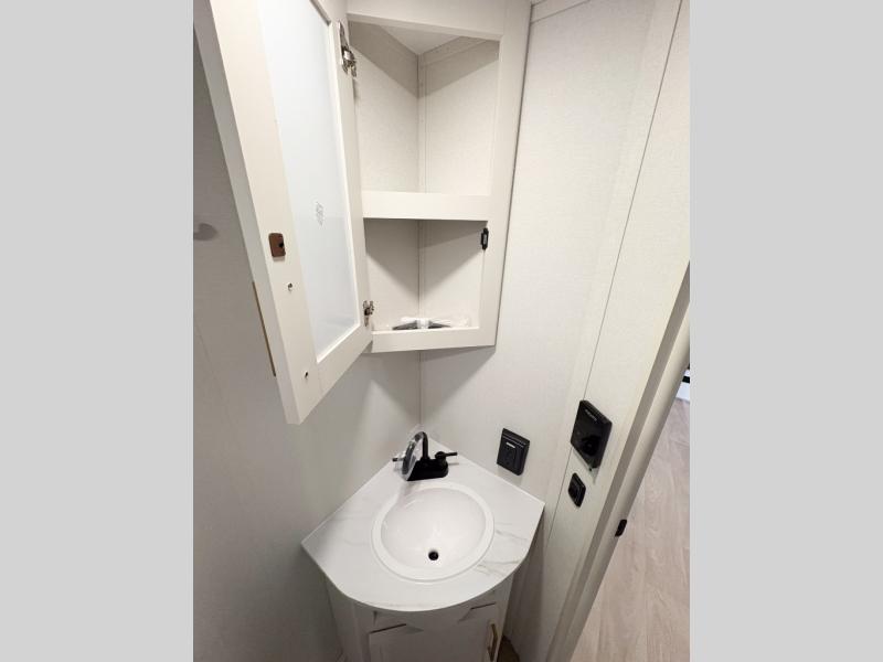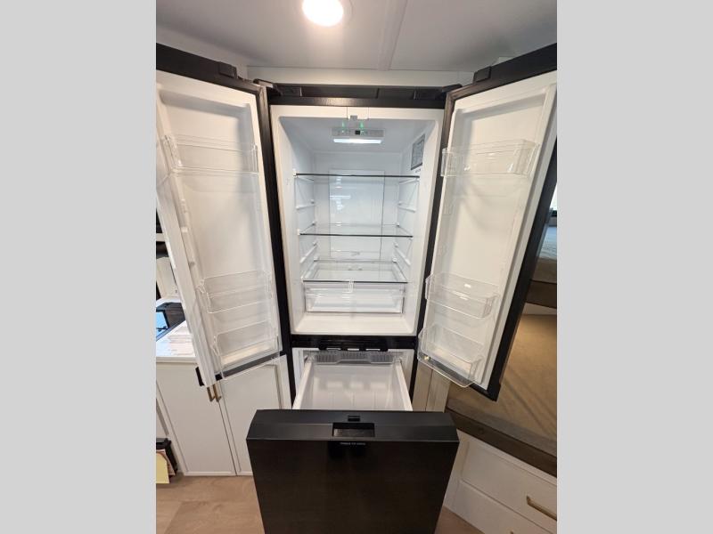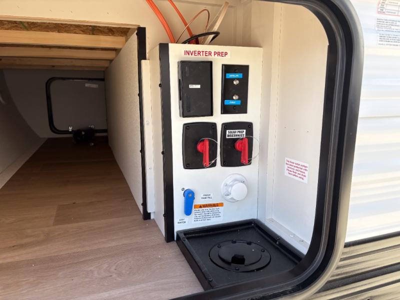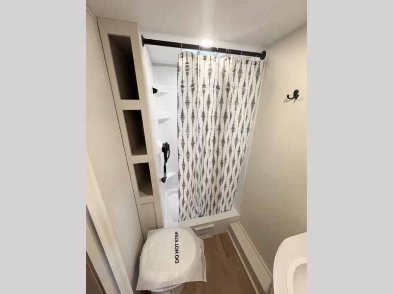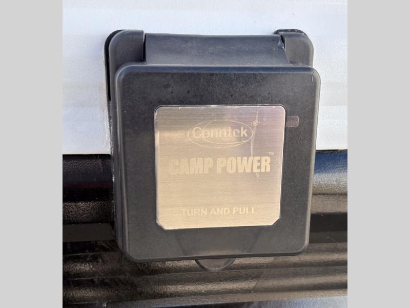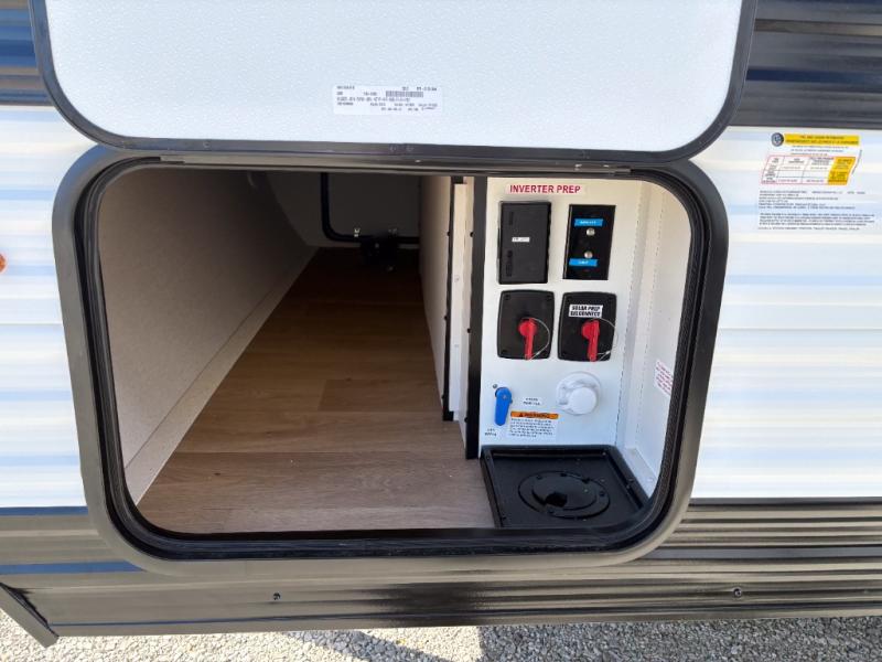 Spacious and versatile, this travel trailer is perfect for getaways to the campground or relaxing escapes by the lake! There is a front Murphy bed with storage on both sides plus a pull-out pet dish to keep your furry friends happy. Your guests or little ones will love the double-size bunks, and the full bath is right next to the bunks for easy nighttime use. Once you make breakfast on the two burner range, you can dine at the booth dinette slide. And this model also includes an outdoor griddle and refrigerator if you want to make breakfast outdoors. Additional exterior features include a 16' power awning, an interior/exterior table, and a pass-thru storage for larger camp gear.