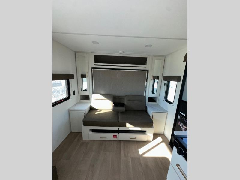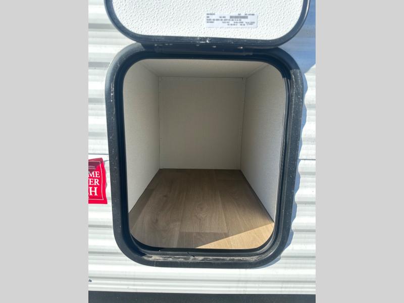 Spacious and versatile, this travel trailer is perfect for getaways to the campground or relaxing escapes by the lake! There is a front Murphy bed with storage on both sides plus a pull-out pet dish to keep your furry friends happy. Your guests or little ones will love the double-size bunks, and the full bath is right next to the bunks for easy nighttime use. Once you make breakfast on the two burner range, you can dine at the booth dinette slide. And this model also includes an outdoor griddle and refrigerator if you want to make breakfast outdoors. Additional exterior features include a 16' power awning, an interior/exterior table, and a pass-thru storage for larger camp gear.
