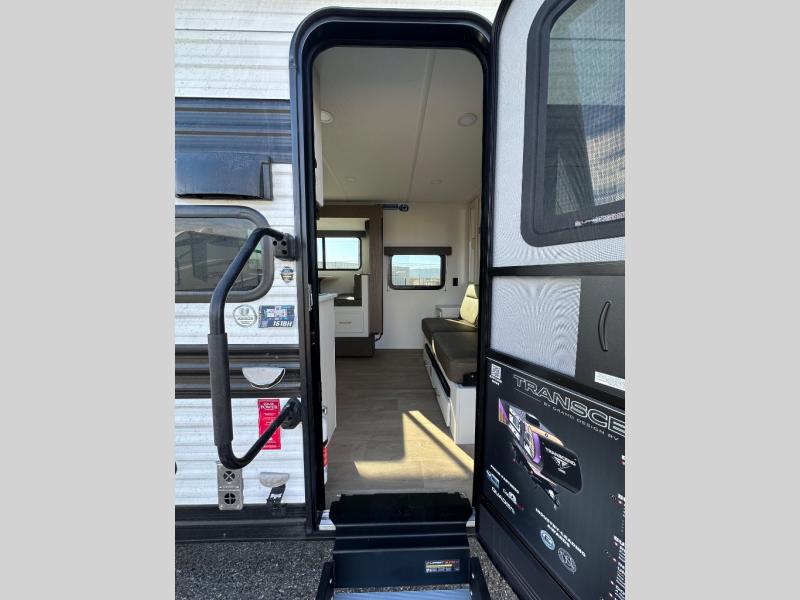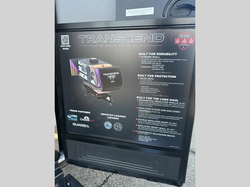 With any Transcend One travel trailer by Grand Design, you will enjoy lightweight towing thanks to their single-axle. There are many interior comforts to make camping easier than ever, such as recessed lighting, residential countertops, and a 6' 6" interior height. Each model is constructed with a heated and enclosed underbelly with suspended tanks, a moisture barrier floor enclosure, and Thermofoil over the roof and front cap for added protection. And a JBL sound system will let you listen to tunes as you visit under the power awning with a Fusion light!