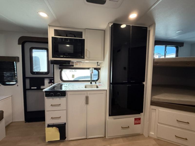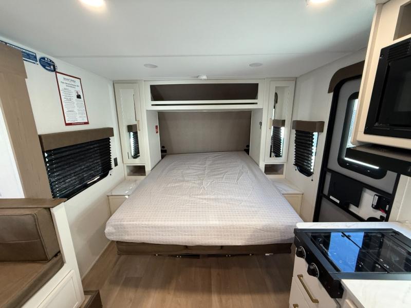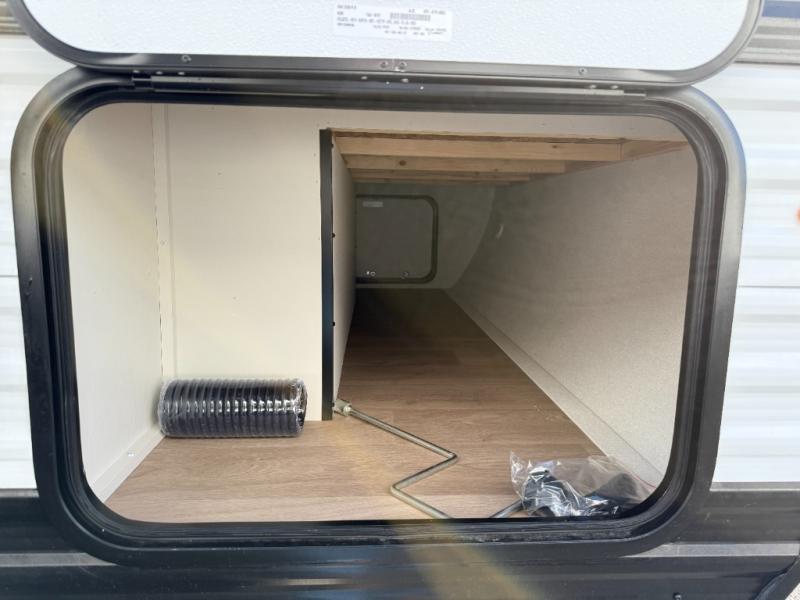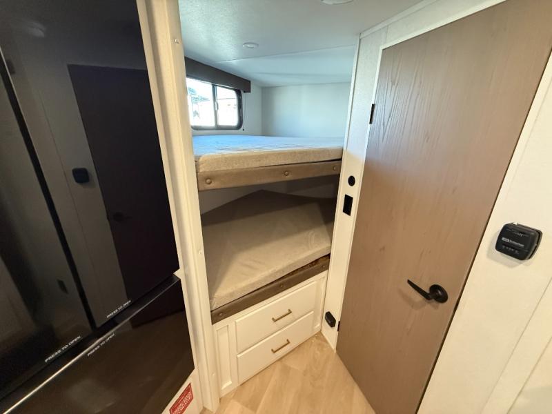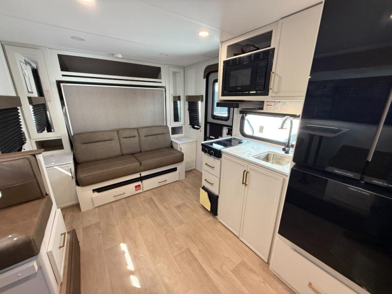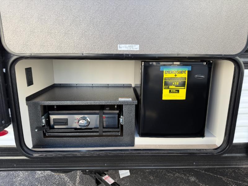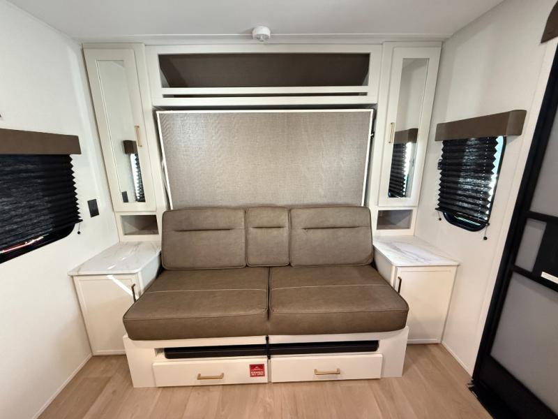 Spacious and versatile, this travel trailer is perfect for getaways to the campground or relaxing escapes by the lake! There is a front Murphy bed with storage on both sides plus a pull-out pet dish to keep your furry friends happy. Your guests or little ones will love the double-size bunks, and the full bath is right next to the bunks for easy nighttime use. Once you make breakfast on the two burner range, you can dine at the booth dinette slide. And this model also includes an outdoor griddle and refrigerator if you want to make breakfast outdoors. Additional exterior features include a 16' power awning, an interior/exterior table, and a pass-thru storage for larger camp gear.