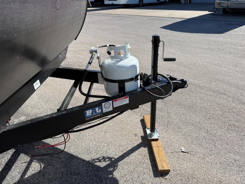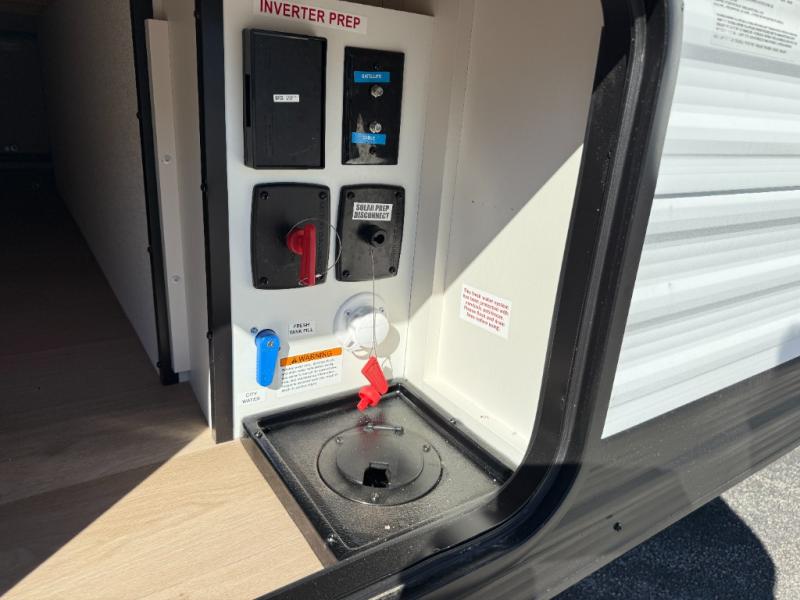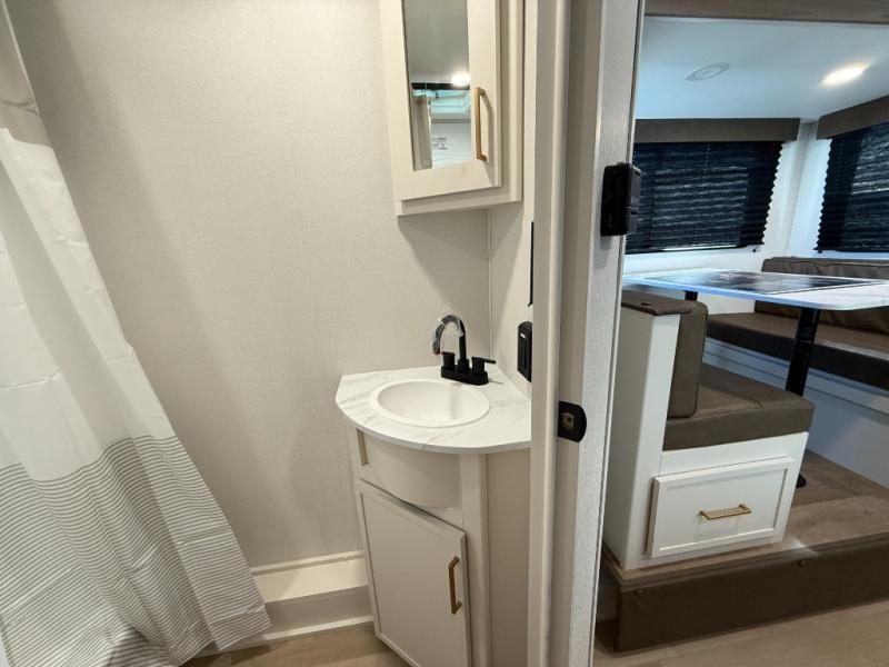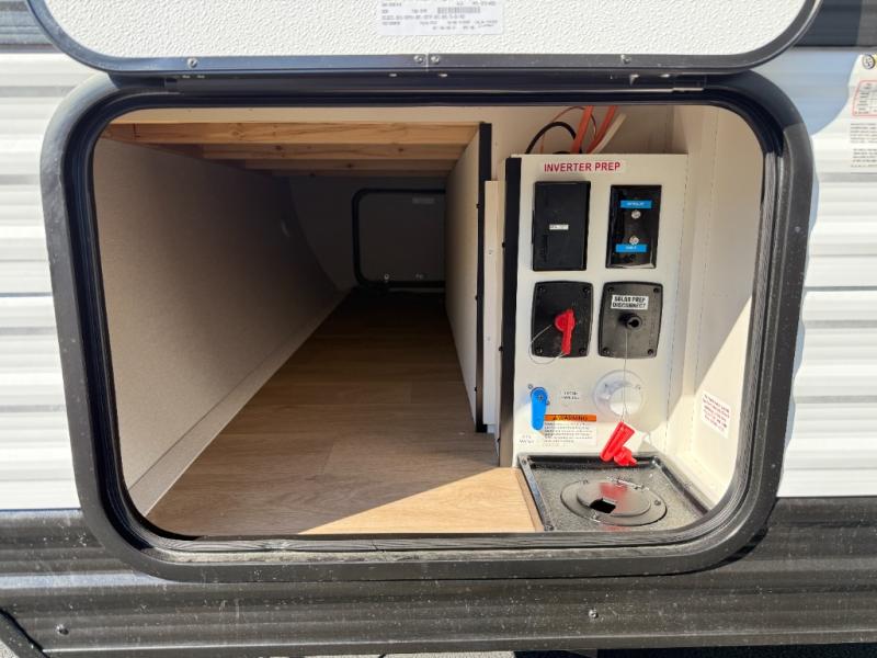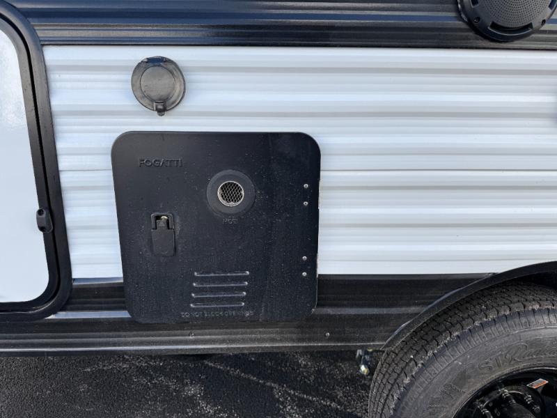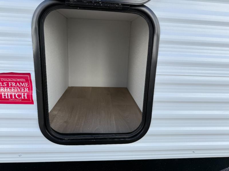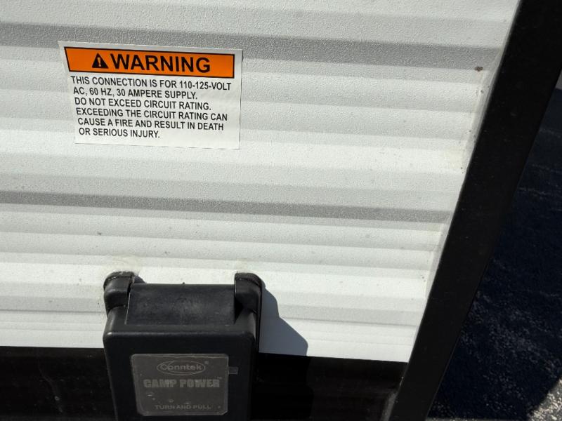 Spacious and versatile, this travel trailer is perfect for getaways to the campground or relaxing escapes by the lake! There is a front Murphy bed with storage on both sides plus a pull-out pet dish to keep your furry friends happy. Your guests or little ones will love the double-size bunks, and the full bath is right next to the bunks for easy nighttime use. Once you make breakfast on the two burner range, you can dine at the booth dinette slide. And this model also includes an outdoor griddle and refrigerator if you want to make breakfast outdoors. Additional exterior features include a 16' power awning, an interior/exterior table, and a pass-thru storage for larger camp gear.