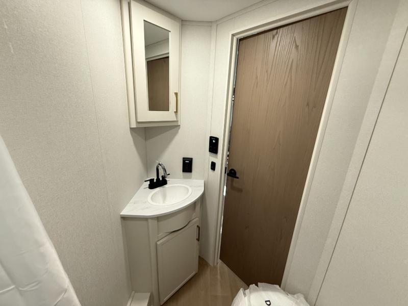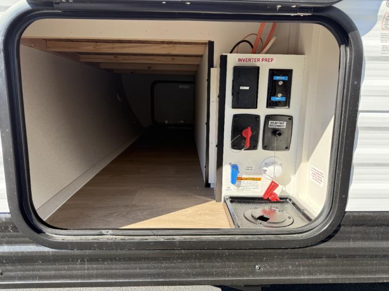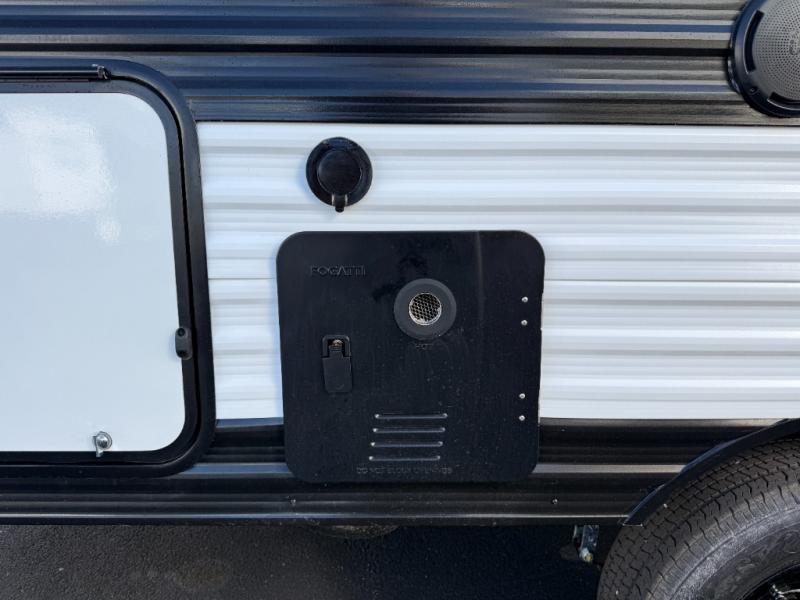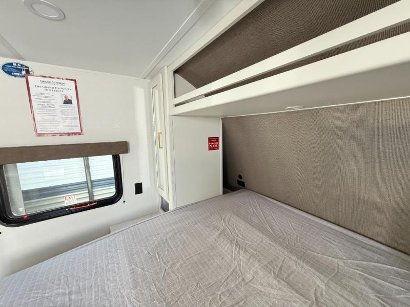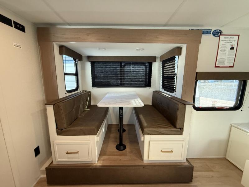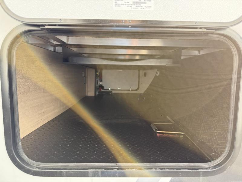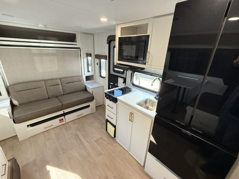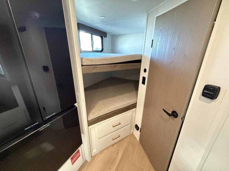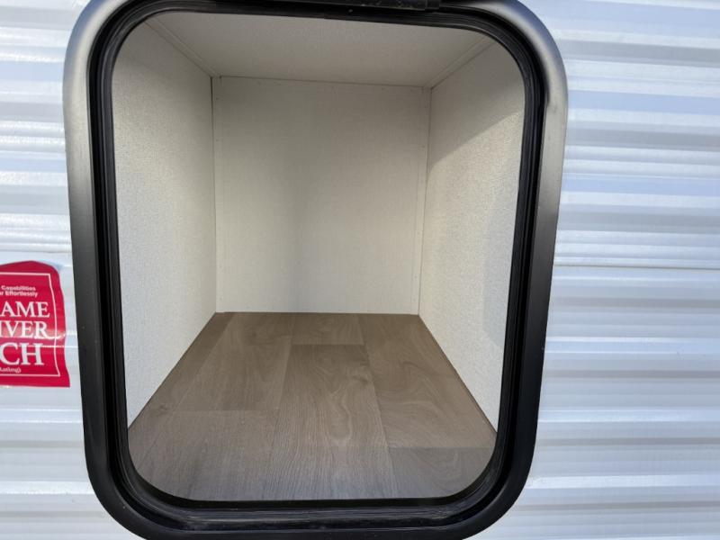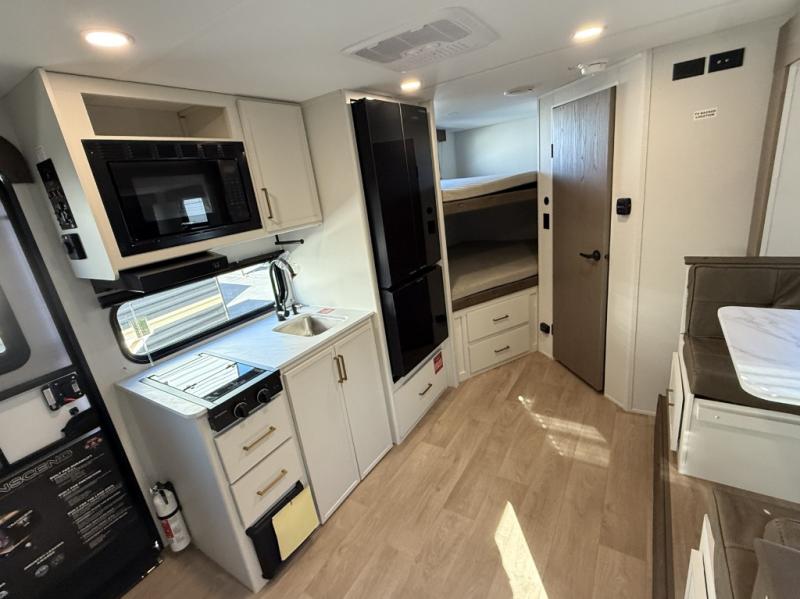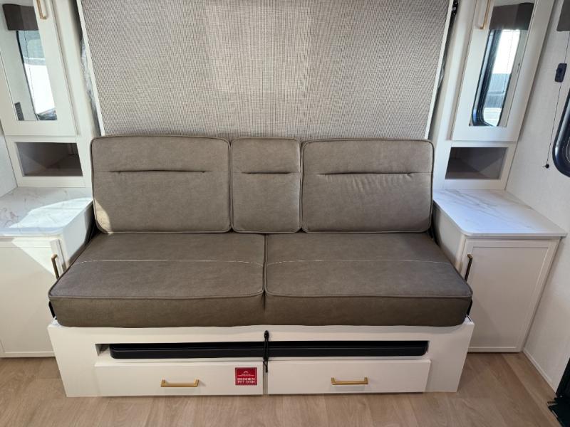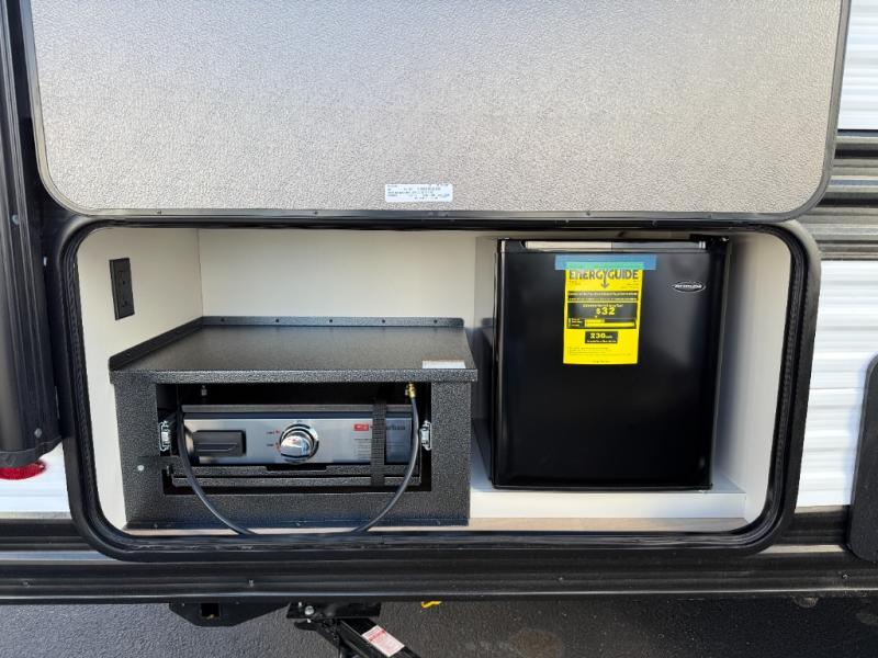Spacious and versatile, this travel trailer is perfect for getaways to the campground or relaxing escapes by the lake! There is a front Murphy bed with storage on both sides plus a pull-out pet dish to keep your furry friends happy. Your guests or little ones will love the double-size bunks, and the full bath is right next to the bunks for easy nighttime use. Once you make breakfast on the two burner range, you can dine at the booth dinette slide. And this model also includes an outdoor griddle and refrigerator if you want to make breakfast outdoors. Additional exterior features include a 16' power awning, an interior/exterior table, and a pass-thru storage for larger camp gear.
