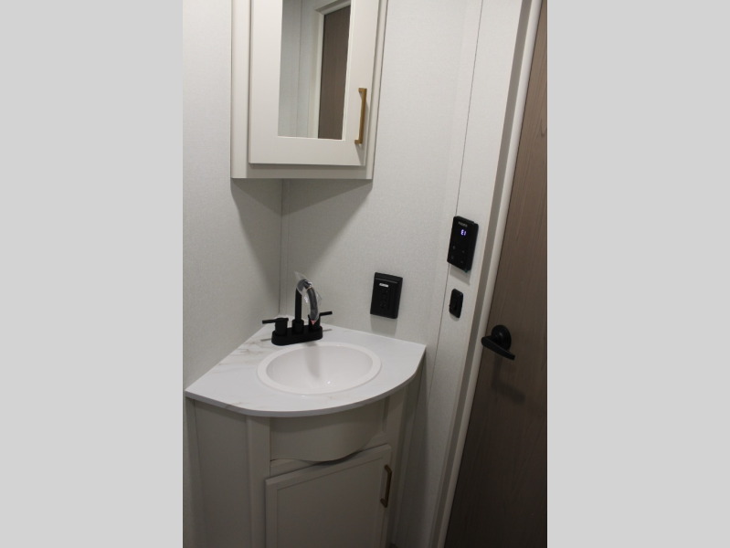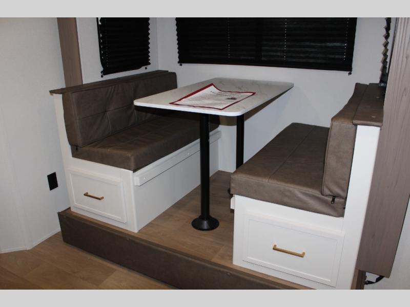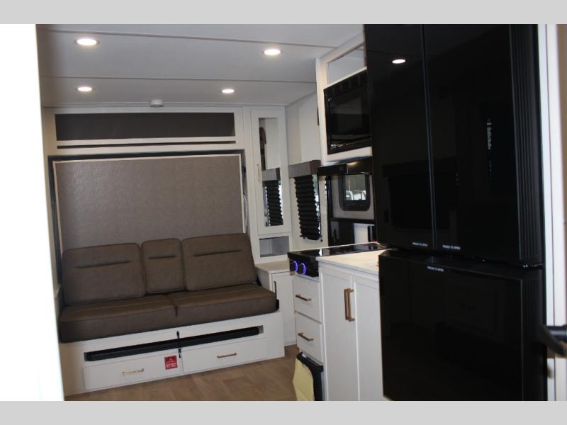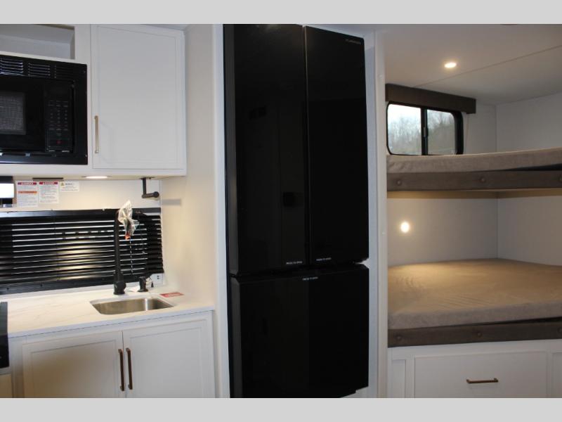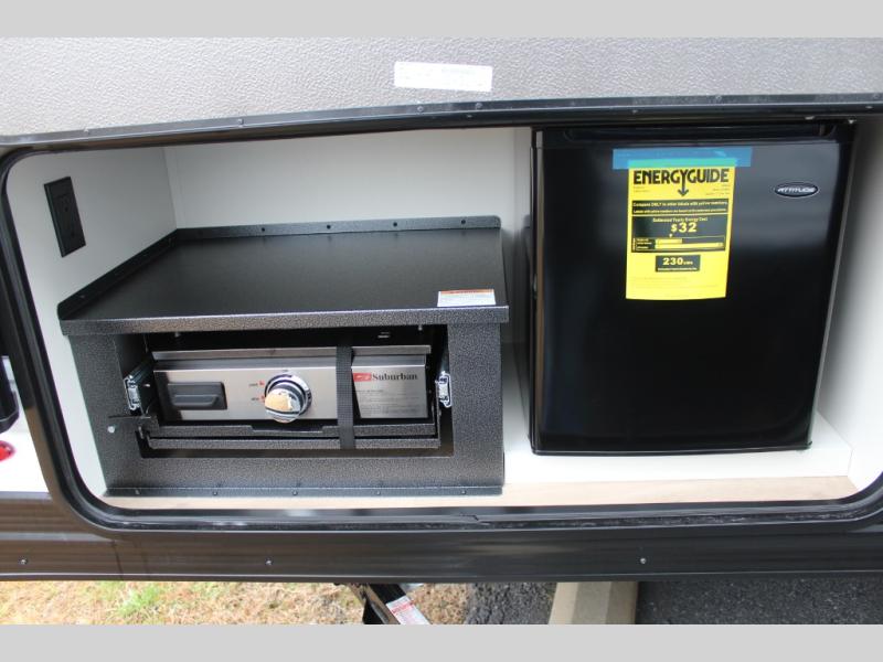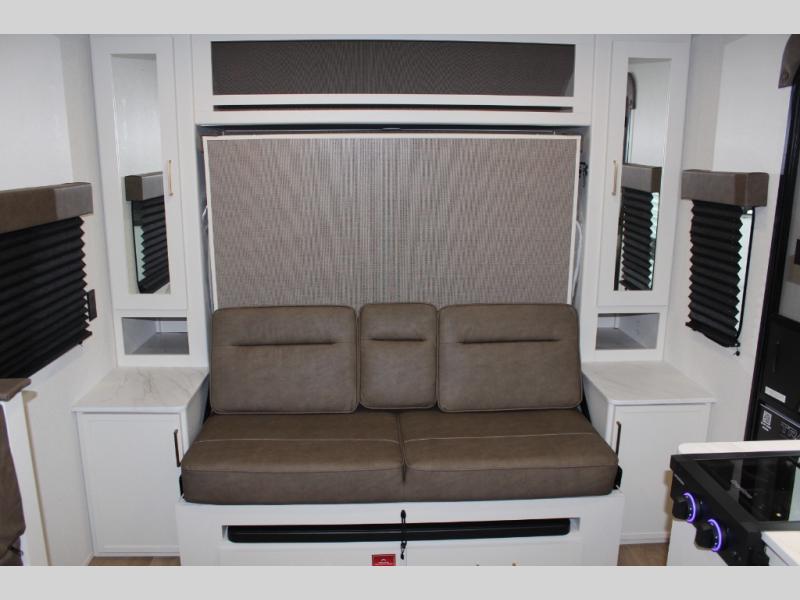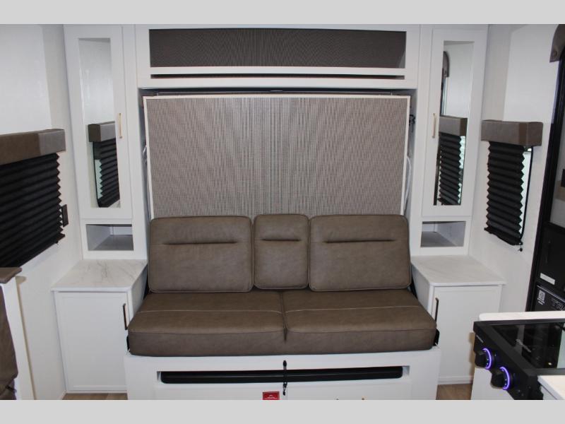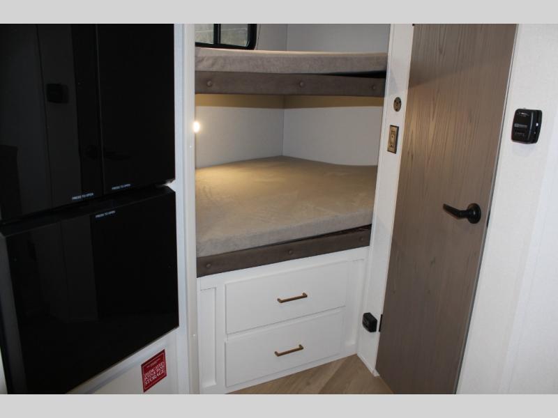 Spacious and versatile, this travel trailer is perfect for getaways to the campground or relaxing escapes by the lake! There is a front Murphy bed with storage on both sides plus a pull-out pet dish to keep your furry friends happy. Your guests or little ones will love the double-size bunks, and the full bath is right next to the bunks for easy nighttime use. Once you make breakfast on the two burner range, you can dine at the booth dinette slide. And this model also includes an outdoor griddle and refrigerator if you want to make breakfast outdoors. Additional exterior features include a 16' power awning, an interior/exterior table, and a pass-thru storage for larger camp gear.