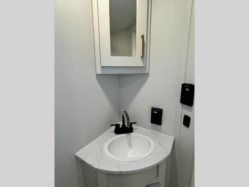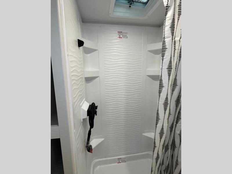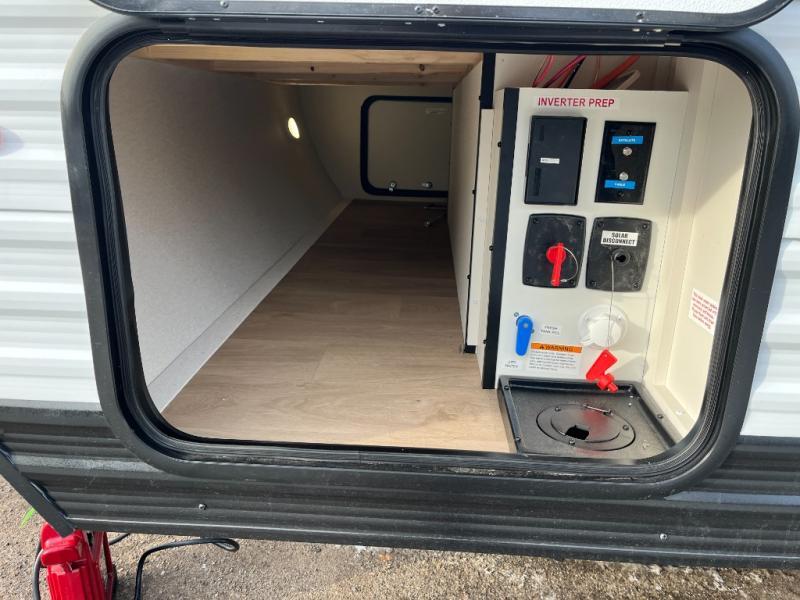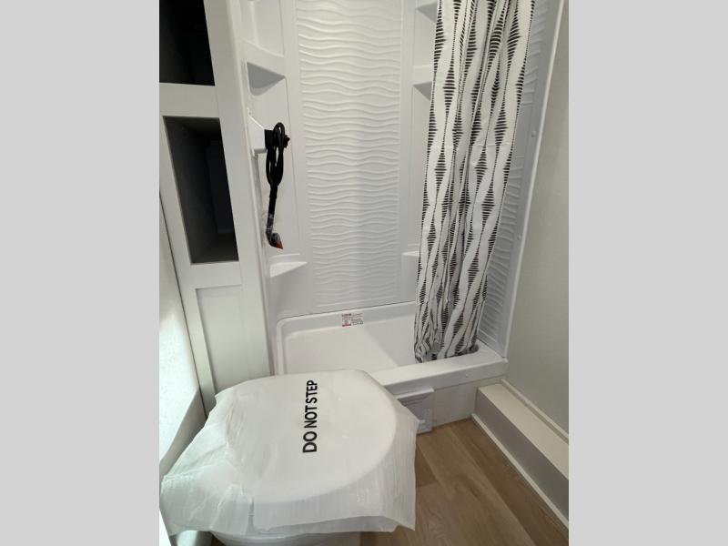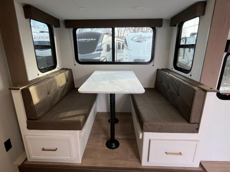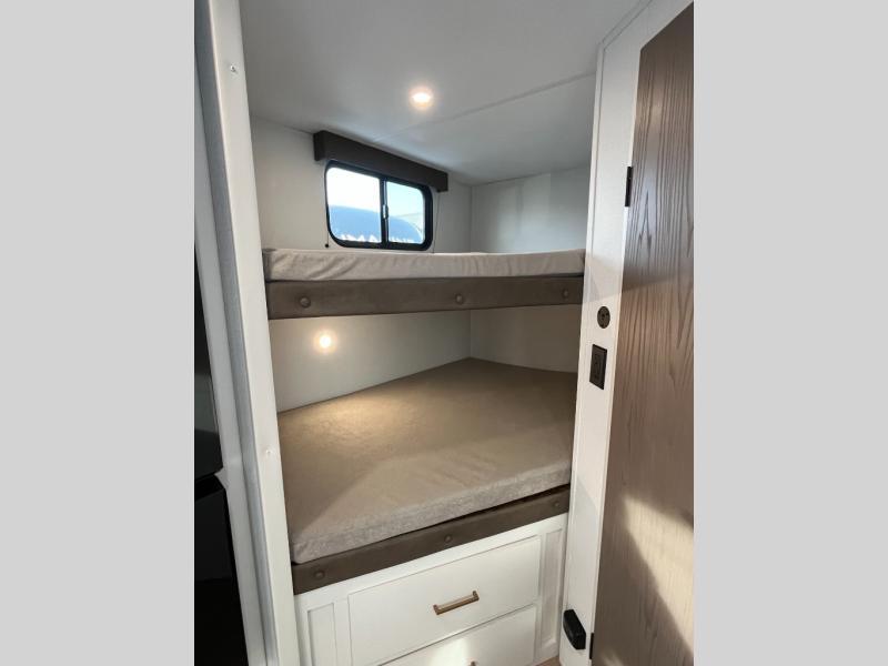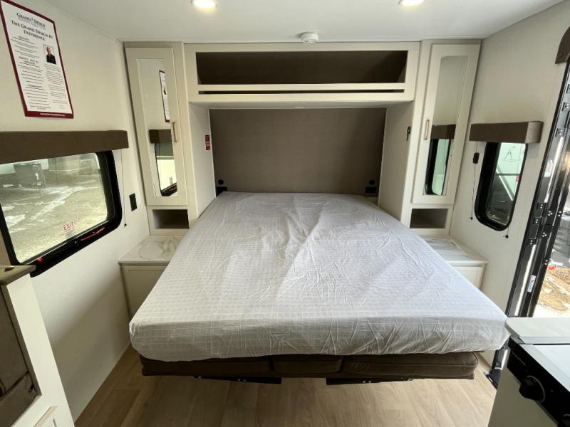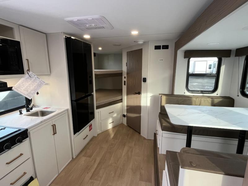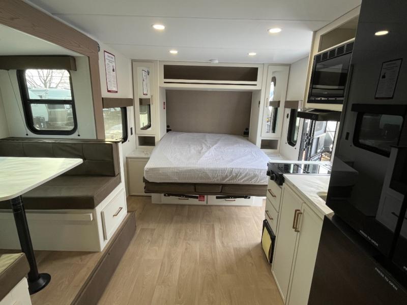 Spacious and versatile, this travel trailer is perfect for getaways to the campground or relaxing escapes by the lake! There is a front Murphy bed with storage on both sides plus a pull-out pet dish to keep your furry friends happy. Your guests or little ones will love the double-size bunks, and the full bath is right next to the bunks for easy nighttime use. Once you make breakfast on the two burner range, you can dine at the booth dinette slide. And this model also includes an outdoor griddle and refrigerator if you want to make breakfast outdoors. Additional exterior features include a 16' power awning, an interior/exterior table, and a pass-thru storage for larger camp gear.