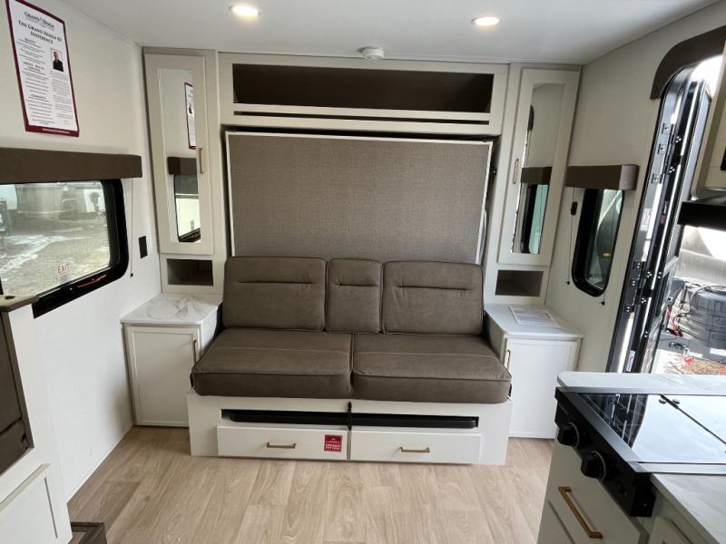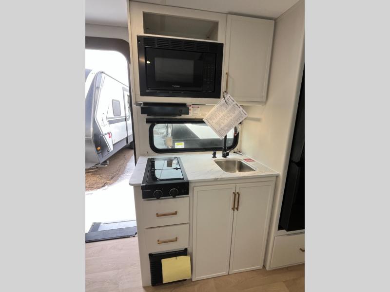 With any Transcend One travel trailer by Grand Design, you will enjoy lightweight towing thanks to their single-axle. There are many interior comforts to make camping easier than ever, such as recessed lighting, residential countertops, and a 6' 6" interior height. Each model is constructed with a heated and enclosed underbelly with suspended tanks, a moisture barrier floor enclosure, and Thermofoil over the roof and front cap for added protection. And a JBL sound system will let you listen to tunes as you visit under the power awning with a Fusion light!
