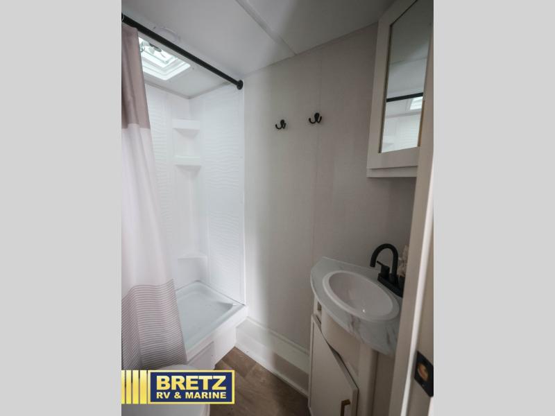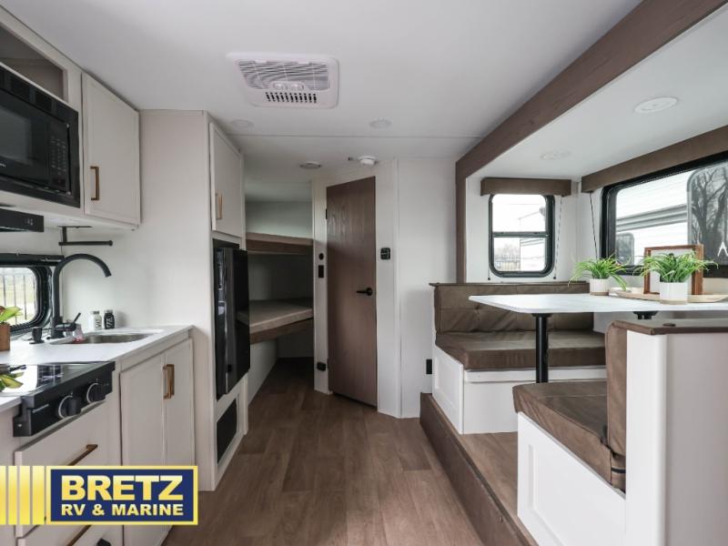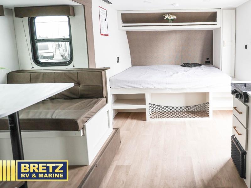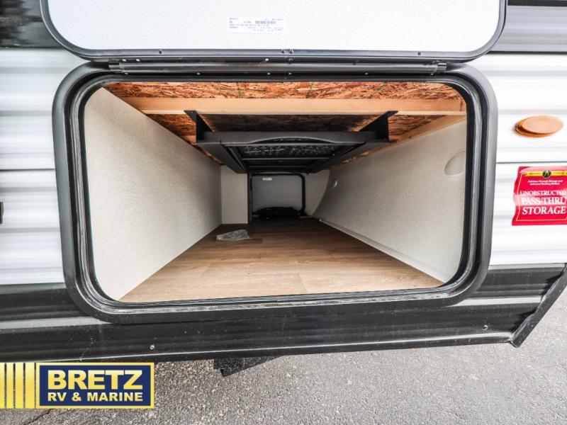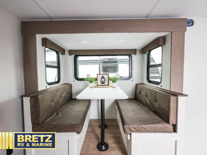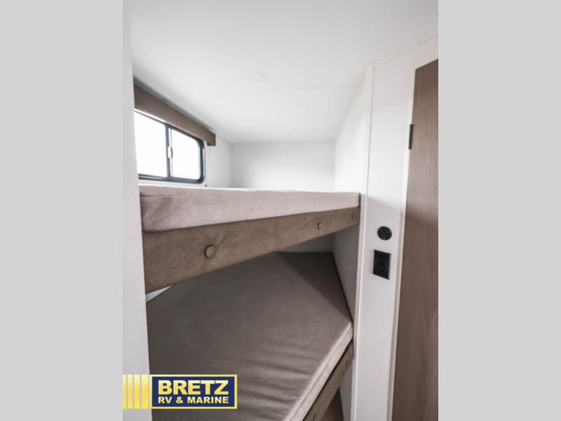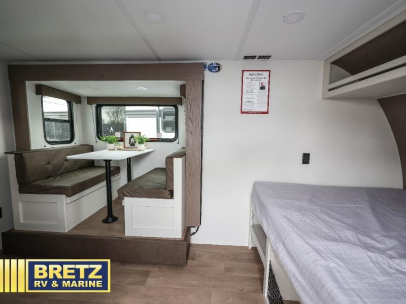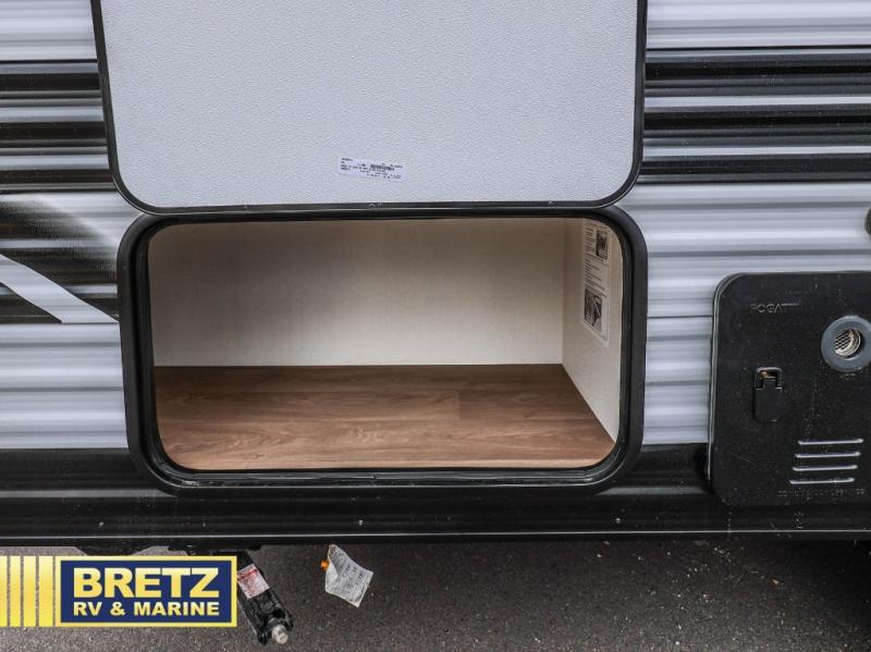 Spacious and versatile, this travel trailer is perfect for getaways to the campground or relaxing escapes by the lake! There is a front Murphy bed with storage on both sides plus a pull-out pet dish to keep your furry friends happy. Your guests or little ones will love the double-size bunks, and the full bath is right next to the bunks for easy nighttime use. Once you make breakfast on the two burner range, you can dine at the booth dinette slide. And this model also includes an outdoor griddle and refrigerator if you want to make breakfast outdoors. Additional exterior features include a 16' power awning, an interior/exterior table, and a pass-thru storage for larger camp gear.