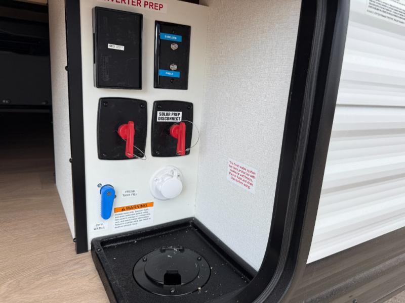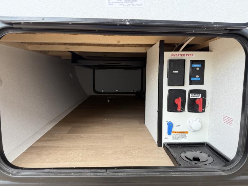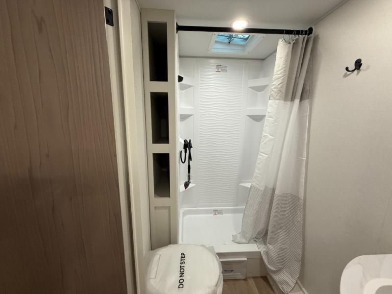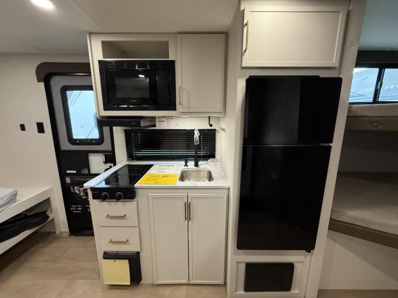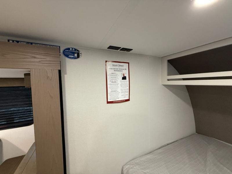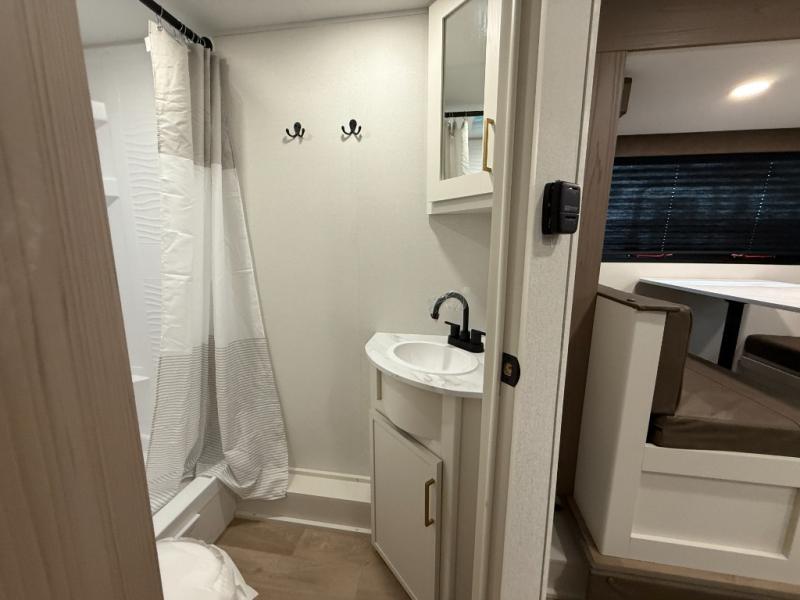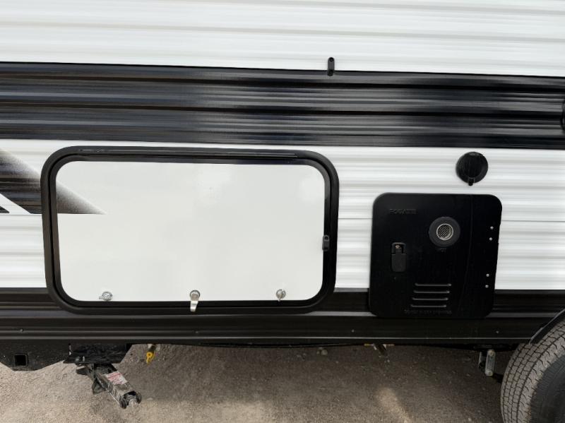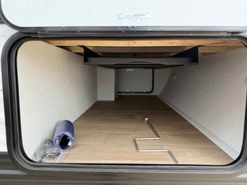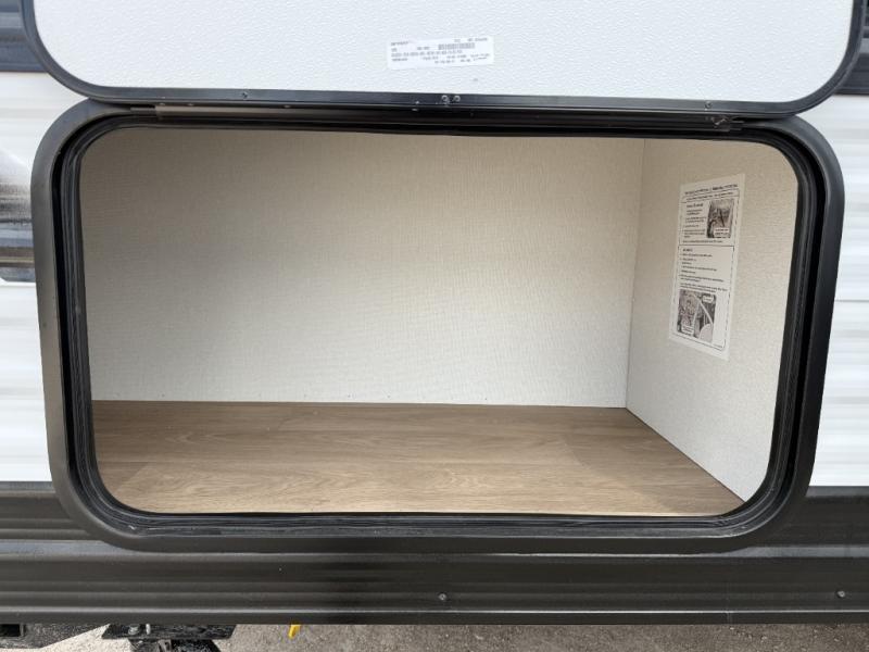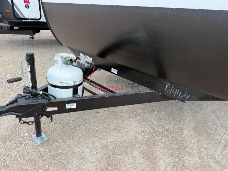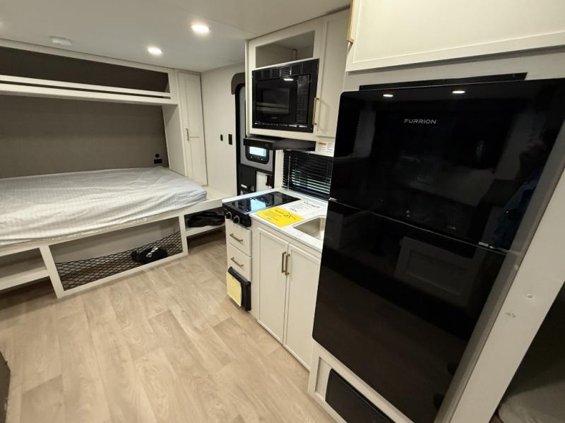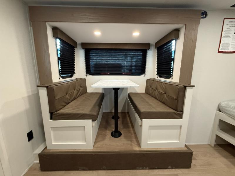 This travel trailer is perfect for getaways to the campground or relaxing escapes by the lake! There is a front queen bed with generous storage both above and below. Your guests or little ones will love the double-size bunks, and the full bath is right next to the bunks for easy nighttime use. Once you make breakfast on the two-burner range, you can dine at the booth dinette slide. An interior/exterior table provides more dining space when you need it, and a 15' power awning with a fusion light lets you stay up late to visit with friends!