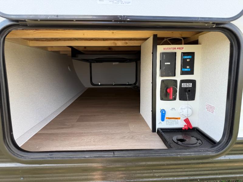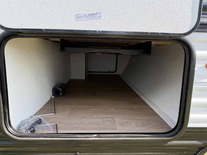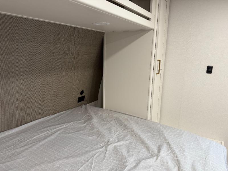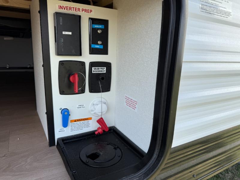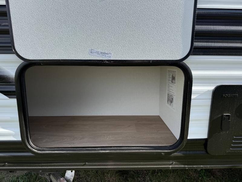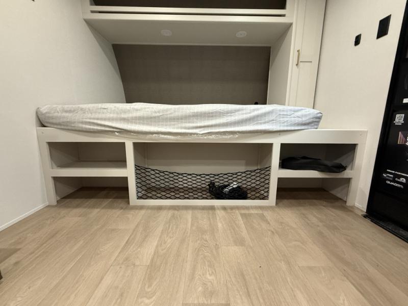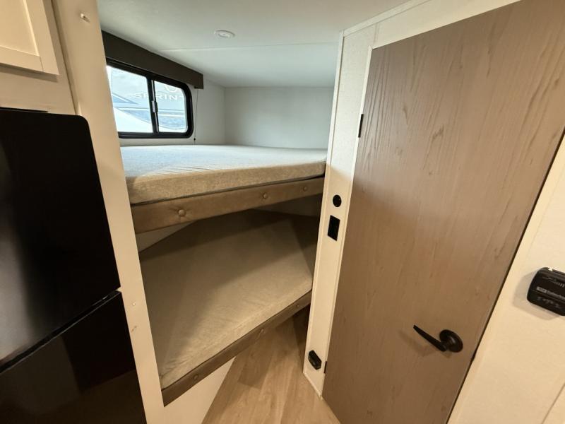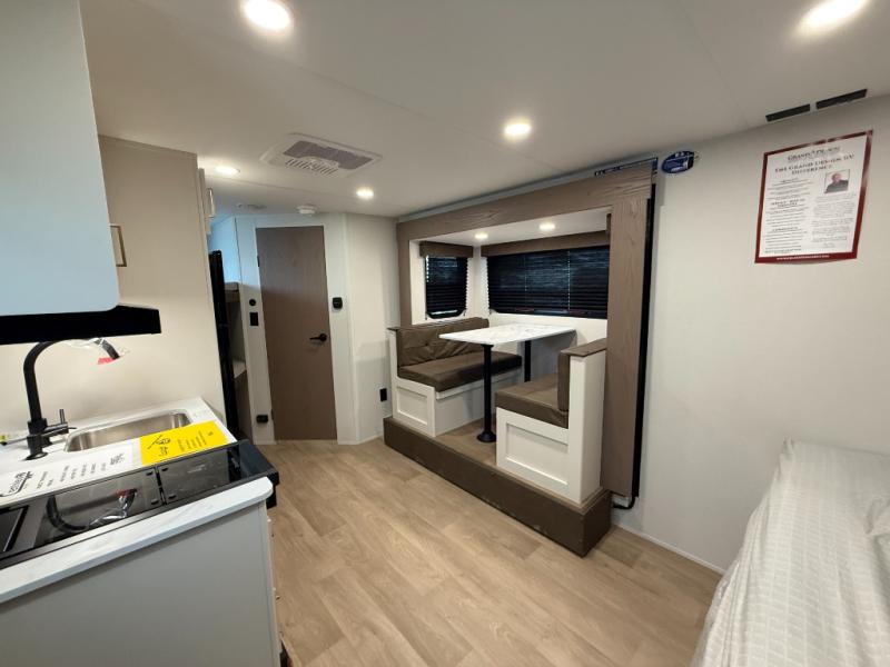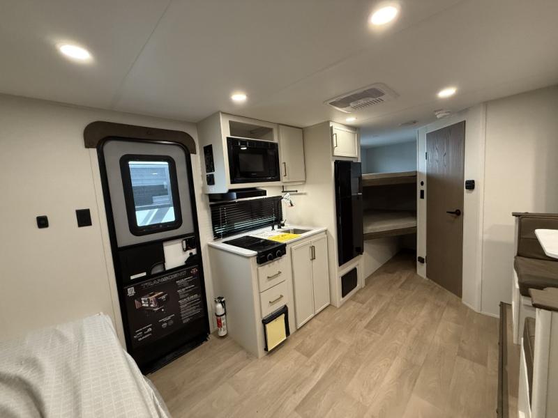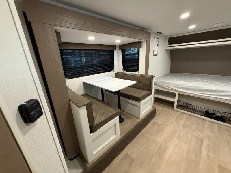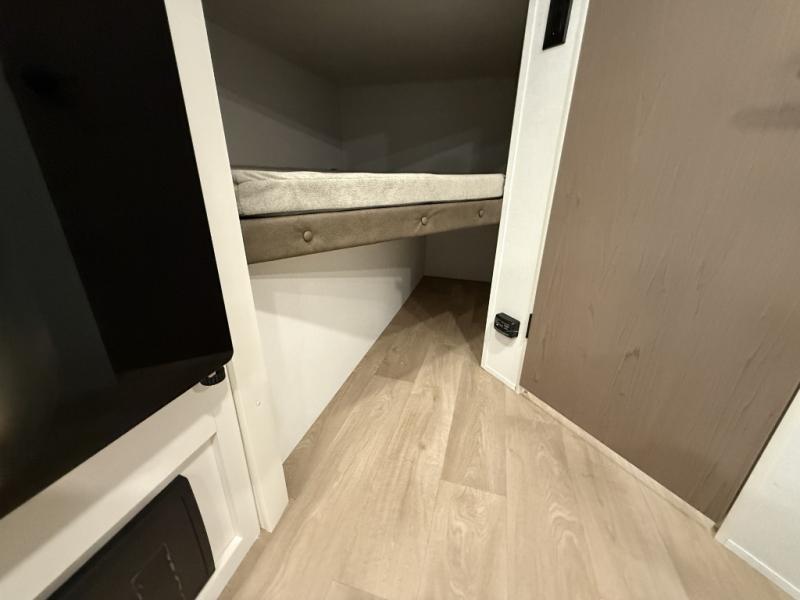 This travel trailer is perfect for getaways to the campground or relaxing escapes by the lake! There is a front queen bed with generous storage both above and below. Your guests or little ones will love the double-size bunks, and the full bath is right next to the bunks for easy nighttime use. Once you make breakfast on the two-burner range, you can dine at the booth dinette slide. An interior/exterior table provides more dining space when you need it, and a 15' power awning with a fusion light lets you stay up late to visit with friends!