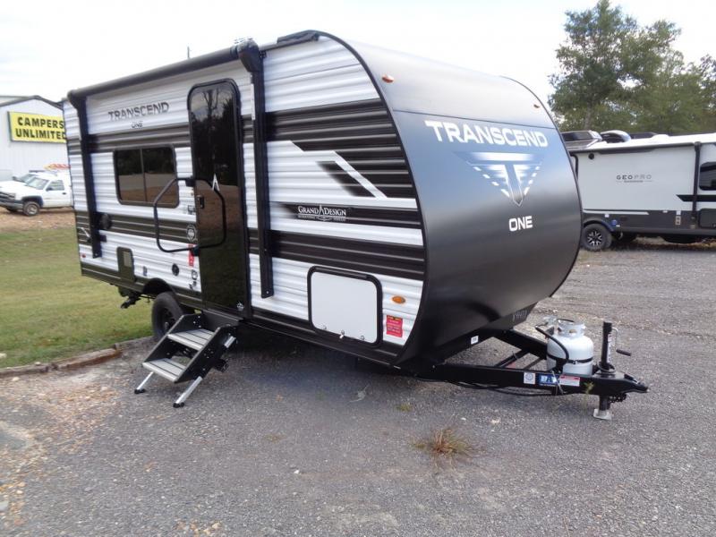 With any Transcend One travel trailer by Grand Design, you will enjoy lightweight towing thanks to their single-axle. There are many interior comforts to make camping easier than ever, such as recessed lighting, residential countertops, and a 6' 6" interior height. Each model is constructed with a heated and enclosed underbelly with suspended tanks, a moisture barrier floor enclosure, and Thermofoil over the roof and front cap for added protection. And a JBL sound system will let you listen to tunes as you visit under the power awning with a Fusion light!