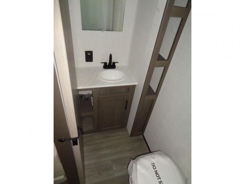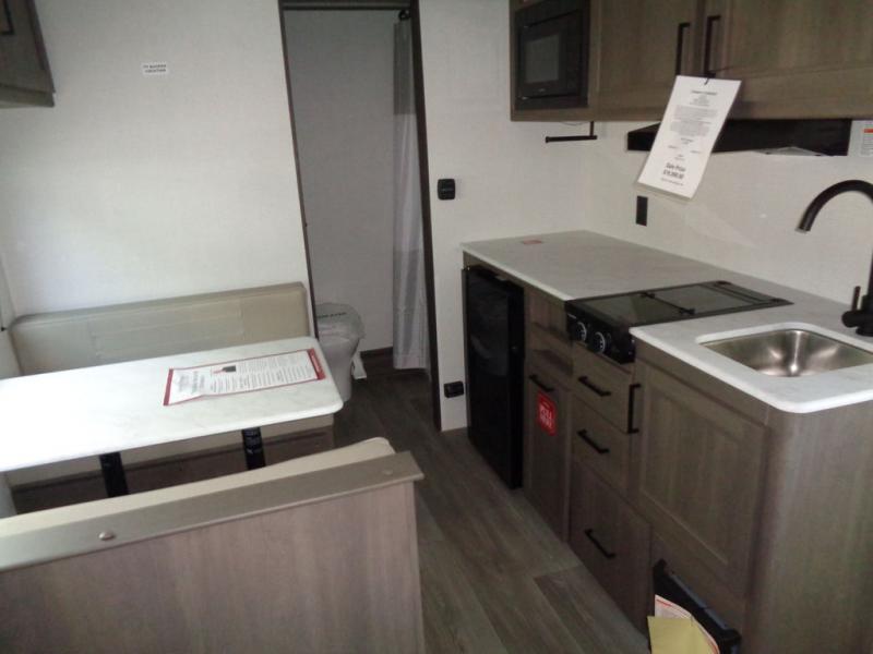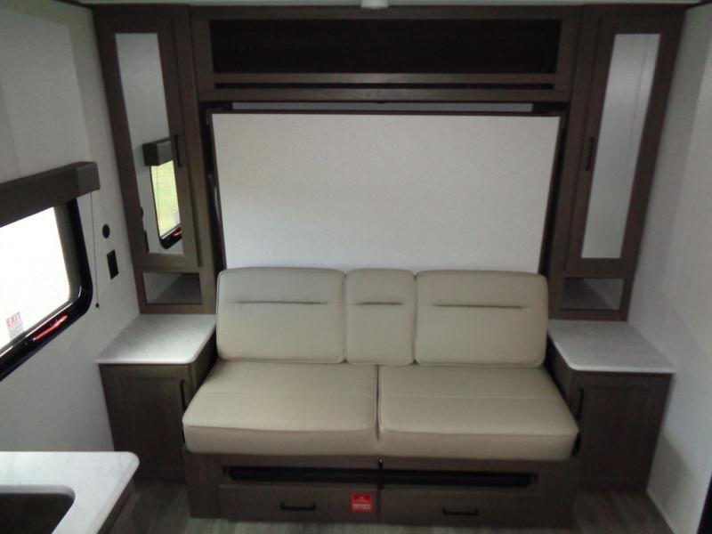 This is the perfect couple's trailer with versatile seating and sleeping space! You'll find a queen-size Murphy bed up front with storage space beside and above plus a full rear bath for added privacy. Once you've made lunch in the full kitchen, you can dine at the booth dinette or take your plate outdoors to sit under the 10' power awning. You'll also find pass-thru storage outside that will be perfect for fishing poles, lawn chairs, tools and more!