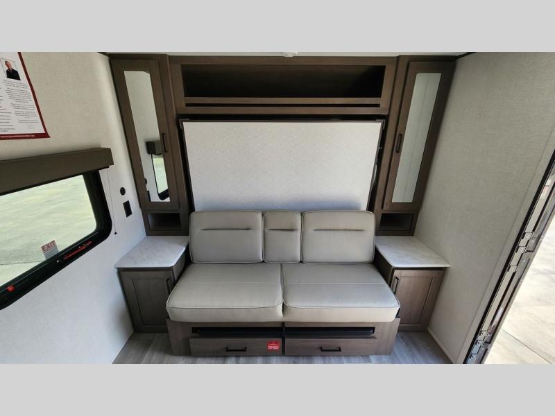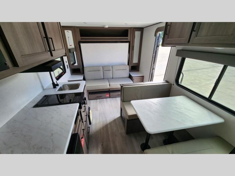 This is the perfect couple's trailer with versatile seating and sleeping space! You'll find a queen-size Murphy bed up front with storage space beside and above plus a full rear bath for added privacy. Once you've made lunch in the full kitchen, you can dine at the booth dinette or take your plate outdoors to sit under the 10' power awning. You'll also find pass-thru storage outside that will be perfect for fishing poles, lawn chairs, tools and more!