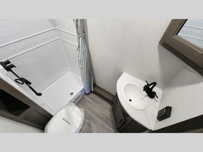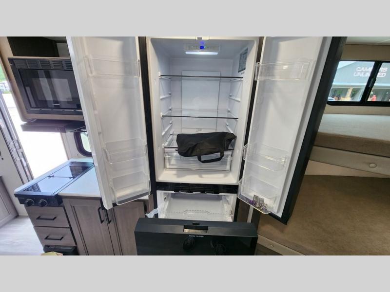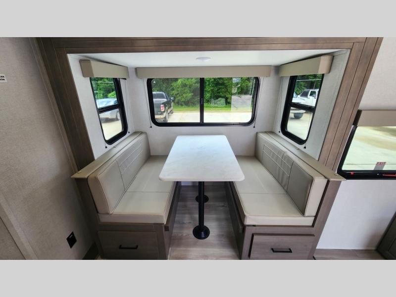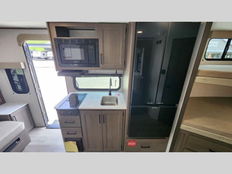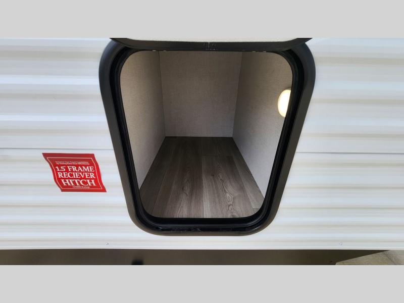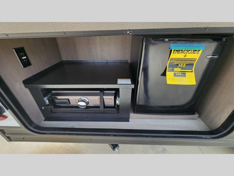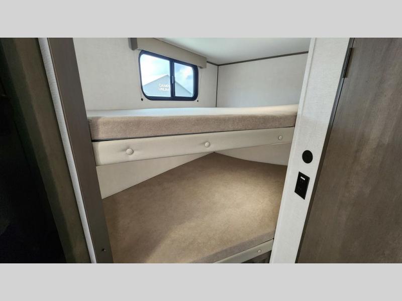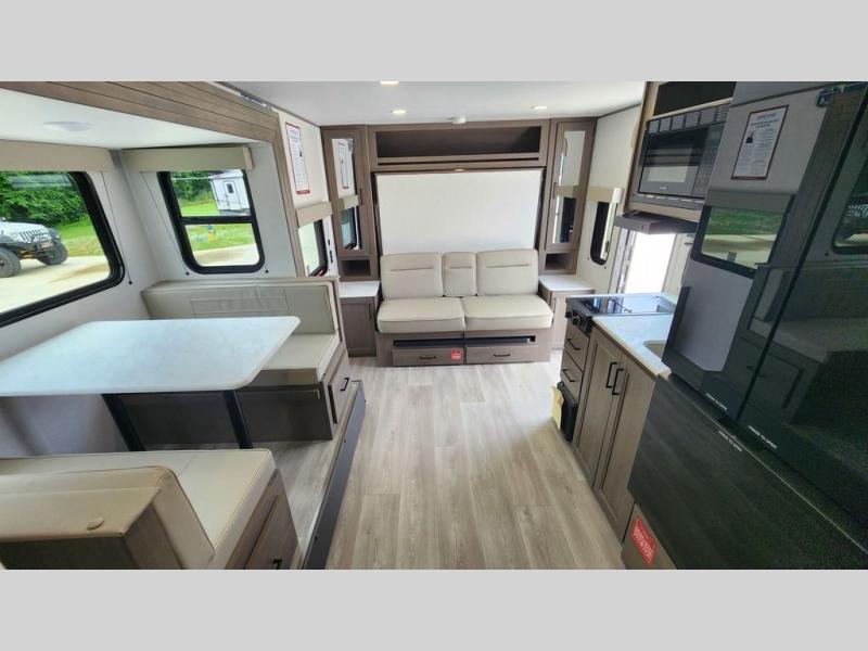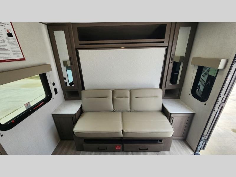 Spacious and versatile, this travel trailer is perfect for getaways to the campground or relaxing escapes by the lake! There is a front Murphy bed with storage on both sides plus a pull-out pet dish to keep your furry friends happy. Your guests or little ones will love the double-size bunks, and the full bath is right next to the bunks for easy nighttime use. Once you make breakfast on the two burner range, you can dine at the booth dinette slide. And this model also includes an outdoor griddle and refrigerator if you want to make breakfast outdoors. Additional exterior features include a 16' power awning, an interior/exterior table, and a pass-thru storage for larger camp gear.