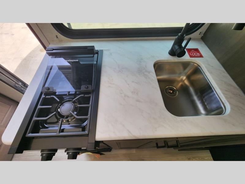 With any Transcend One travel trailer by Grand Design, you will enjoy lightweight towing thanks to their single-axle. There are many interior comforts to make camping easier than ever, such as recessed lighting, residential countertops, and a 6' 6" interior height. Each model is constructed with a heated and enclosed underbelly with suspended tanks, a moisture barrier floor enclosure, and Thermofoil over the roof and front cap for added protection. And a JBL sound system will let you listen to tunes as you visit under the power awning with a Fusion light!