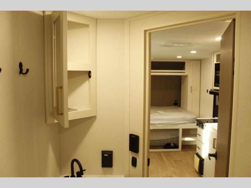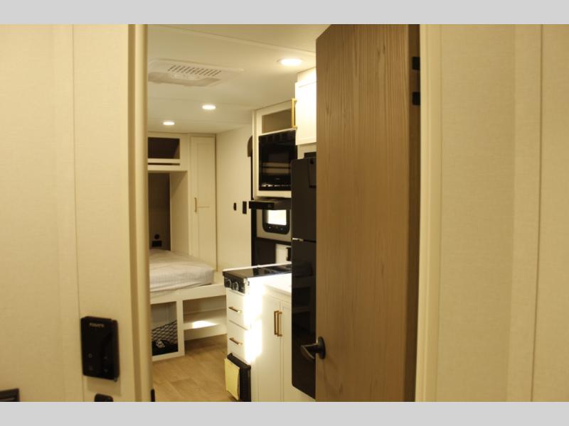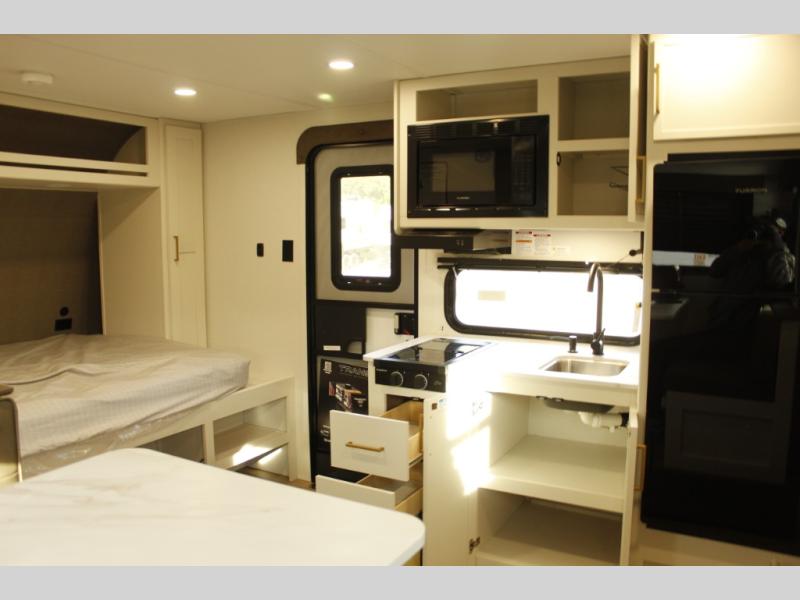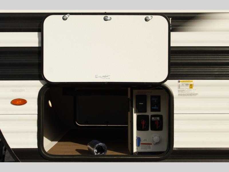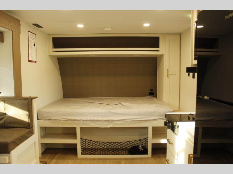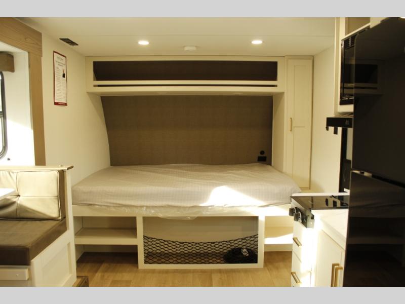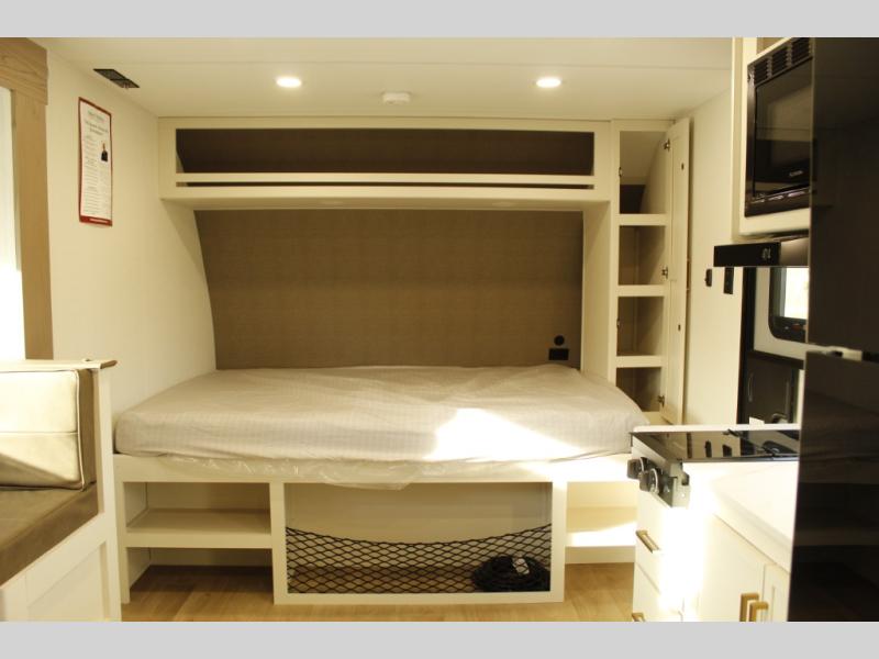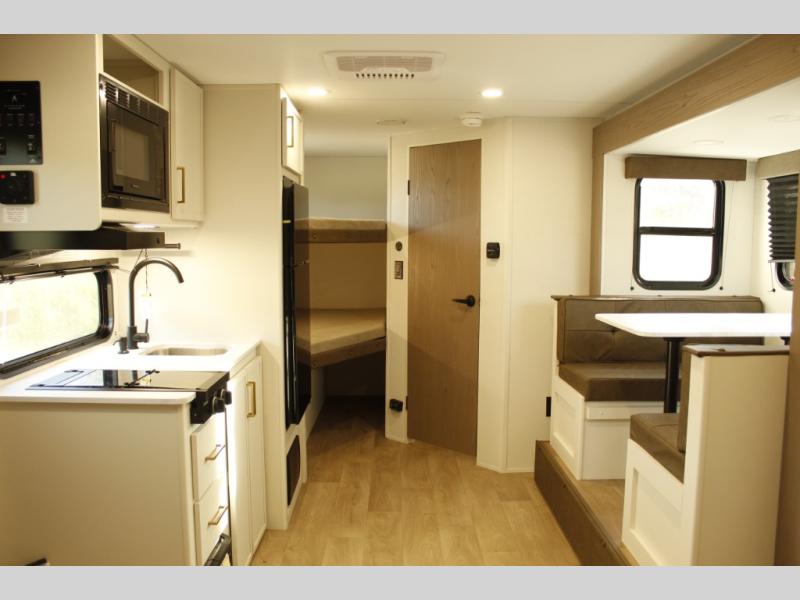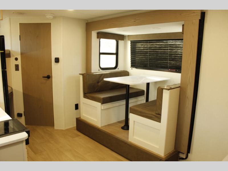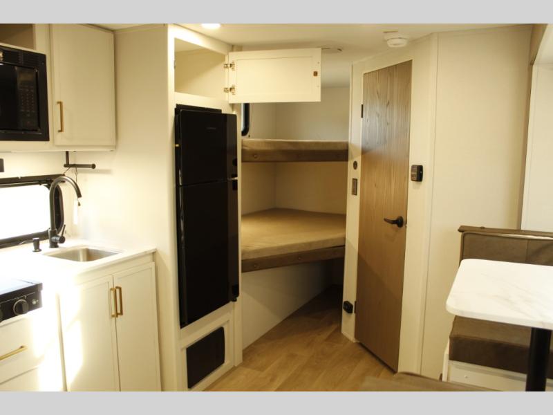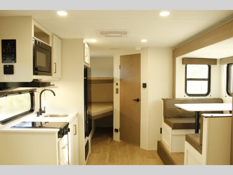 This travel trailer is perfect for getaways to the campground or relaxing escapes by the lake! There is a front queen bed with generous storage both above and below. Your guests or little ones will love the double-size bunks, and the full bath is right next to the bunks for easy nighttime use. Once you make breakfast on the two-burner range, you can dine at the booth dinette slide. An interior/exterior table provides more dining space when you need it, and a 15' power awning with a fusion light lets you stay up late to visit with friends!