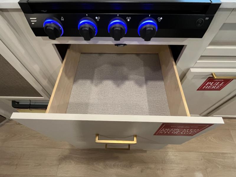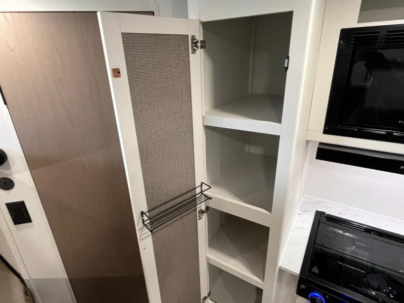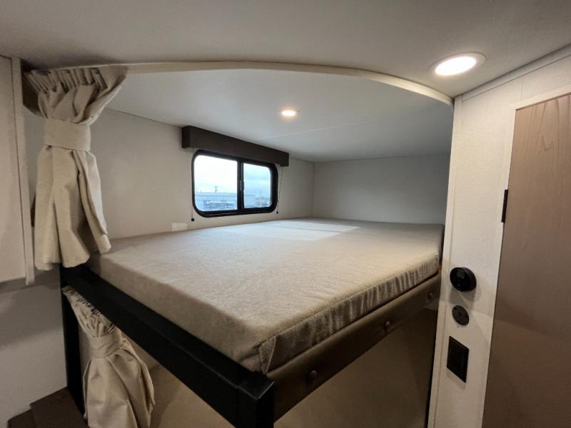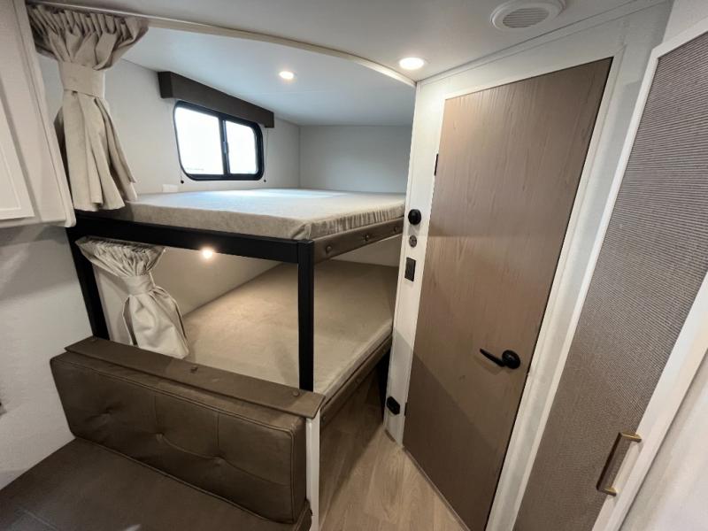 Camping trips are made complete in this travel trailer that can sleep seven each night! The little ones or your guest will love sleeping on the double-size bunks, while you take the queen bed in the front semi-private bedroom with a privacy curtain. A three-burner range and microwave oven will let you make meals each day, and a booth dinette provides a place to dine together. There are also convenient features found here, such as a pull-out pet dish and pull-out trash can, and there is ample storage space for your belongings. And a full bath will let you stay clean throughout your trip without having to leave your trailer!