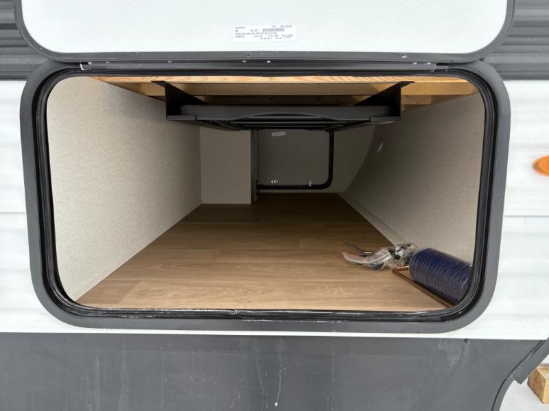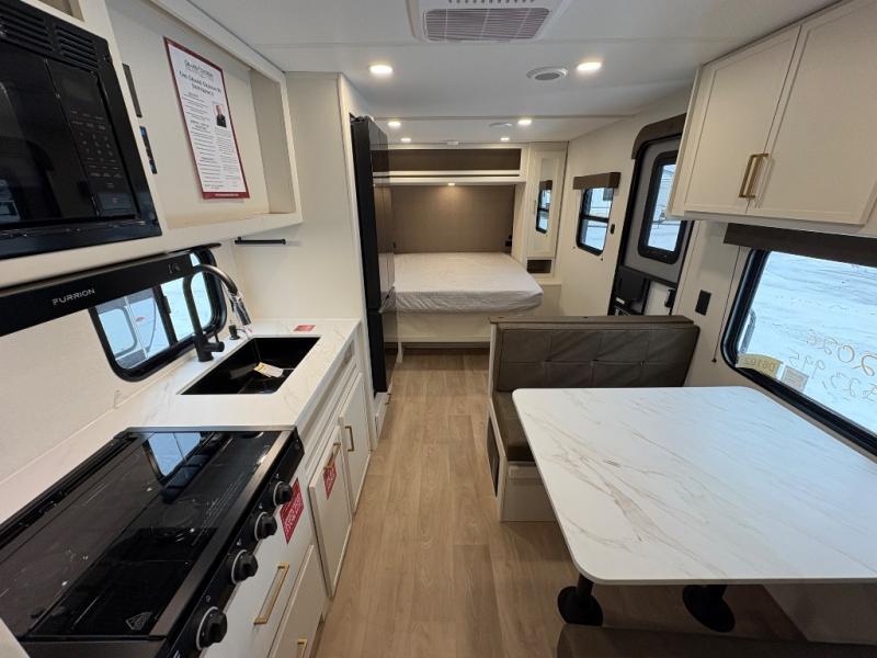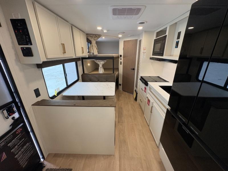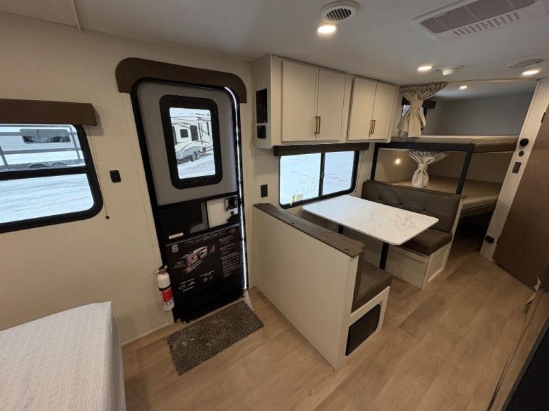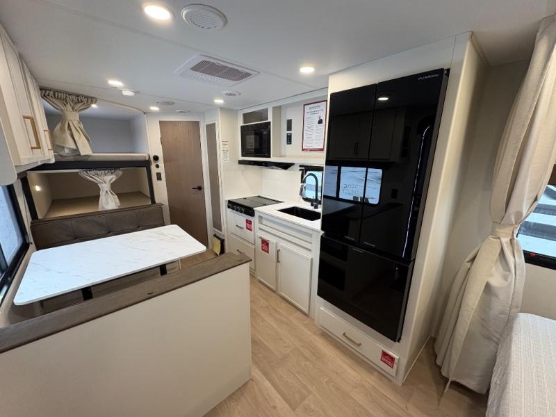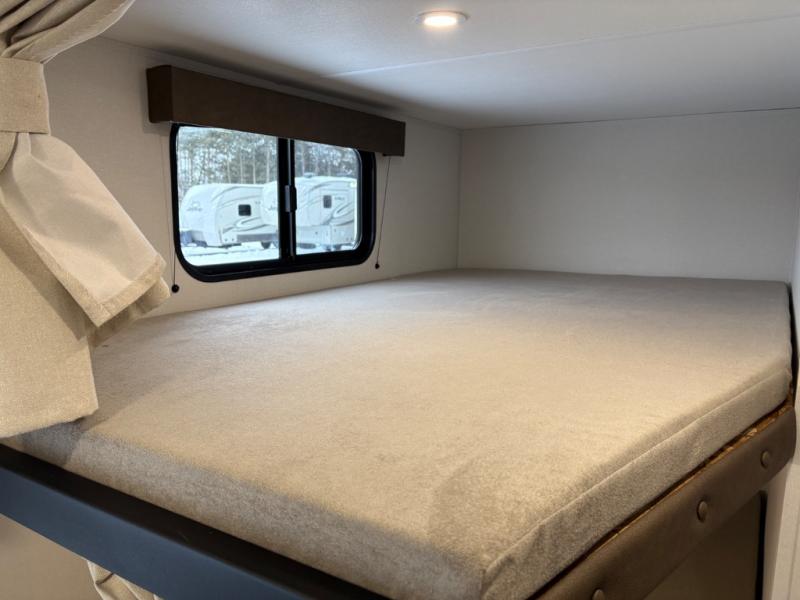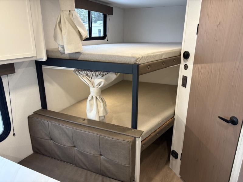 Camping trips are made complete in this travel trailer that can sleep seven each night! The little ones or your guest will love sleeping on the double-size bunks, while you take the queen bed in the front semi-private bedroom with a privacy curtain. A three-burner range and microwave oven will let you make meals each day, and a booth dinette provides a place to dine together. There are also convenient features found here, such as a pull-out pet dish and pull-out trash can, and there is ample storage space for your belongings. And a full bath will let you stay clean throughout your trip without having to leave your trailer!