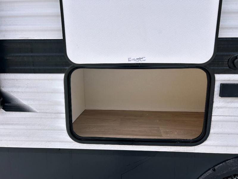 Camping trips are made complete in this travel trailer that can sleep seven each night! The little ones or your guest will love sleeping on the double-size bunks, while you take the queen bed in the front semi-private bedroom with a privacy curtain. A three-burner range and microwave oven will let you make meals each day, and a booth dinette provides a place to dine together. There are also convenient features found here, such as a pull-out pet dish and pull-out trash can, and there is ample storage space for your belongings. And a full bath will let you stay clean throughout your trip without having to leave your trailer!