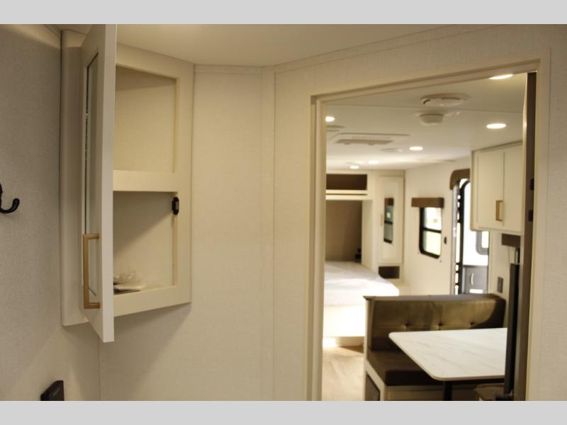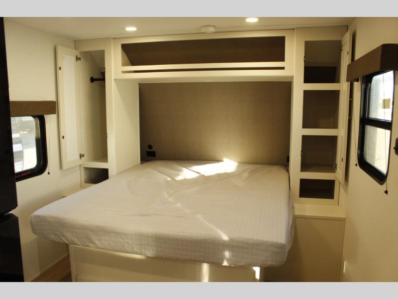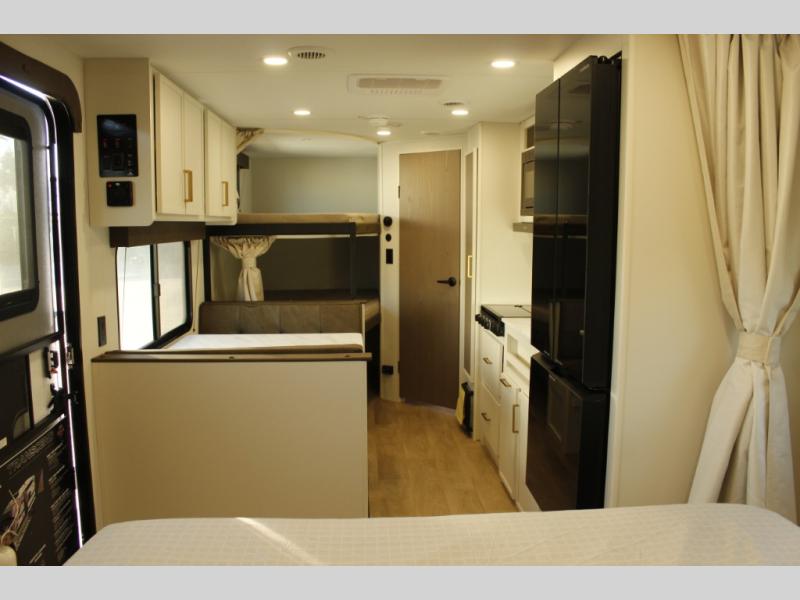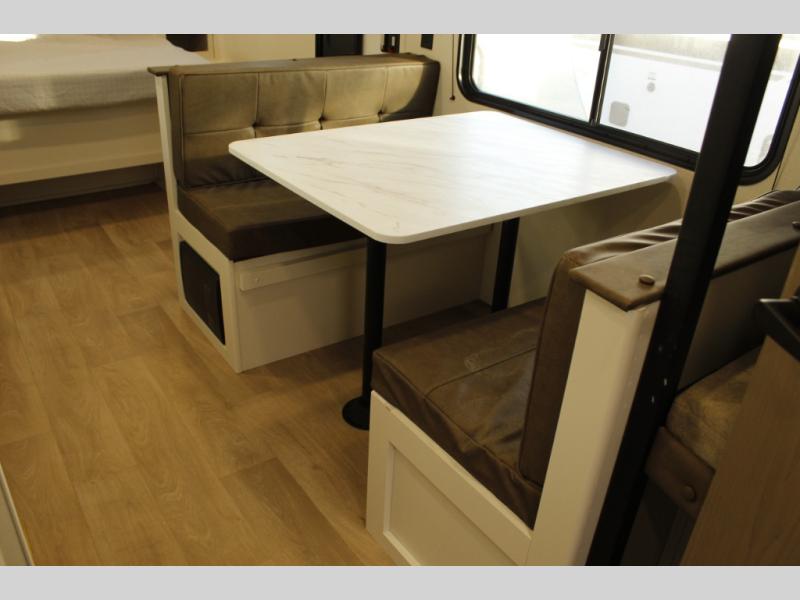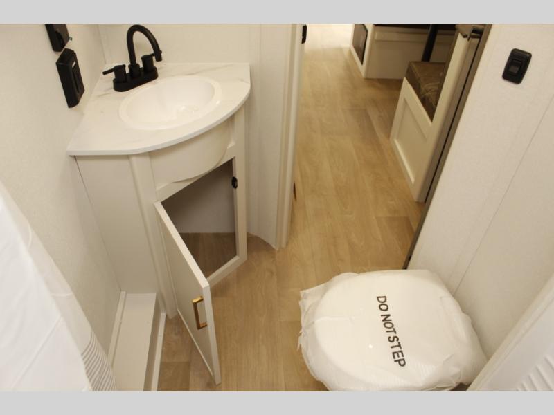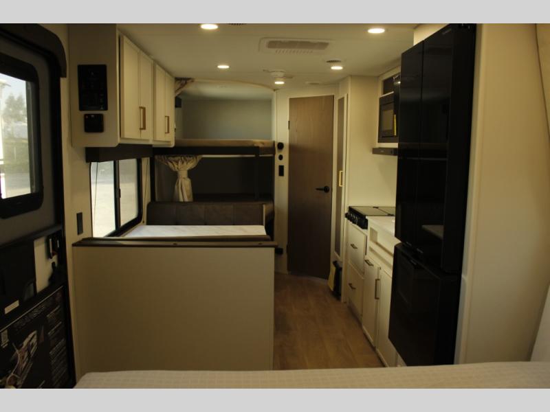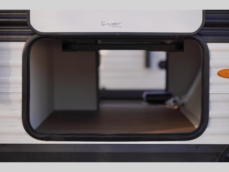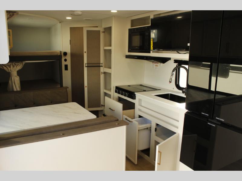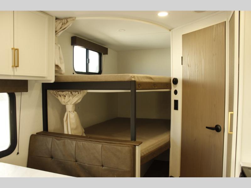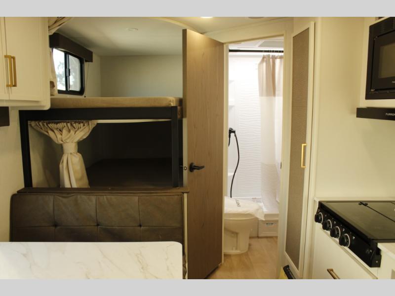 Camping trips are made complete in this travel trailer that can sleep seven each night! The little ones or your guest will love sleeping on the double-size bunks, while you take the queen bed in the front semi-private bedroom with a privacy curtain. A three-burner range and microwave oven will let you make meals each day, and a booth dinette provides a place to dine together. There are also convenient features found here, such as a pull-out pet dish and pull-out trash can, and there is ample storage space for your belongings. You will also appreciate the full bath that will let you stay clean throughout your trip without having to leave your trailer!