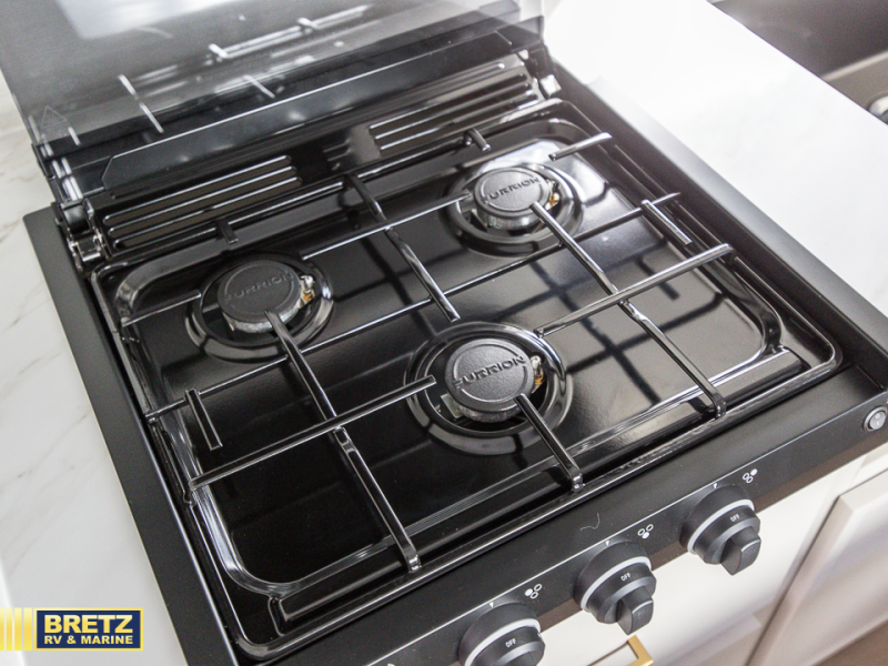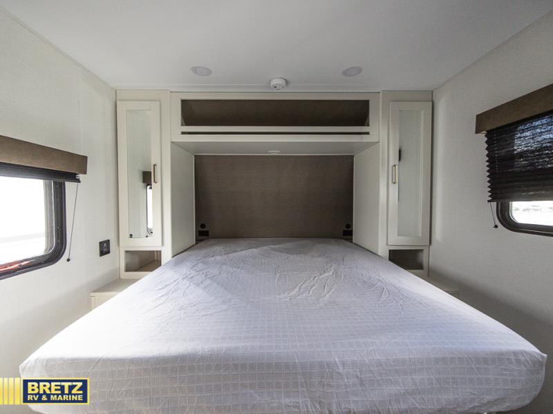 Camping trips are made complete in this travel trailer that can sleep seven each night! The little ones or your guest will love sleeping on the double-size bunks, while you take the queen bed in the front semi-private bedroom with a privacy curtain. A three-burner range and microwave oven will let you make meals each day, and a booth dinette provides a place to dine together. There are also convenient features found here, such as a pull-out pet dish and pull-out trash can, and there is ample storage space for your belongings. You will also appreciate the full bath that will let you stay clean throughout your trip without having to leave your trailer!