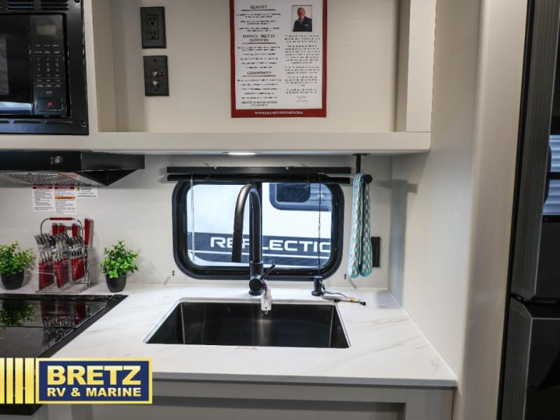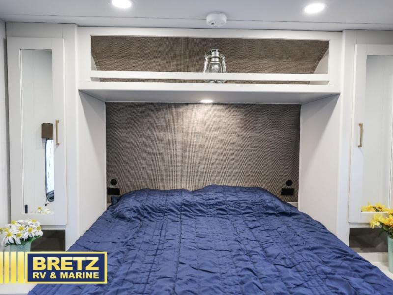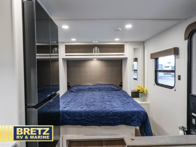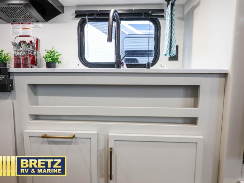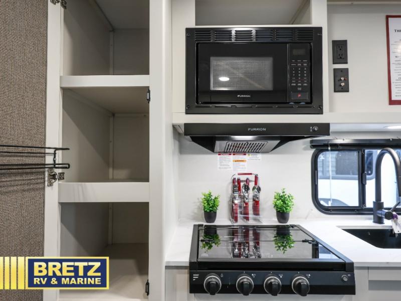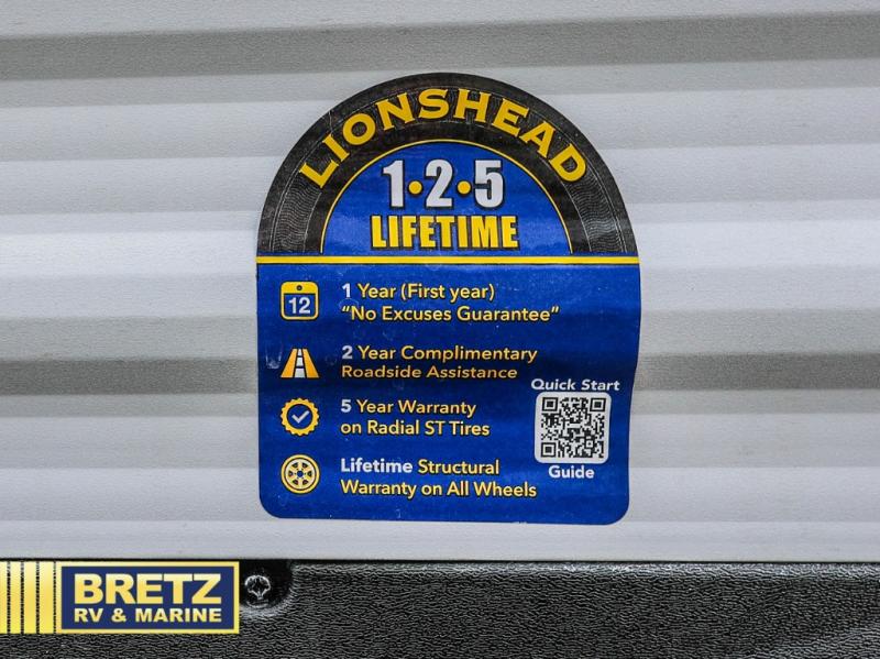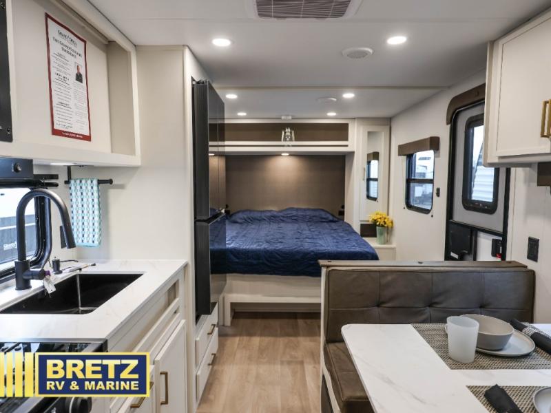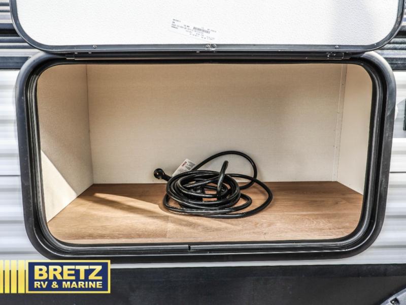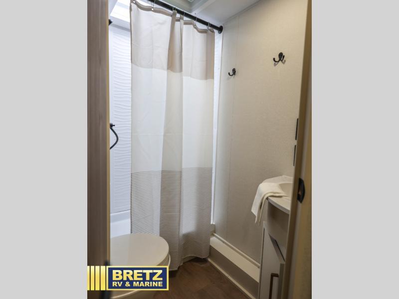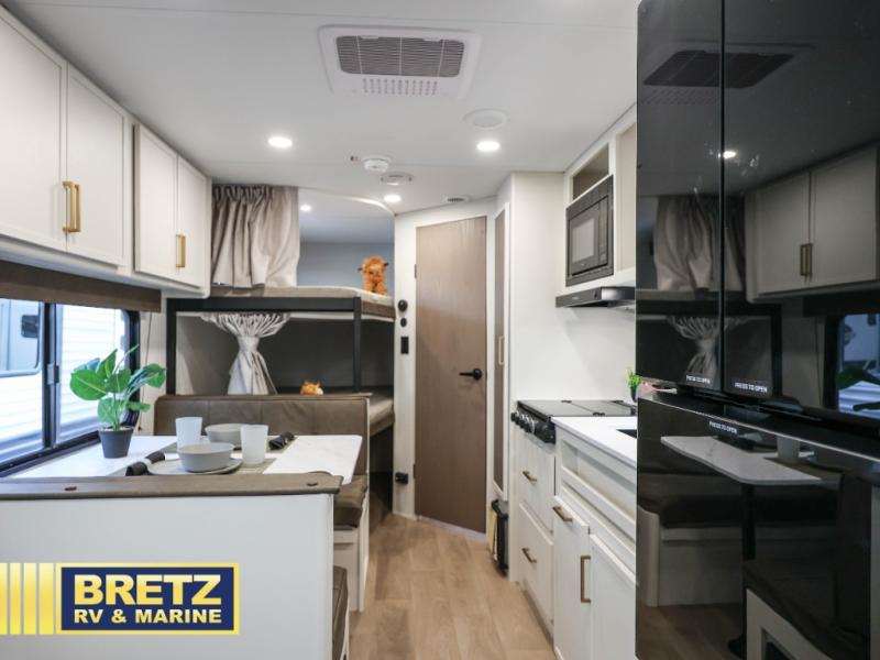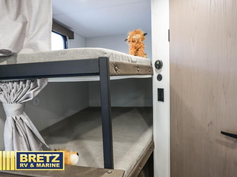 Camping trips are made complete in this travel trailer that can sleep seven each night! The little ones or your guest will love sleeping on the double-size bunks, while you take the queen bed in the front semi-private bedroom with a privacy curtain. A three-burner range and microwave oven will let you make meals each day, and a booth dinette provides a place to dine together. There are also convenient features found here, such as a pull-out pet dish and pull-out trash can, and there is ample storage space for your belongings. You will also appreciate the full bath that will let you stay clean throughout your trip without having to leave your trailer!