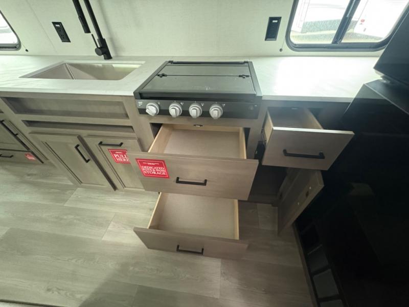 The only thing you need to worry about when you go camping is where to park this Transcend Xplor travel trailer! You'll have everything you need each day to prepare meals, including a three-burner cooktop, a microwave oven, and plenty of counter space. The front queen bed includes overhead cabinets for your books, plus underbed storage for shoes! Choose the optional theater seats in place of the dinette, and you won't even know you're away from home!