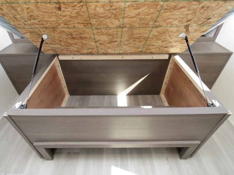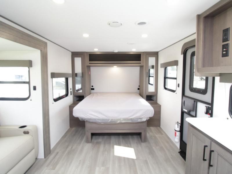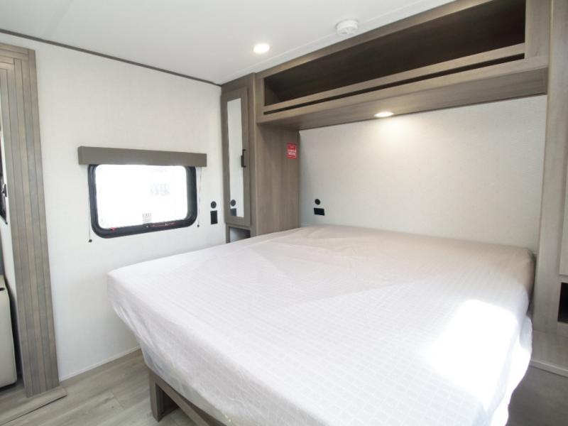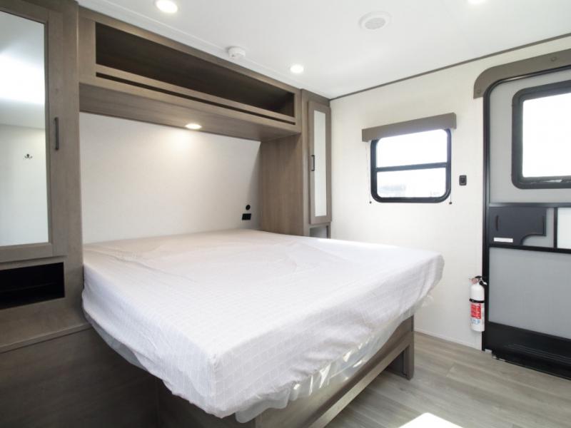 Front Queen Bed – Includes overhead cabinets and underbed storage for extra space.