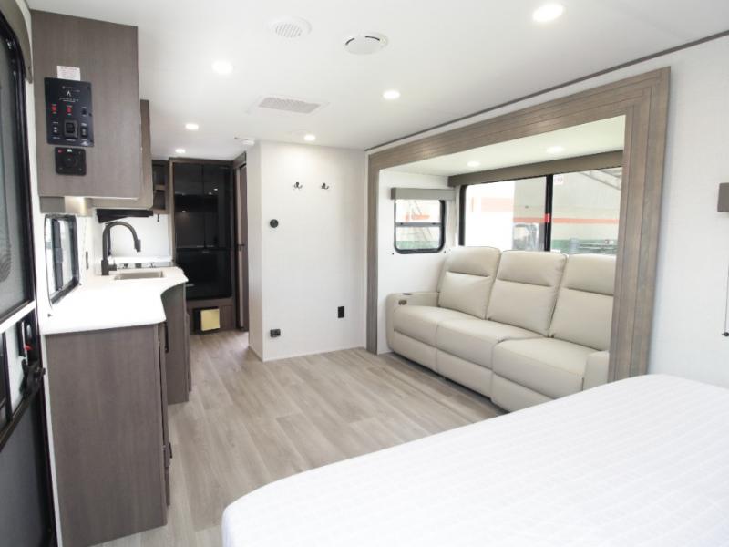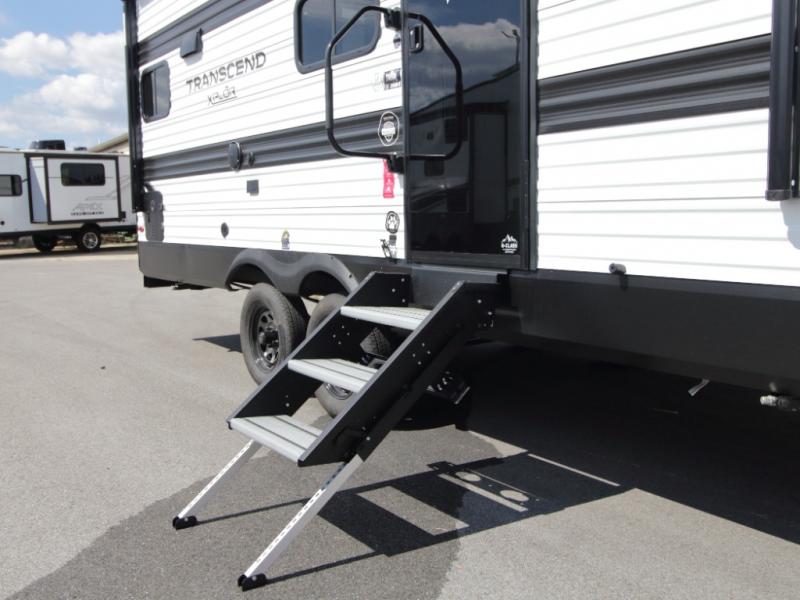 The Transcend Xplor series is designed with durability and smart features to make every trip easier. A power tongue jack simplifies setup, while the all-in-one utility center and detachable power cord with LED light provide added convenience. Inside, residential furniture, solid countertops, and premium cabinetry create a warm, inviting feel. Plus, USB charging ports and a JBL exterior speaker keep you connected and entertained.